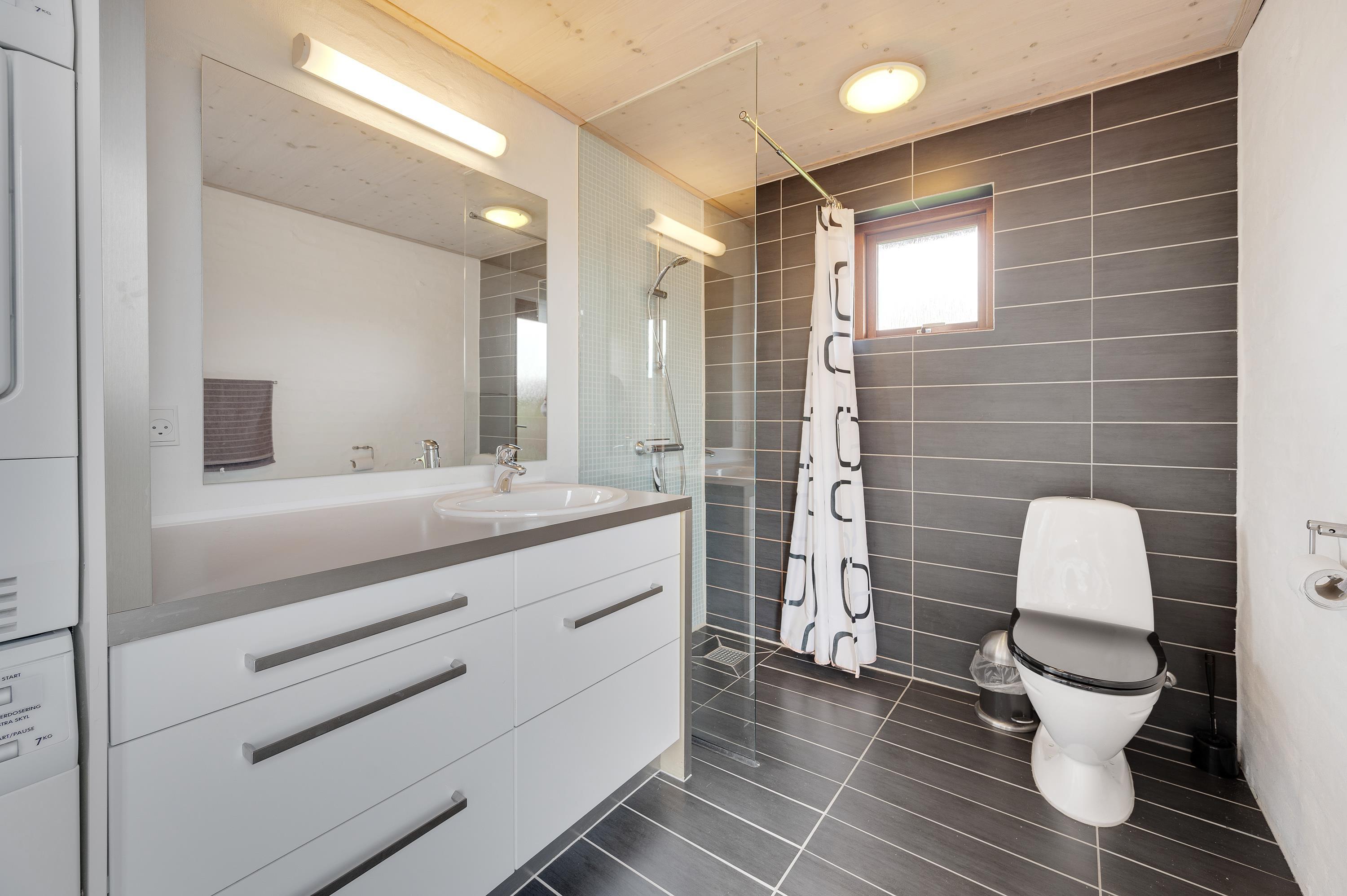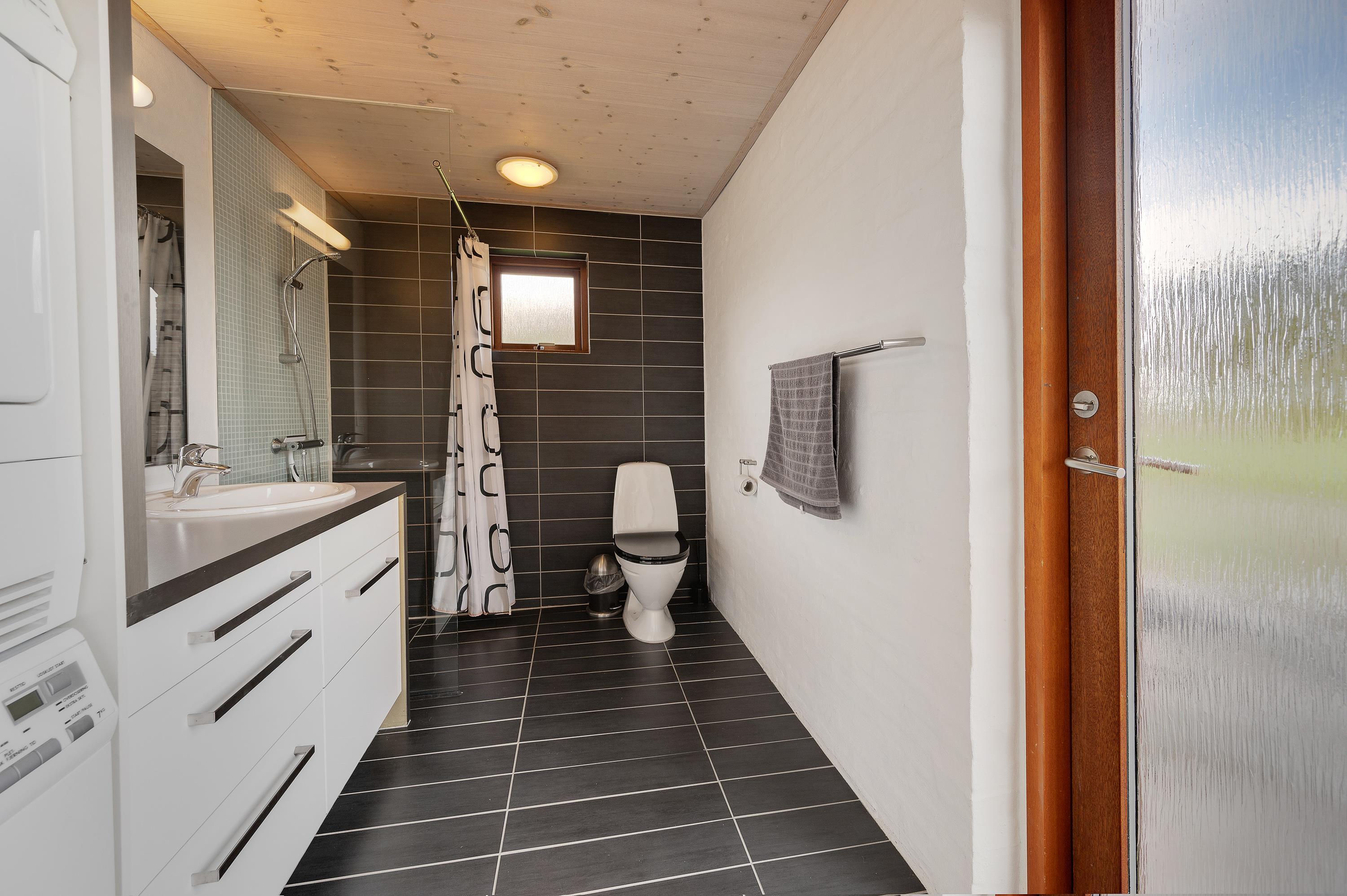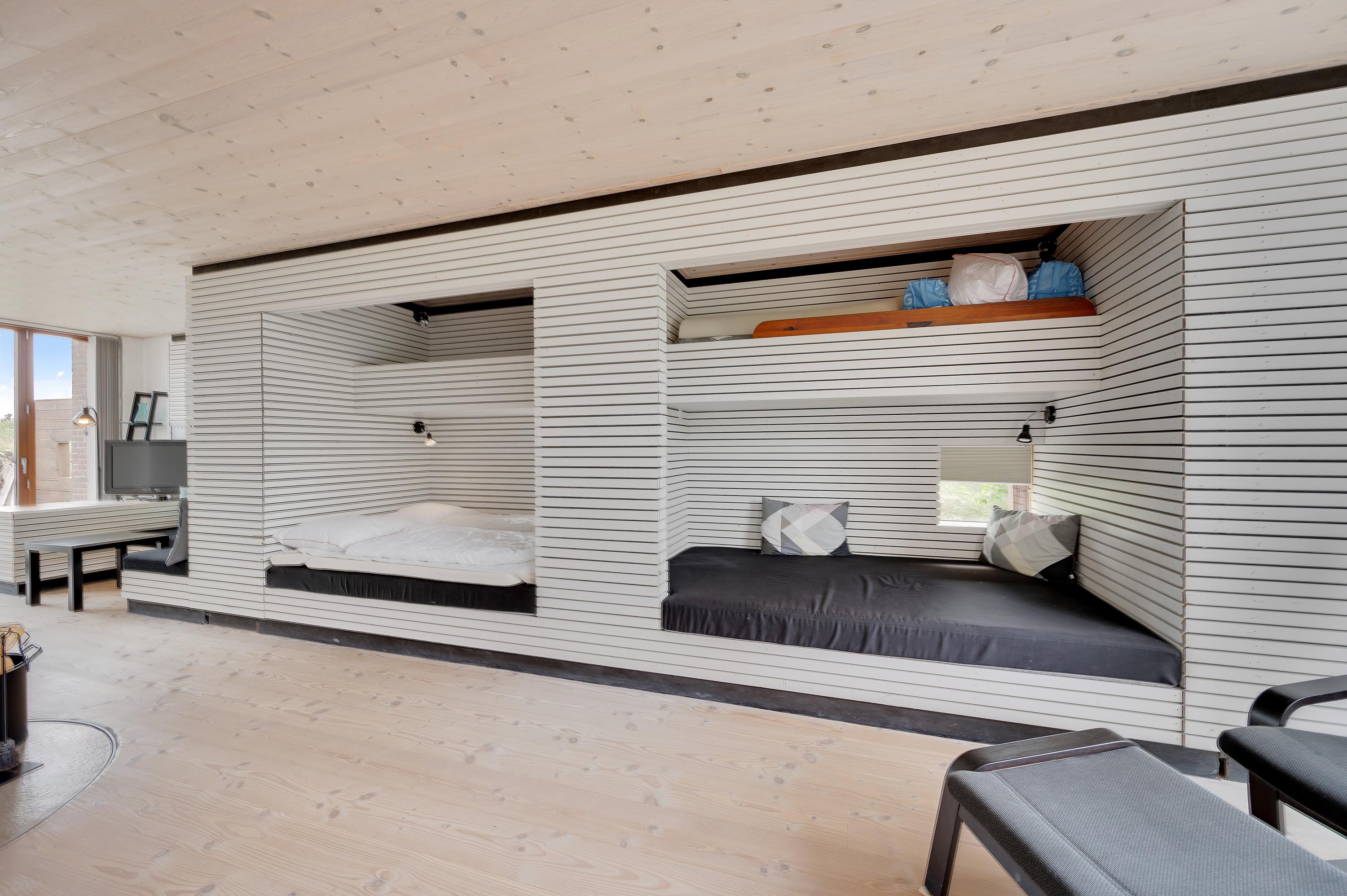 Mod øst er der et hyggeligt sofahjørne med fladskærms-tv med Allente, dog er der ikke noget internet i feriehuset. Herfra har I direkte udgang til den østvendte morgenterrasse og den kuperede naturgrund. I det store alrum mod vest er køkken, spiseplads og sovealkover samlet. I kan åbne hele det store vinduesparti op, således I kan træde ud på terrassen og nyde en ildrød solnedgang.