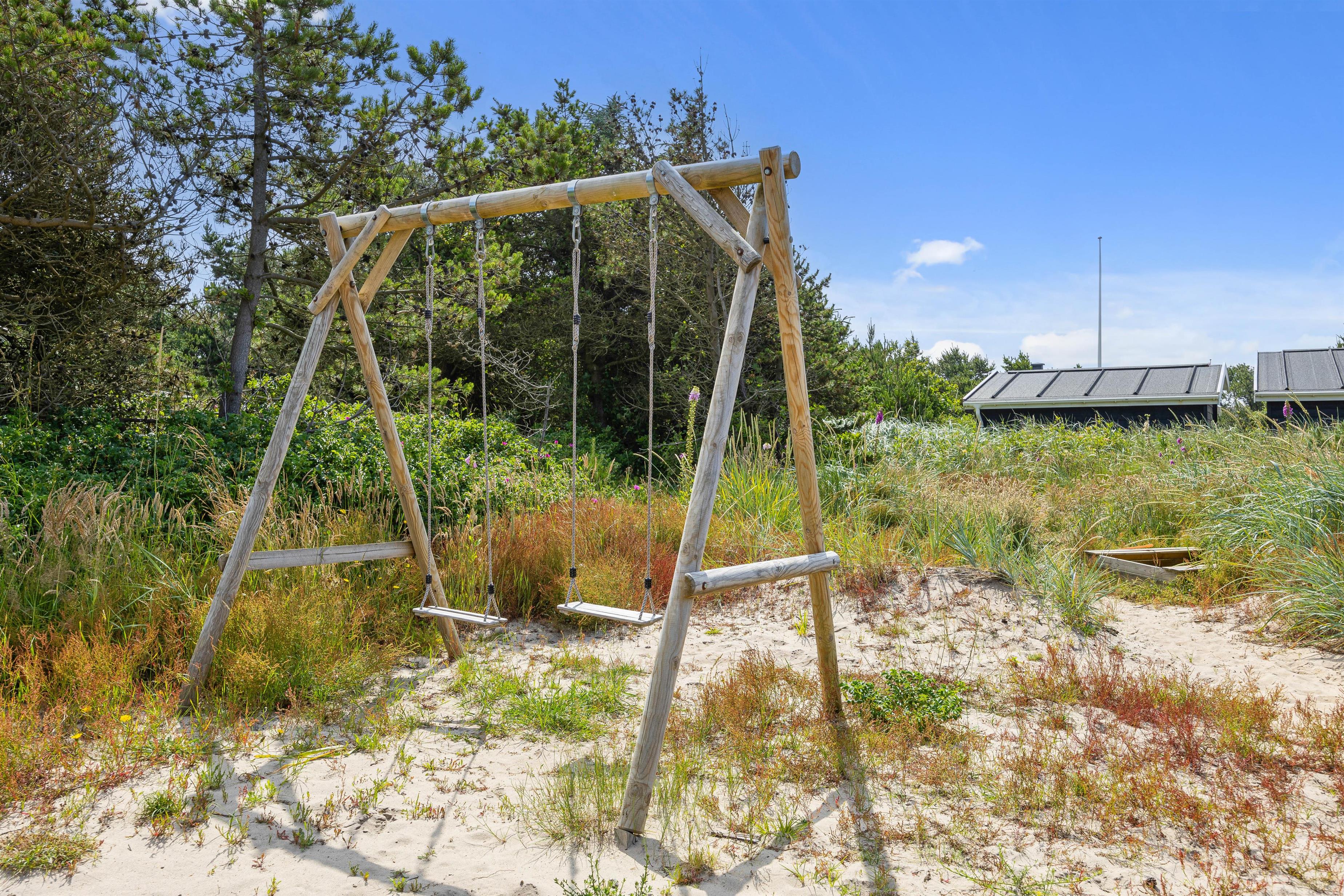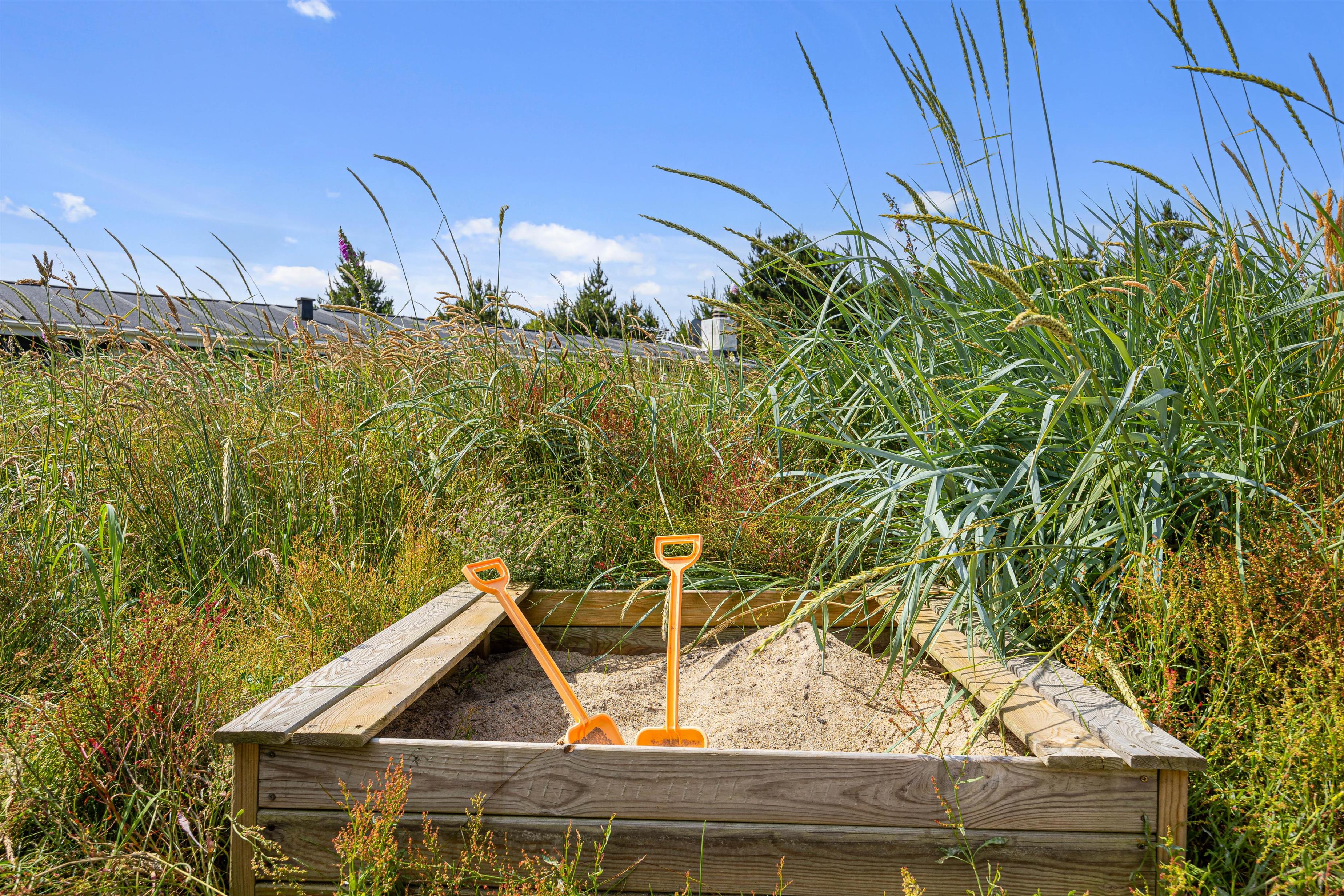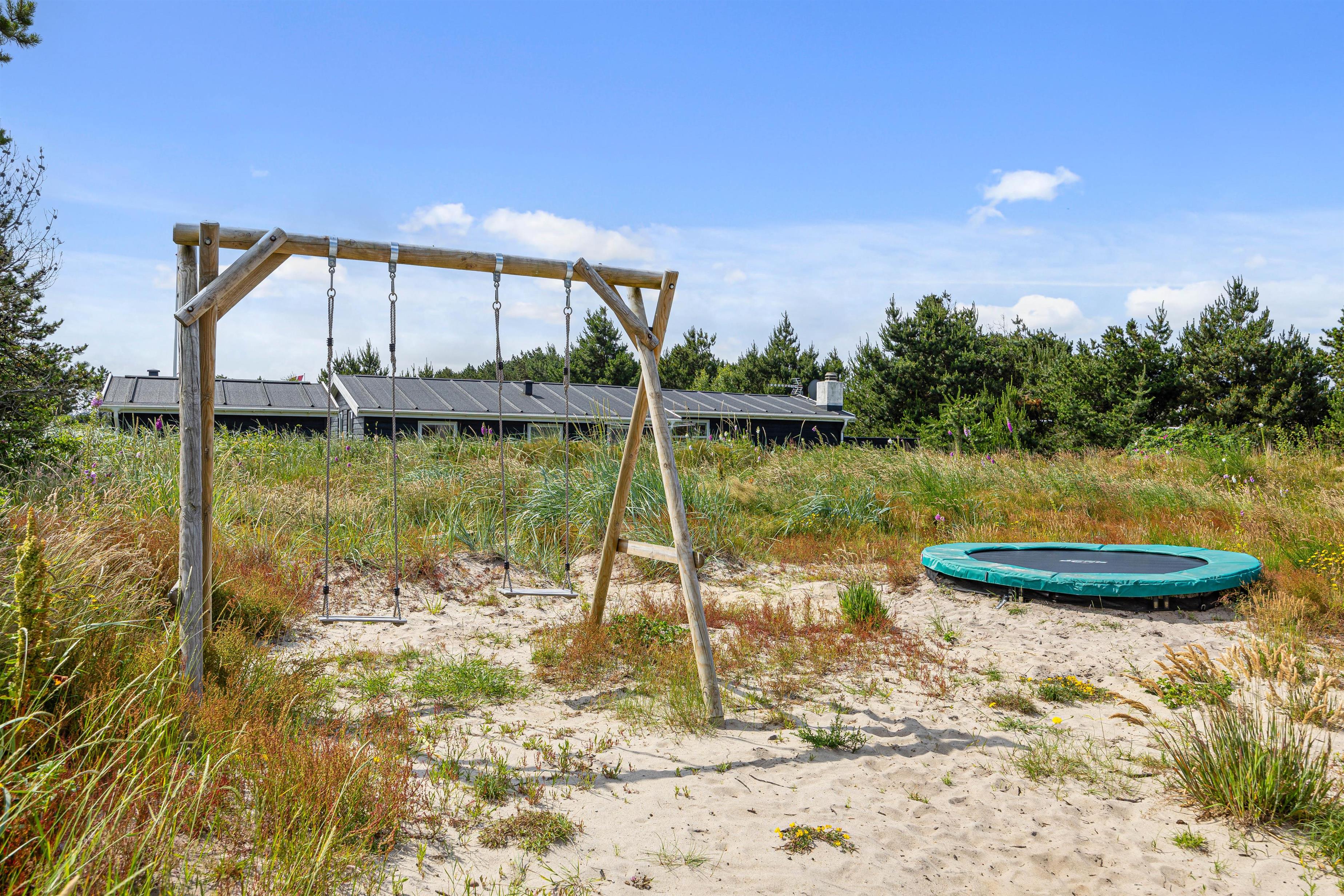Når I træder uden for sommerhuset, bliver I mødt af et lækkert udeareal med skønt terrasseområde, udstyret med både havemøbler og liggestole. Ydermere finder I sandkasse, trampolin, gynge og legehus, der giver børnene mulighed for rigtig at få brændt krudt af, hvor det kun er fantasien der sætter grænser. Imens nogen står for tilberedning af et lækkert aftensmåltid på gasgrillen, kan andre nyde godt af den varme og boblende udespa.