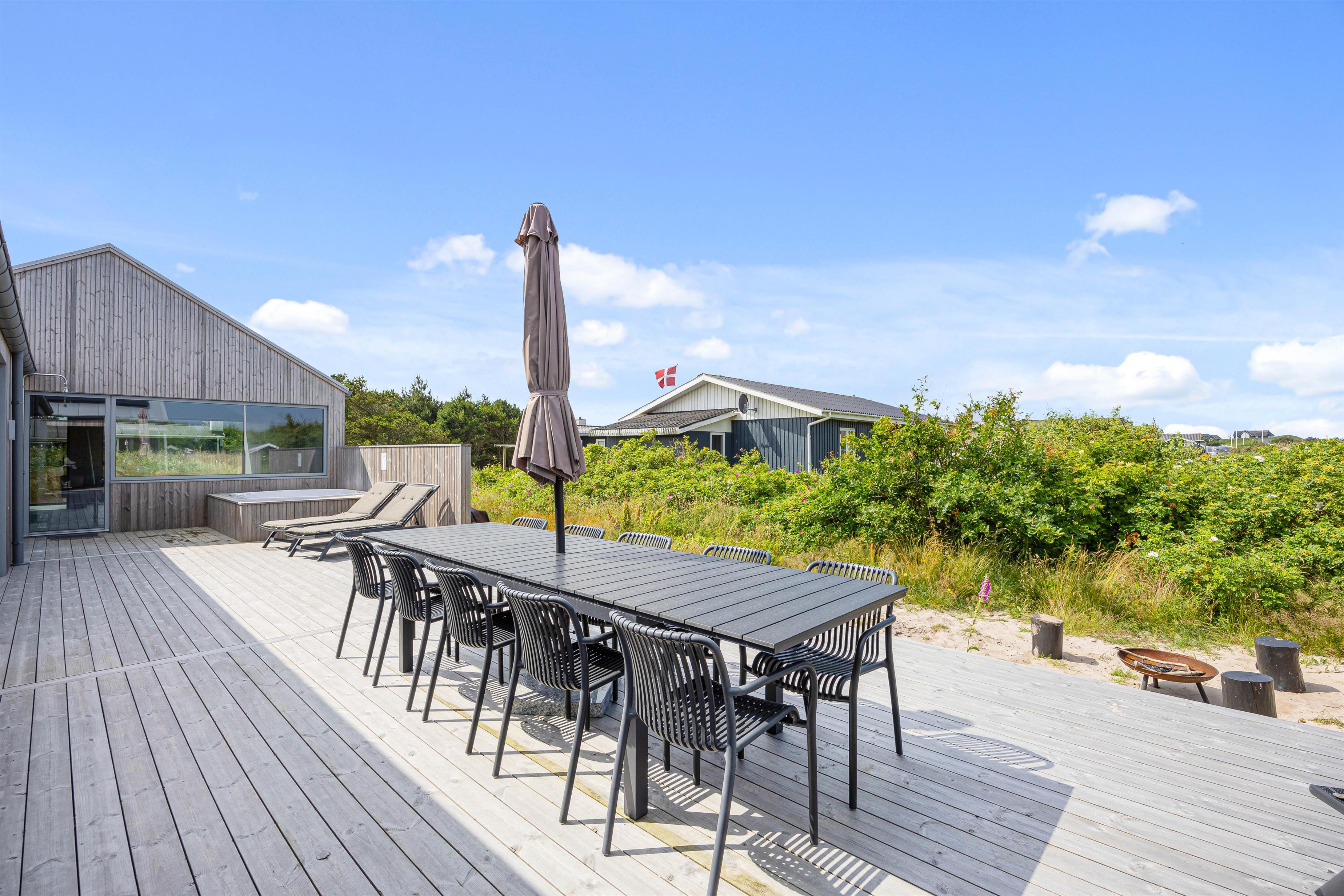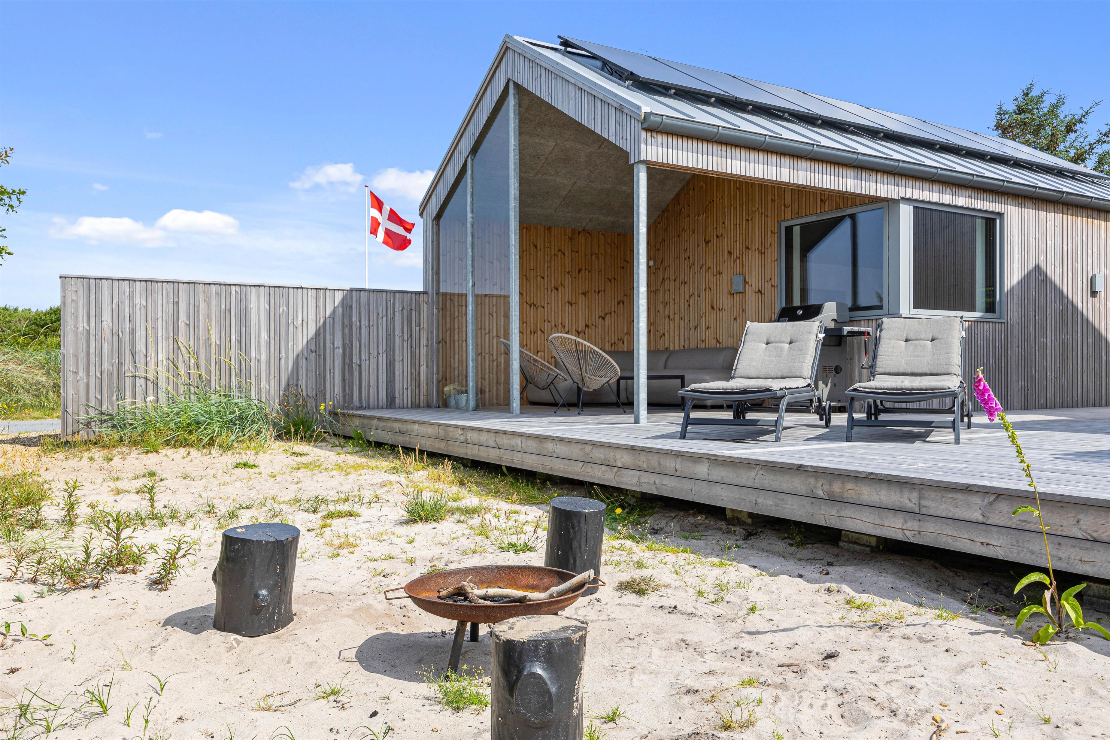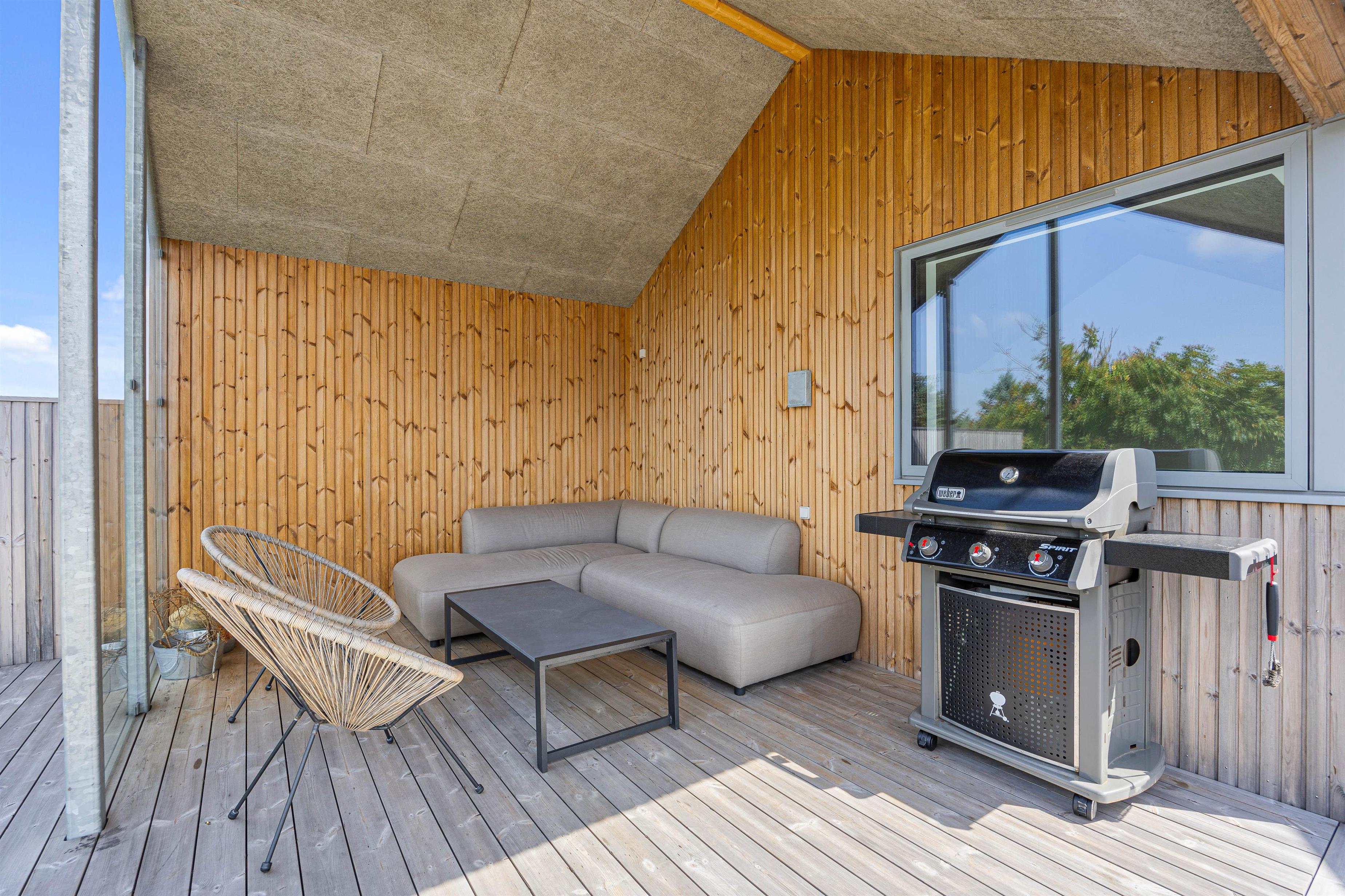 Når I træder uden for sommerhuset, bliver I mødt af et lækkert udeareal med skønt terrasseområde, udstyret med både havemøbler og liggestole. Ydermere finder I sandkasse, trampolin, gynge og legehus, der giver børnene mulighed for rigtig at få brændt krudt af, hvor det kun er fantasien der sætter grænser. Imens nogen står for tilberedning af et lækkert aftensmåltid på gasgrillen, kan andre nyde godt af den varme og boblende udespa.