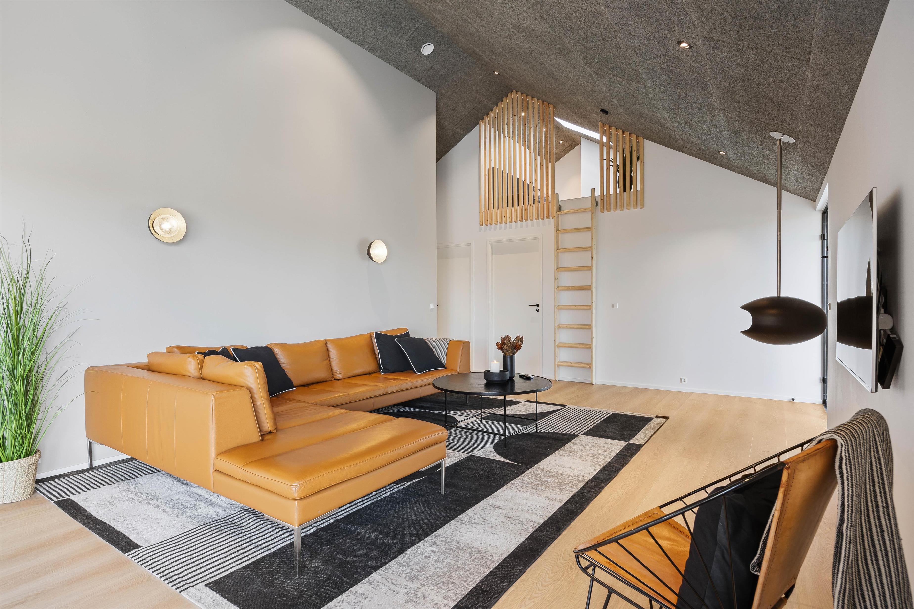 Stilfuld, moderne, lys og indbydende indretning med pejseindsats