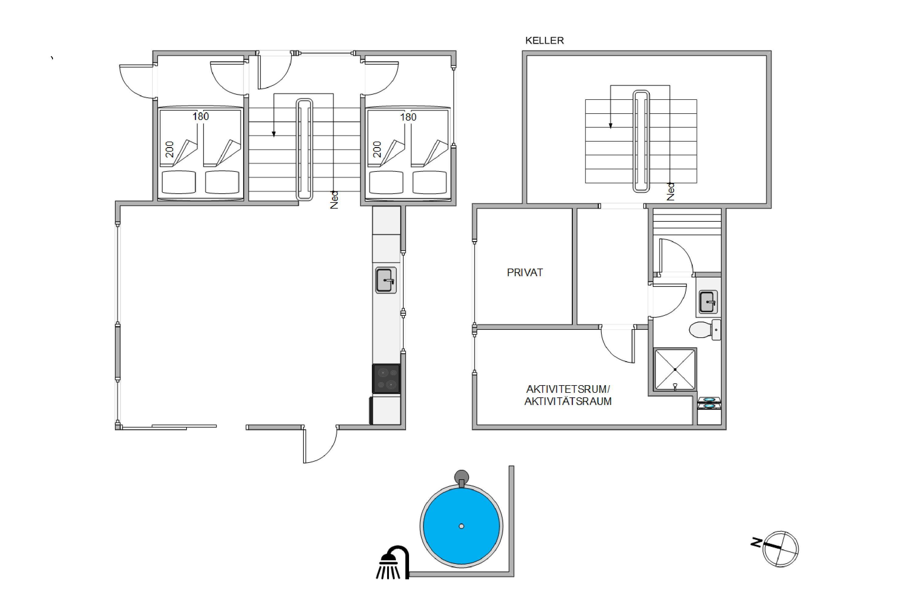 Der er to soverum i stueplan, begge med dobbeltsenge. I kælderen i aktivitetrummet er der en sovesofa, der udgør den sidste soveplads.
