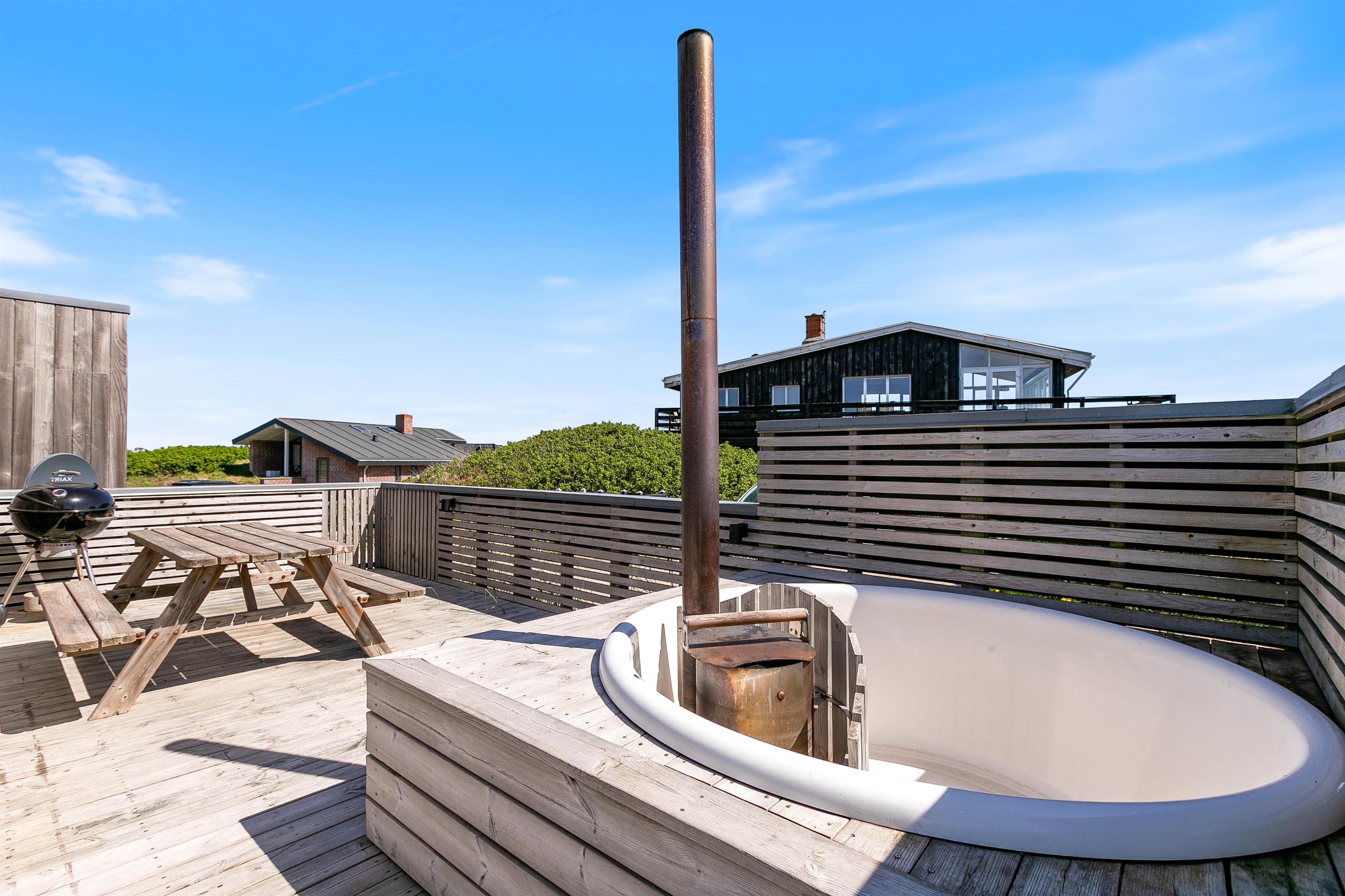 Feriehuset har en skøn terrasse, der både er afskærmet og lukket. Her er der altid læ at finde, og I kan nyde de varme sommerdage og den flotte natur, mens I slapper af på liggestolene, får en kold drink ved havebordet eller hygger i vildmarksbadets varme vand. Ved siden af vildmarksbadet, finder i feriehusets udebruser, som er åben fra april-november.