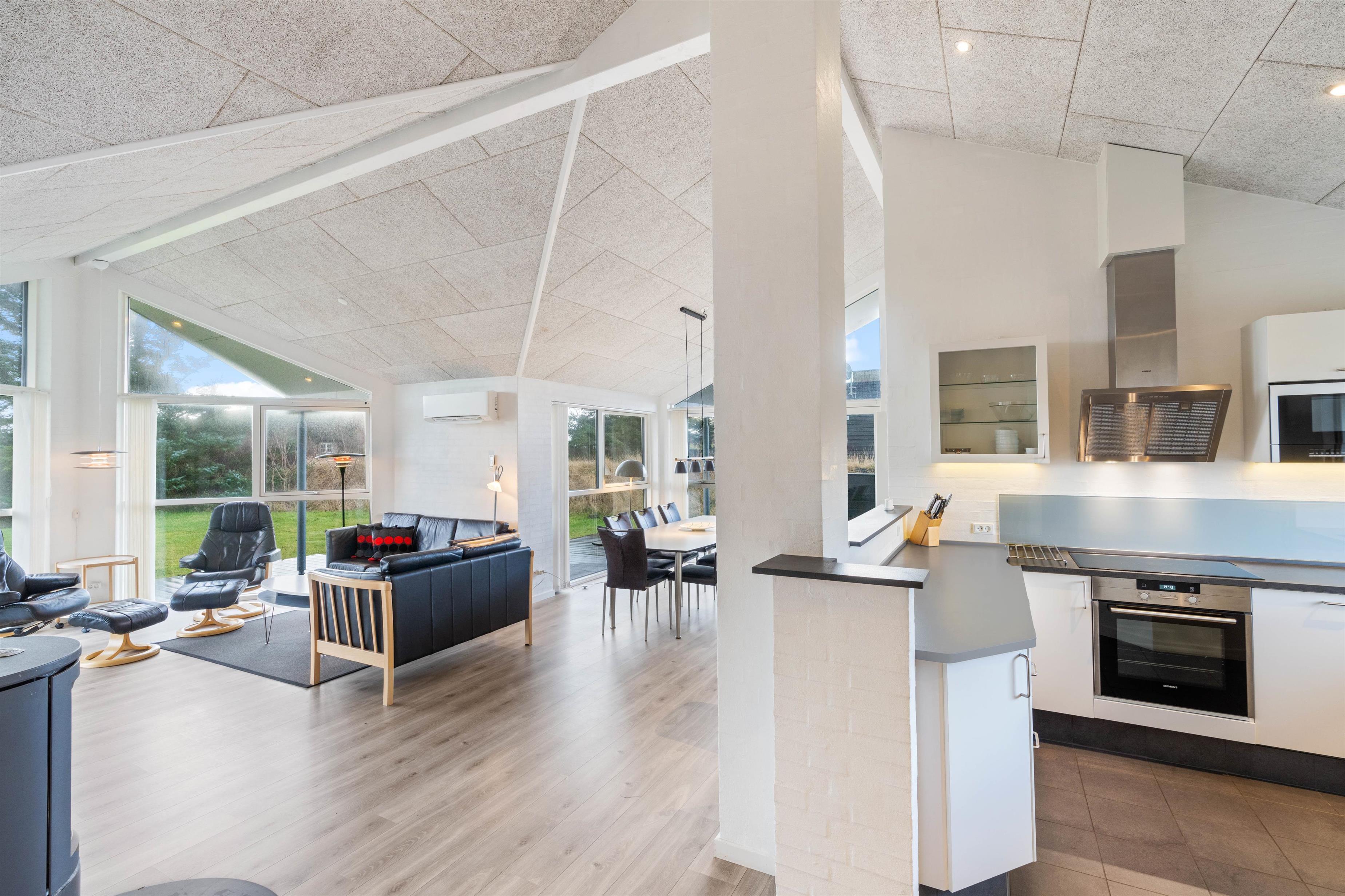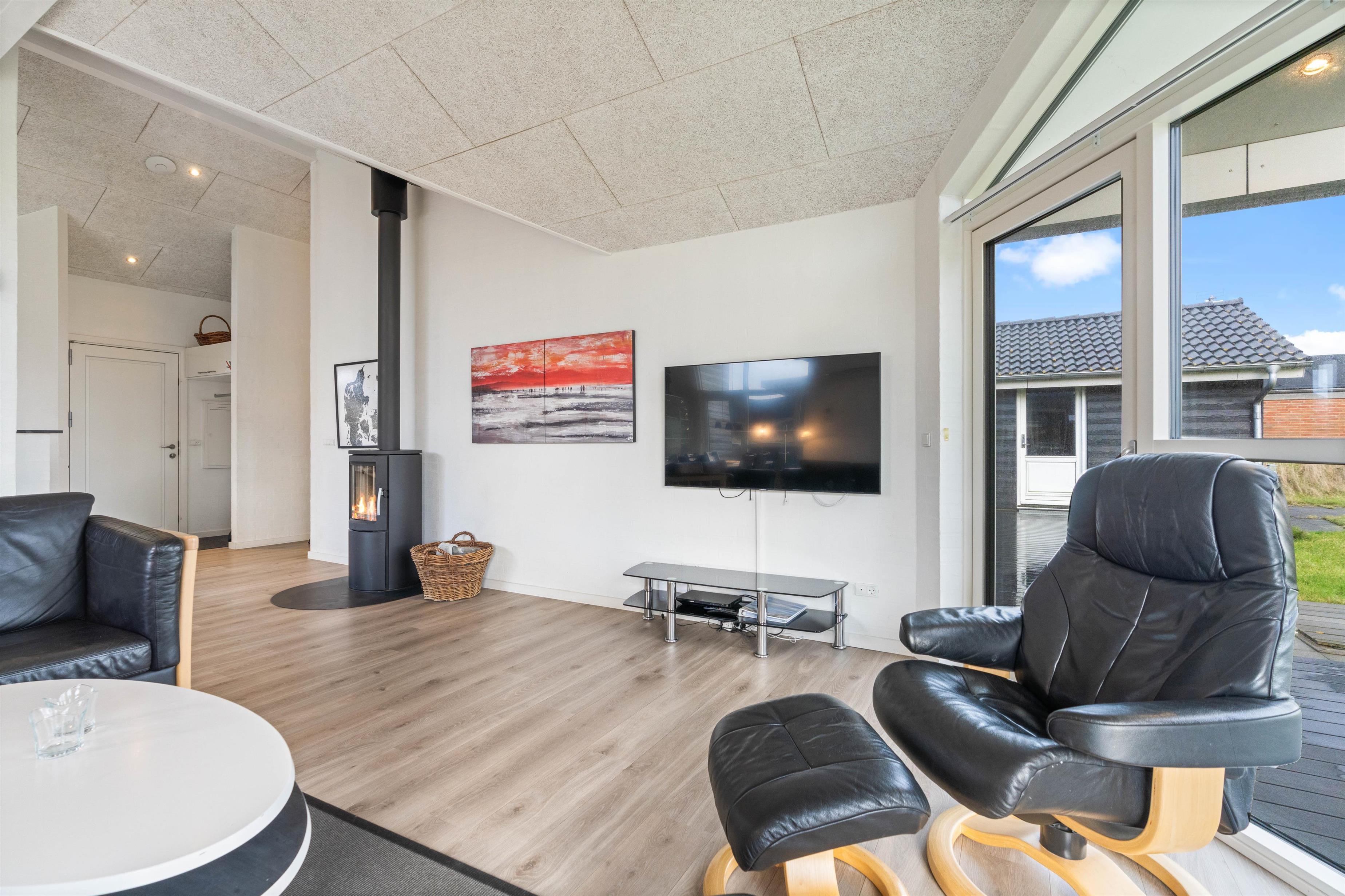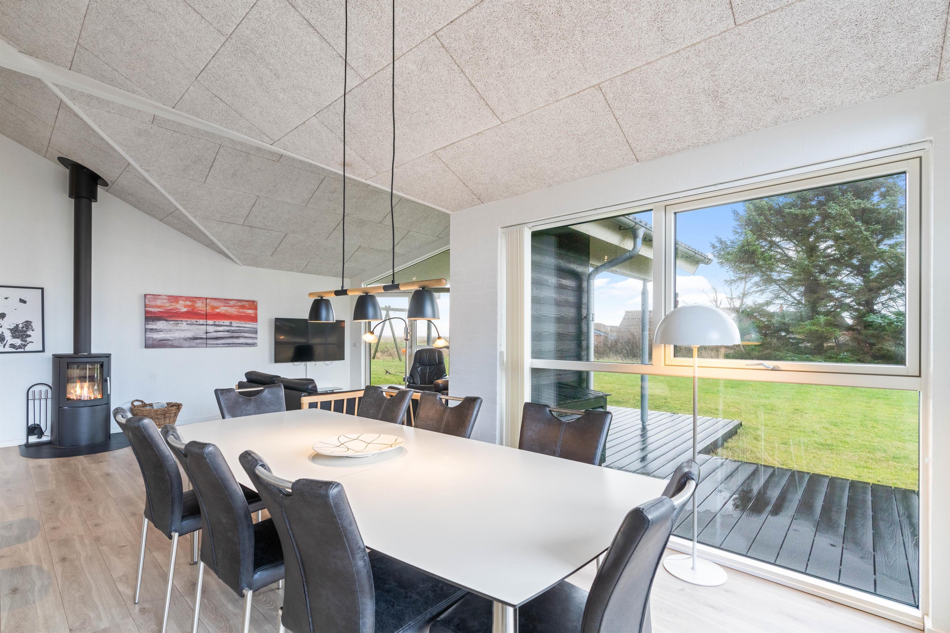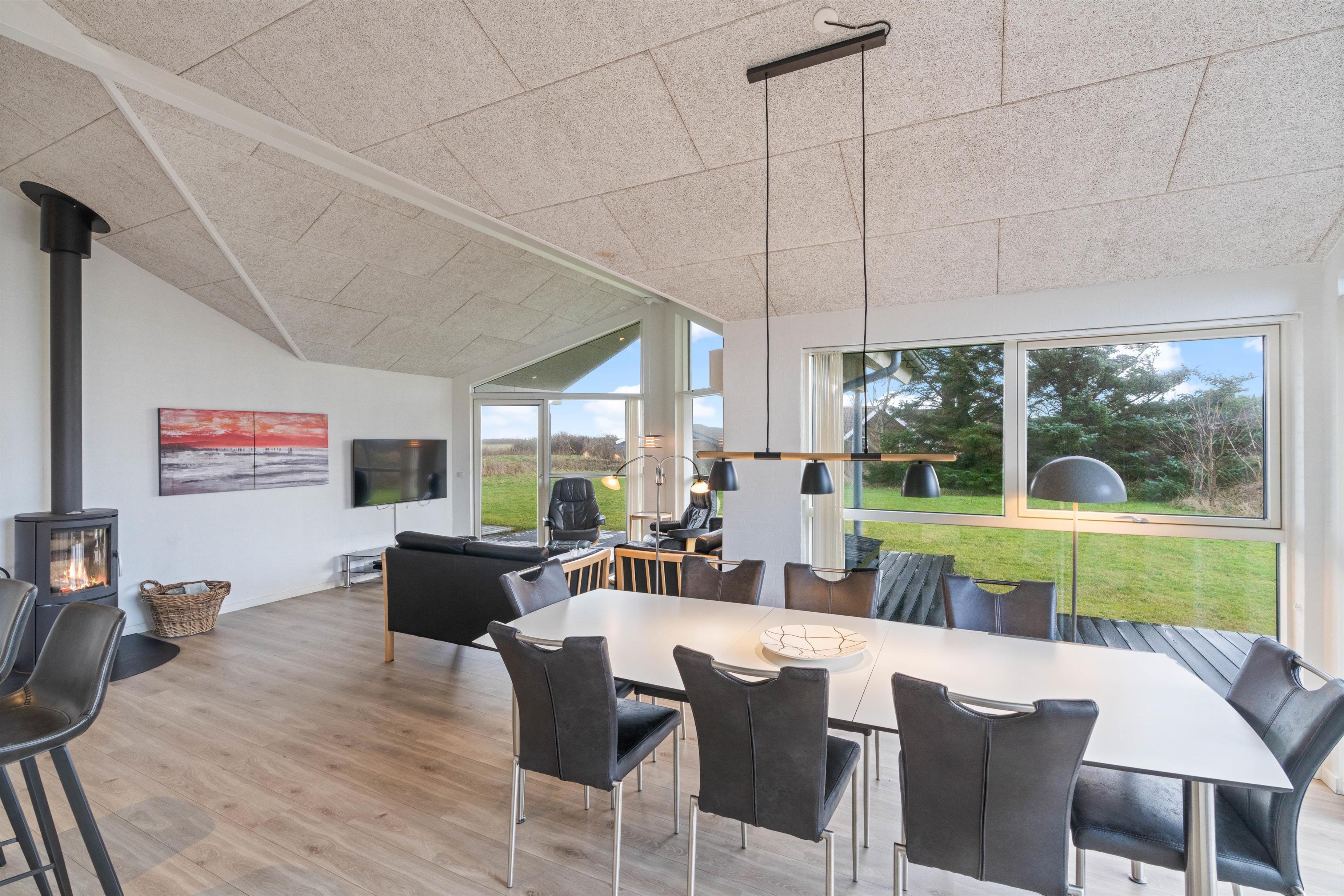 Sommerhusets hjerte er den store opholdstue, hvor køkkenet og spiseafdeling ligger i åben forbindelse. Stuen er indrettet med store vinduespartier, som sørger for et godt lysindfald og ikke mindst en smuk udsigt til den vestjyske natur. Her kan familien samles efter en god dag og nyde hinanden samvær foran brændeovnens varme. Dertil er der hurtigt 100/100 MBit bredbåndsforbindelse, som I kan bruge til at streame en god film på sommerhusets fladskærms-tv.