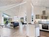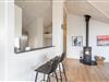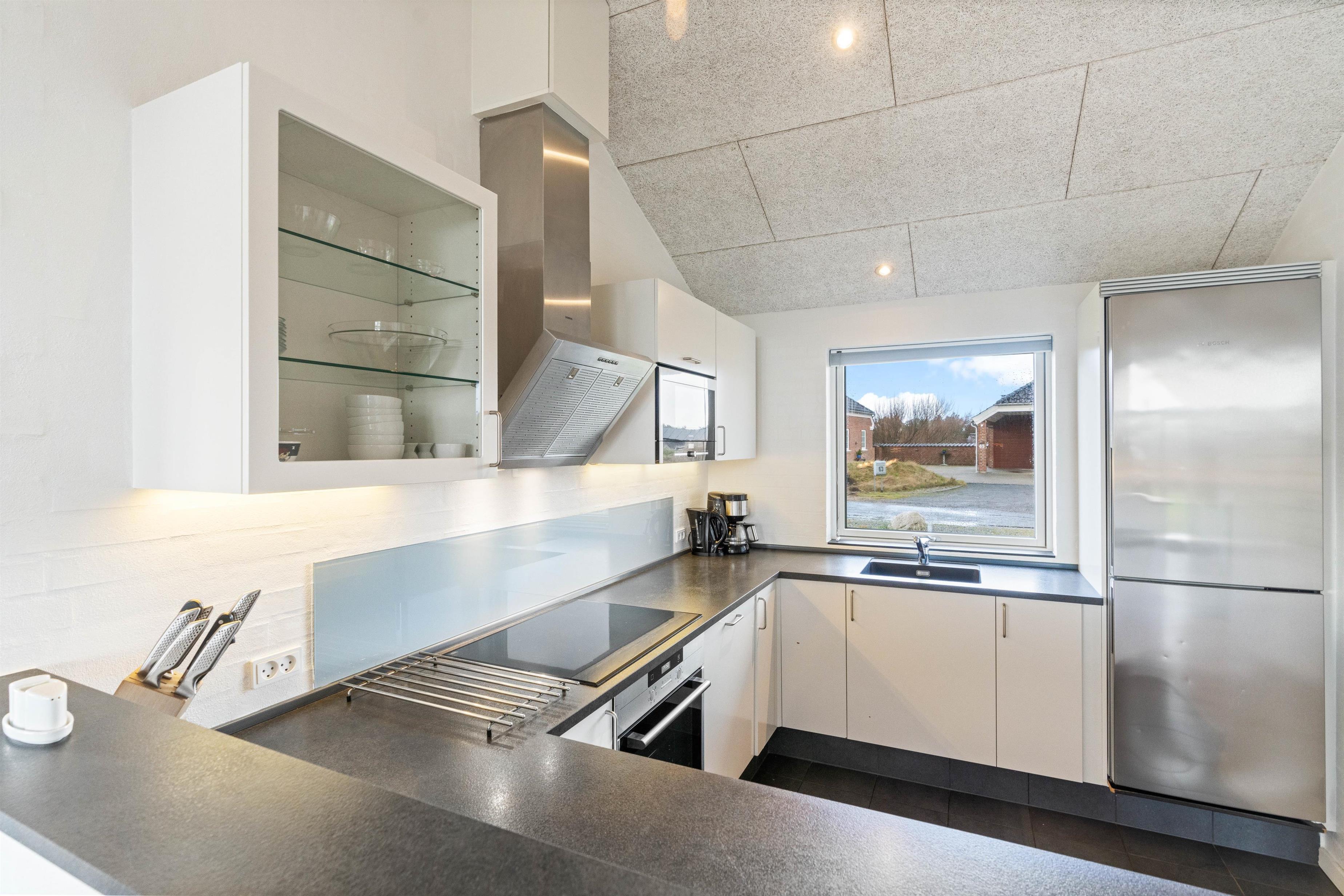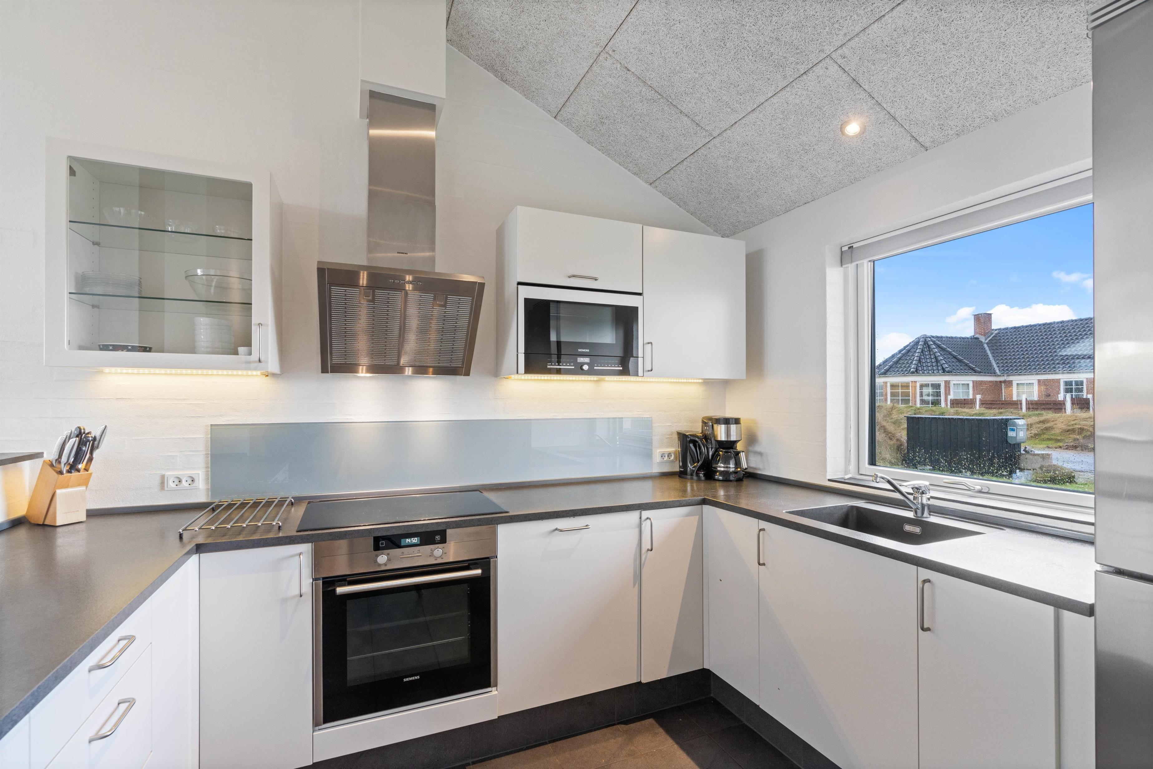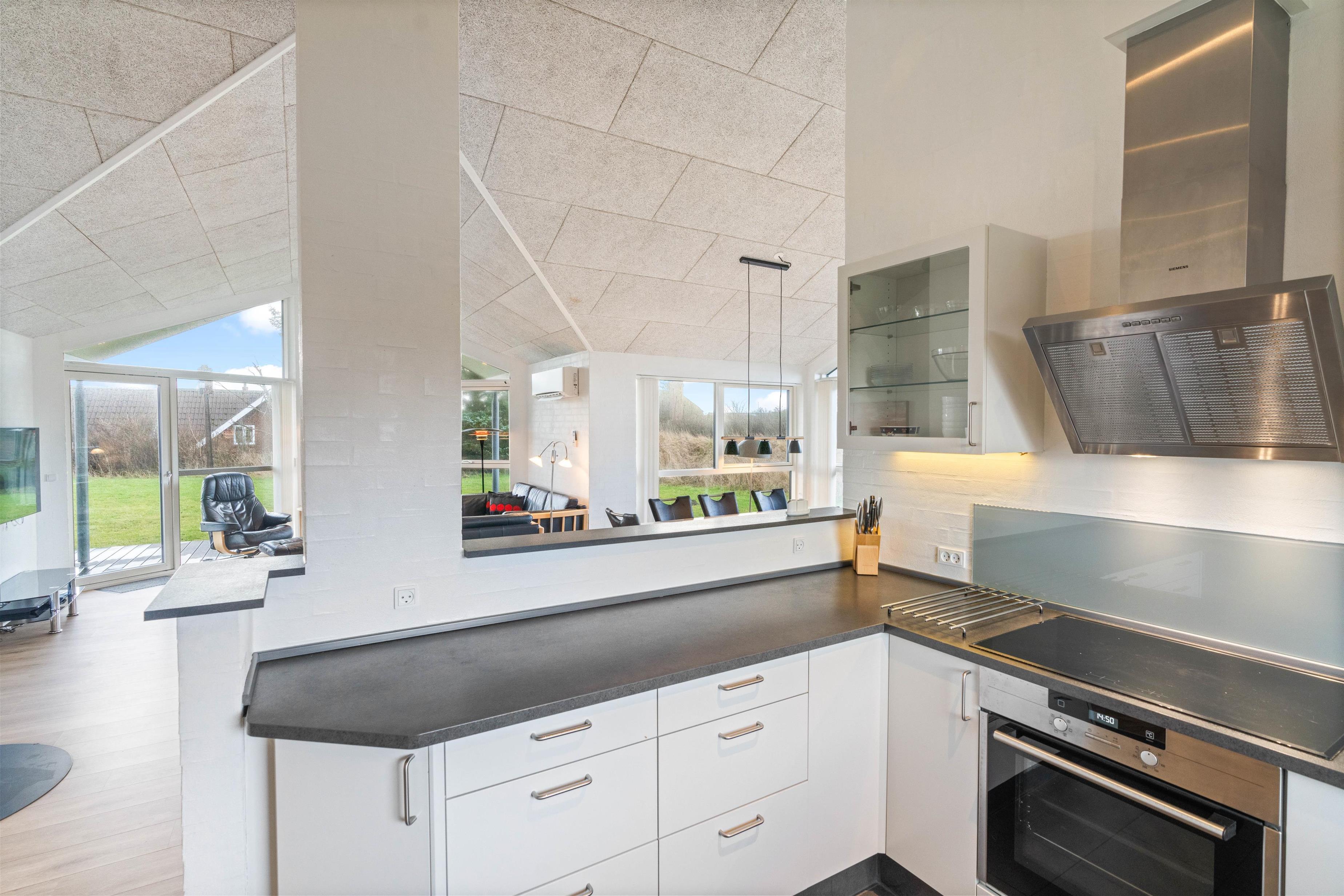 Sommerhusets hjerte er den store opholdstue, hvor køkkenet og spiseafdeling ligger i åben forbindelse. Stuen er indrettet med store vinduespartier, som sørger for et godt lysindfald og ikke mindst en smuk udsigt til den vestjyske natur. Her kan familien samles efter en god dag og nyde hinanden samvær foran brændeovnens varme. Dertil er der hurtigt 100/100 MBit bredbåndsforbindelse, som I kan bruge til at streame en god film på sommerhusets fladskærms-tv.