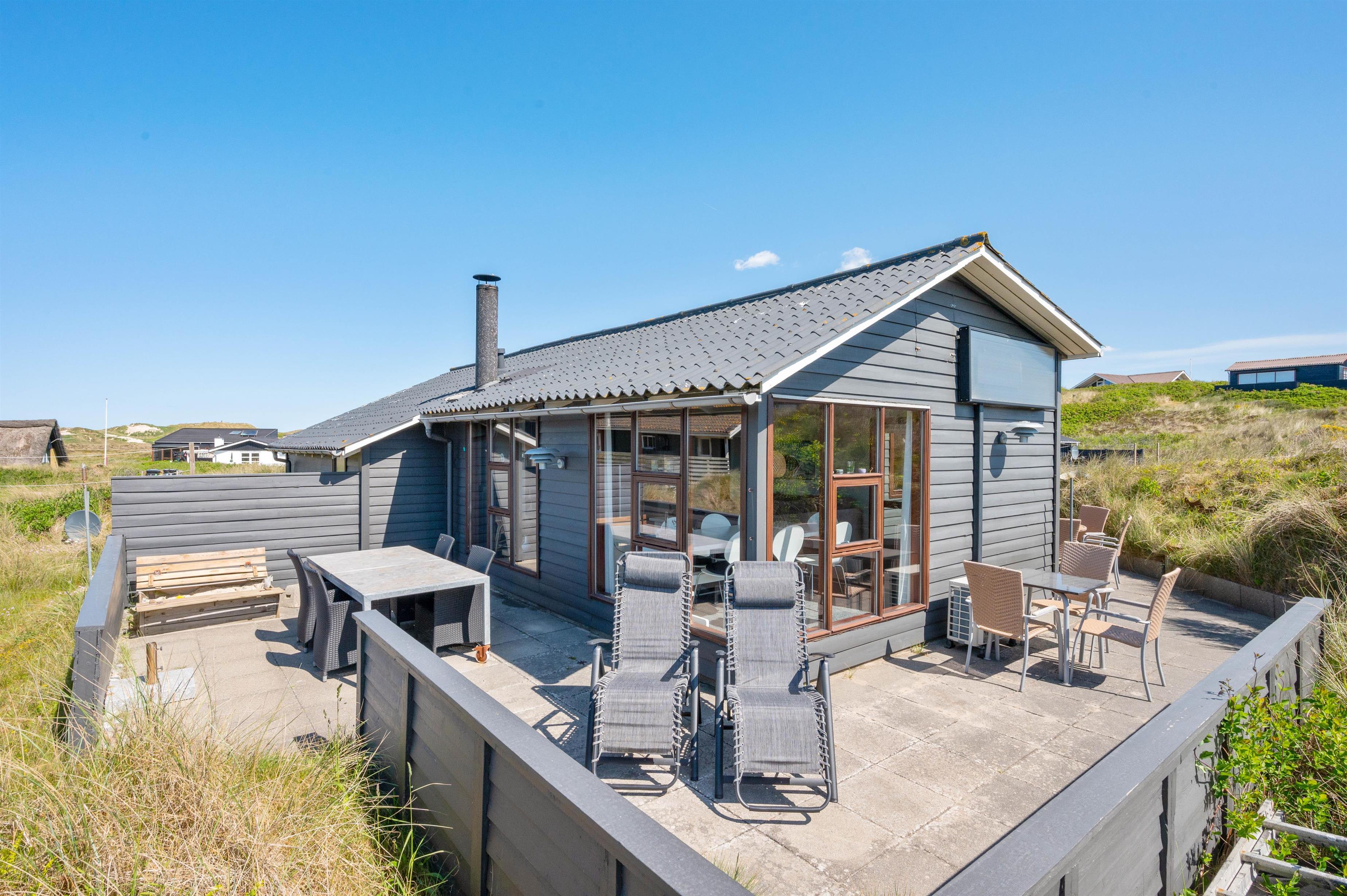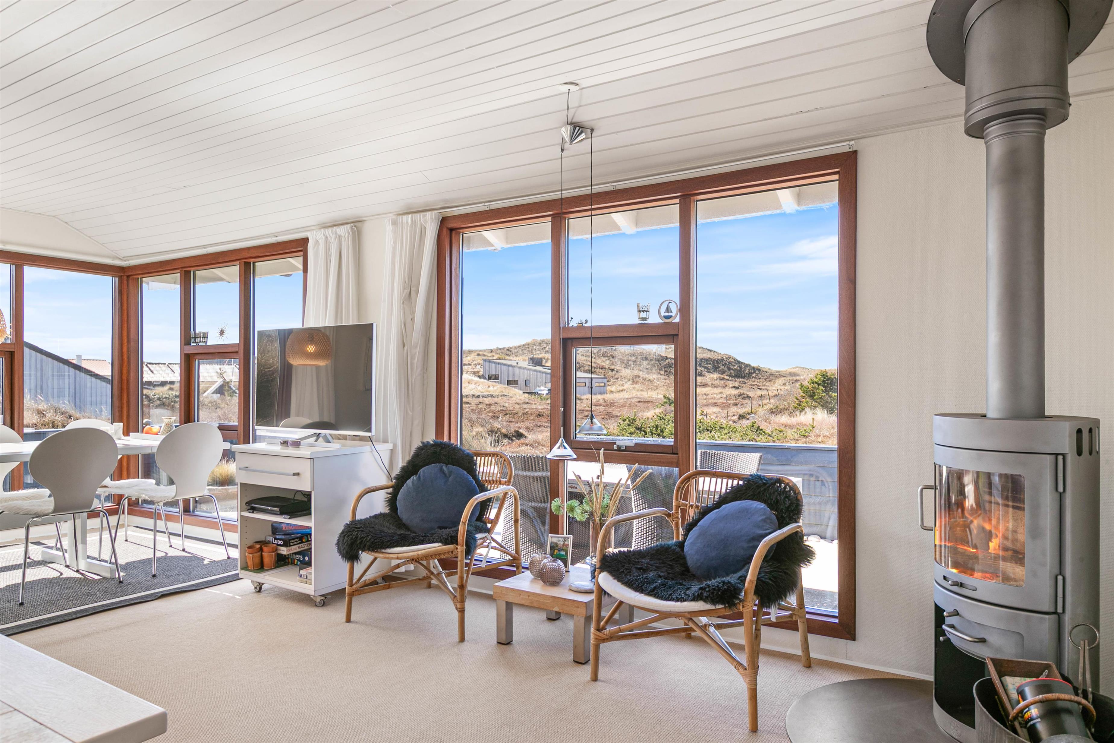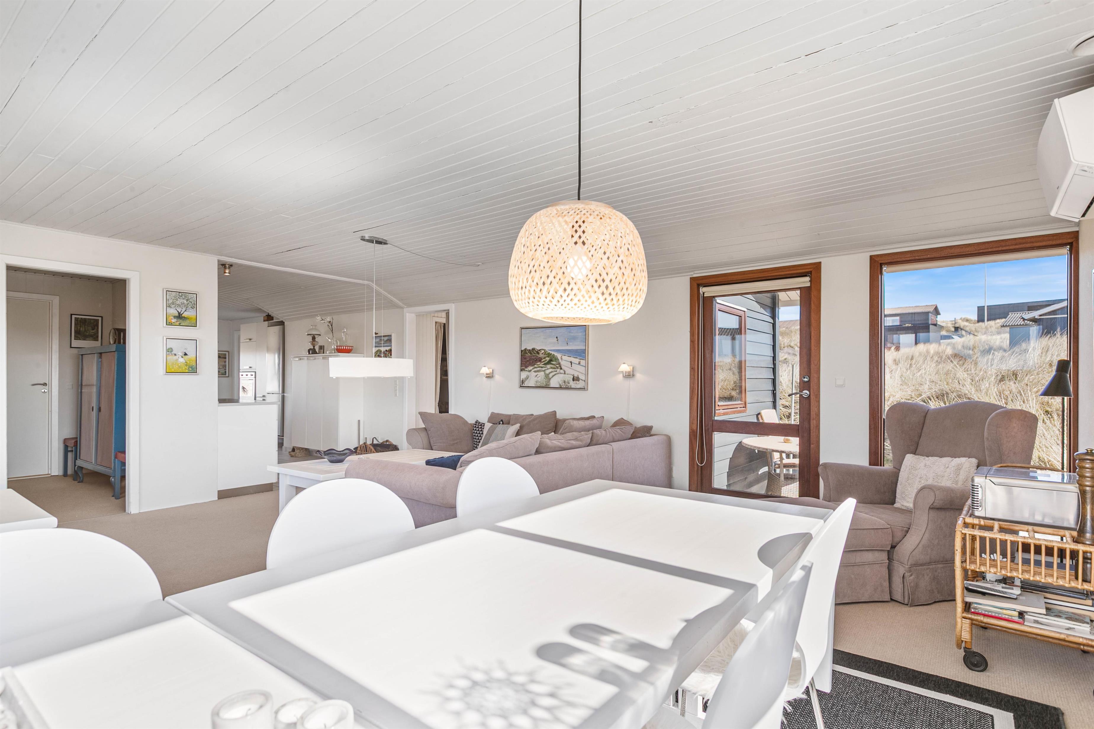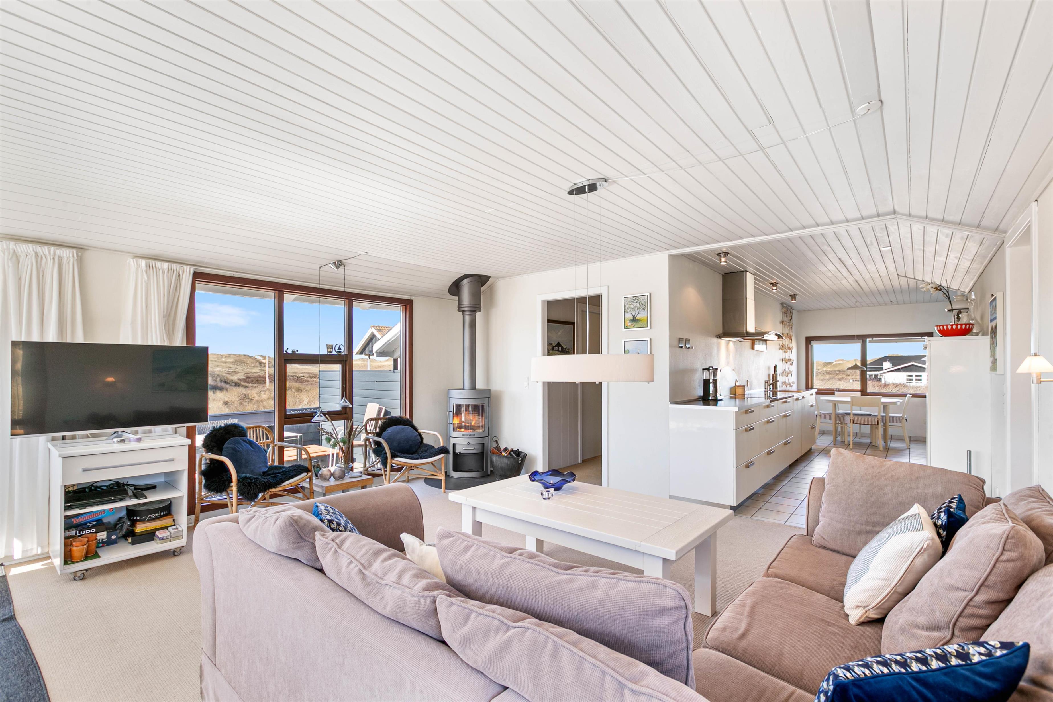 Sommerhuset ligger på Nordsøvej 262 i sidste klitrække mod Vesterhavet og er omgivet af smuk natur til alle sider. Hjertet af huset er det store opholdsrum, som med sine mange vinduer lukker både lyset og den omkringliggende natur indenfor. Her kan I sidde i sofaen og nyde varmen fra brændeovnen, mens I kigger ud over det bølgende klitlandskab. Huset er lyst og indbydende indrettet med gode møbler og moderne komfort.