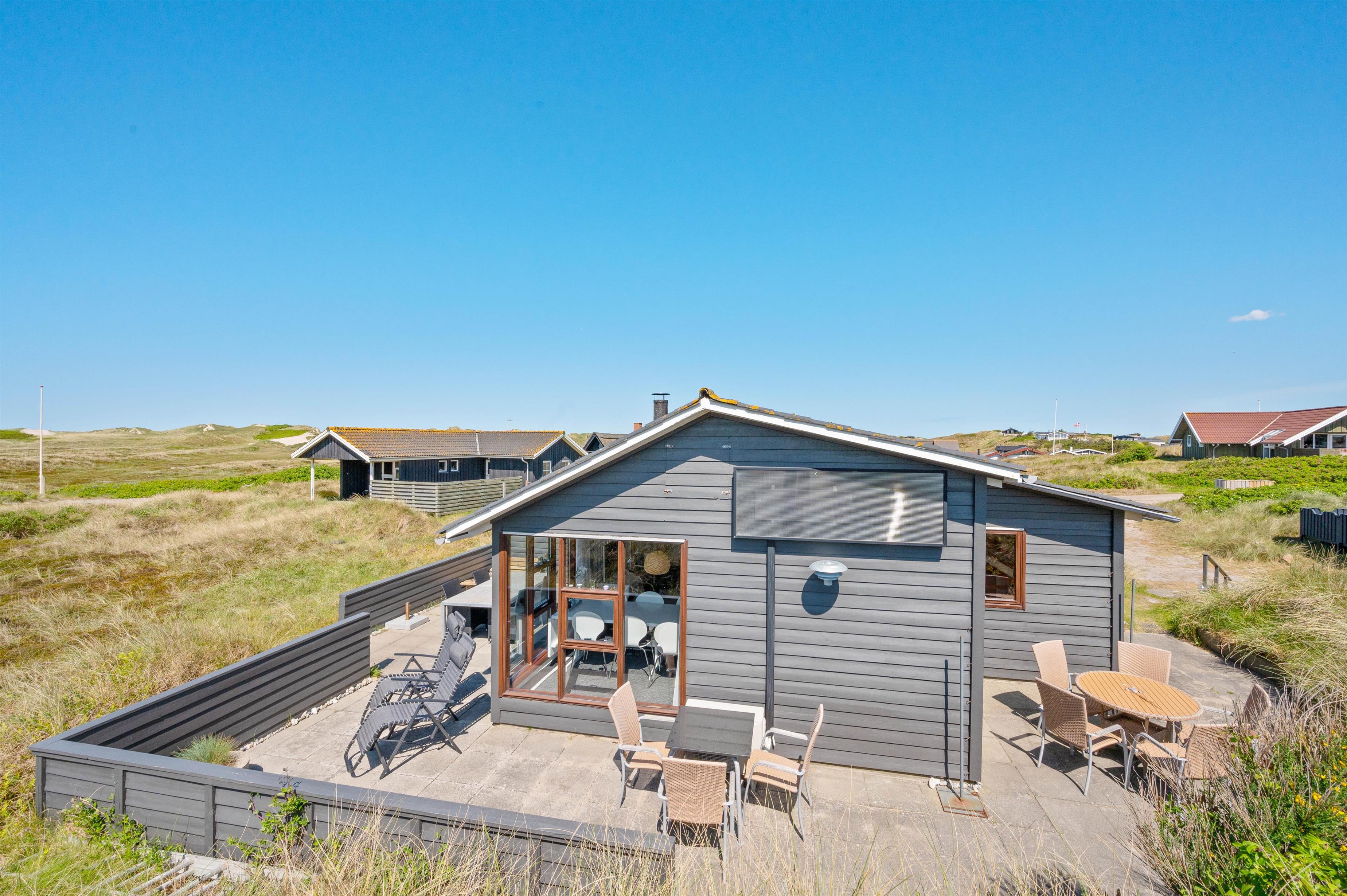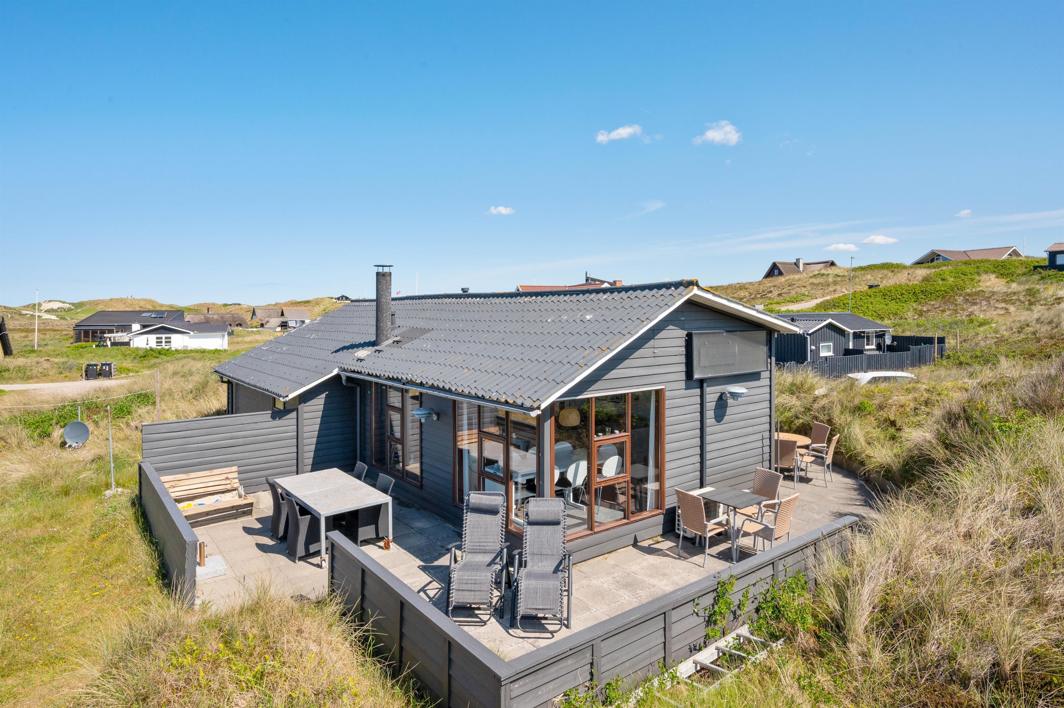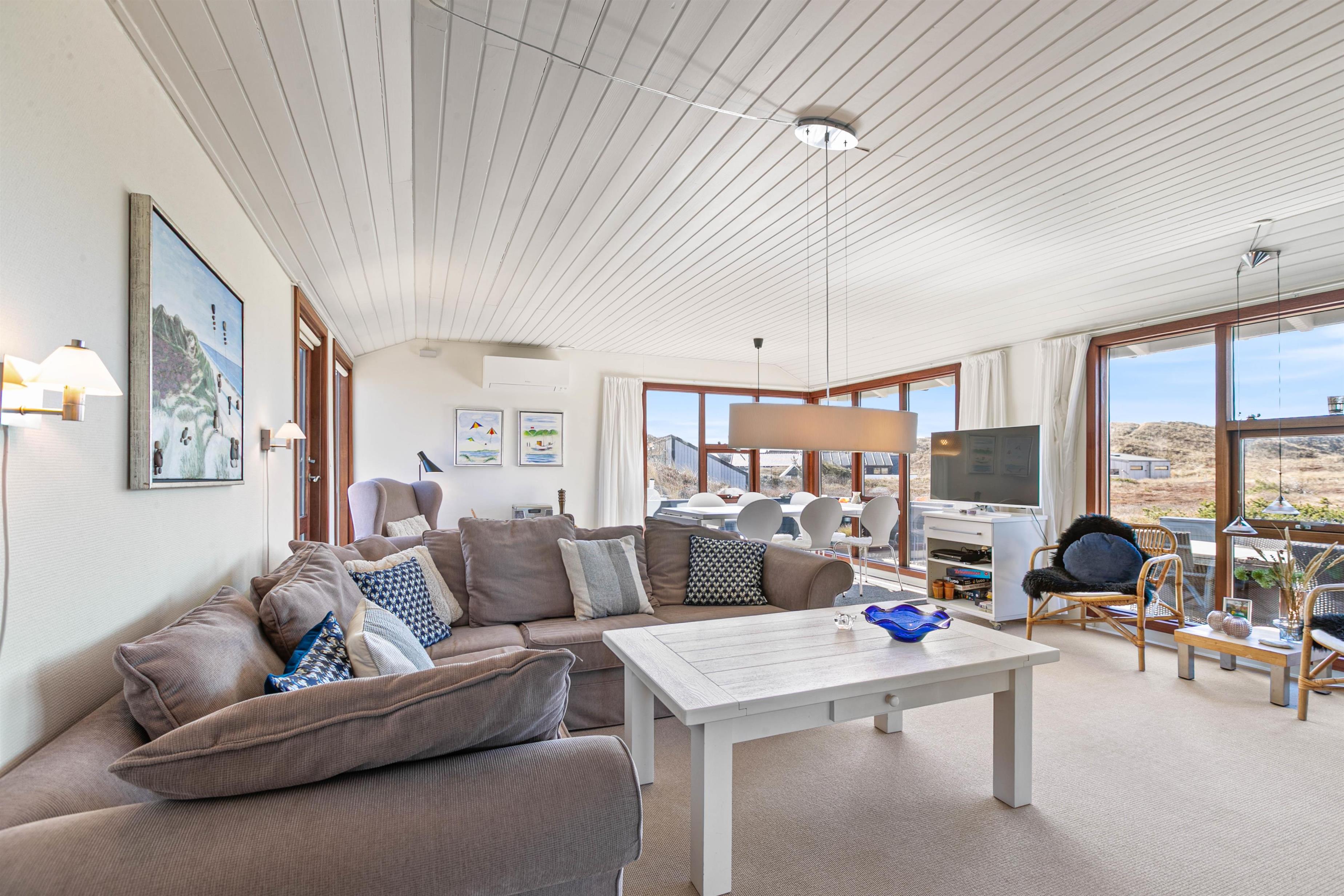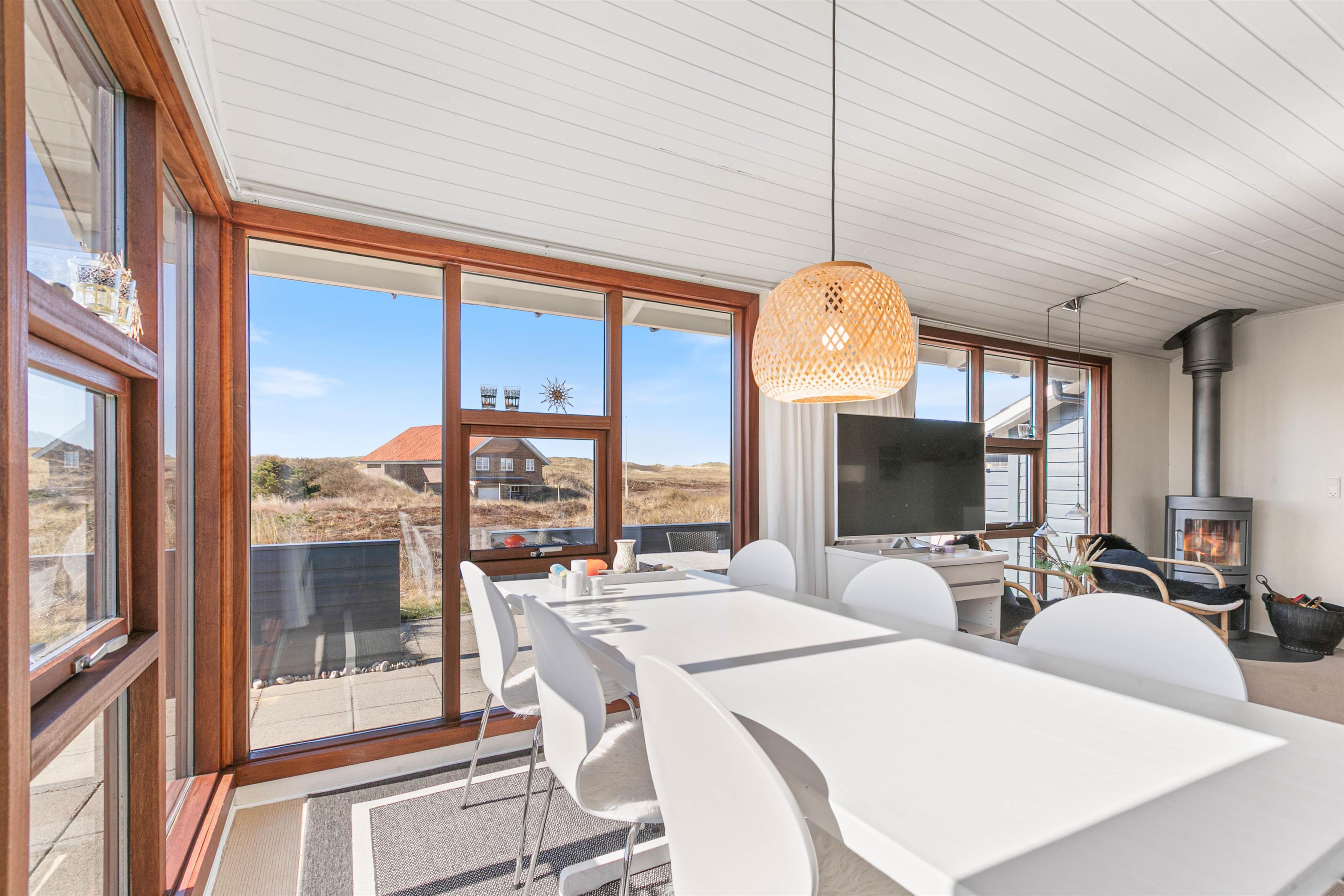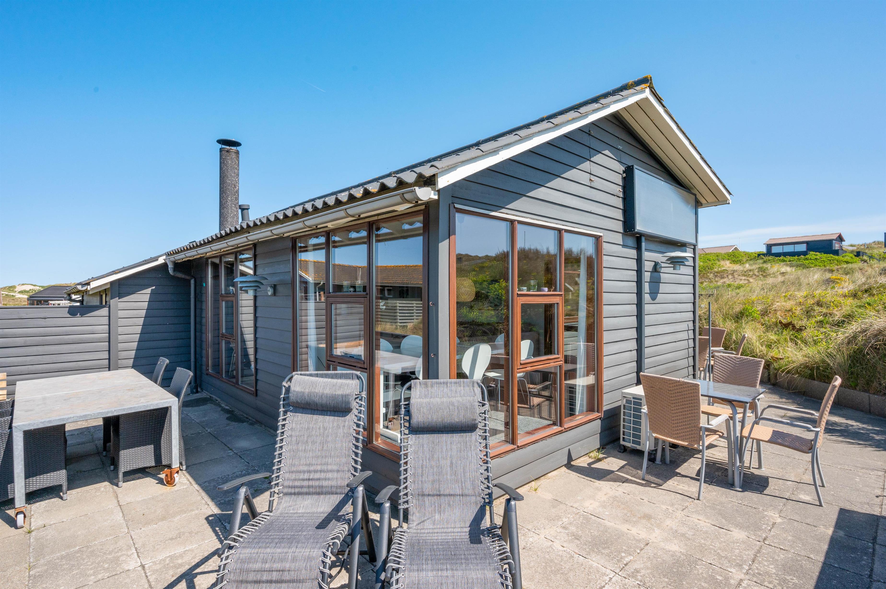 Sommerhuset ligger på Nordsøvej 262 i sidste klitrække mod Vesterhavet og er omgivet af smuk natur til alle sider. Hjertet af huset er det store opholdsrum, som med sine mange vinduer lukker både lyset og den omkringliggende natur indenfor. Her kan I sidde i sofaen og nyde varmen fra brændeovnen, mens I kigger ud over det bølgende klitlandskab. Huset er lyst og indbydende indrettet med gode møbler og moderne komfort.