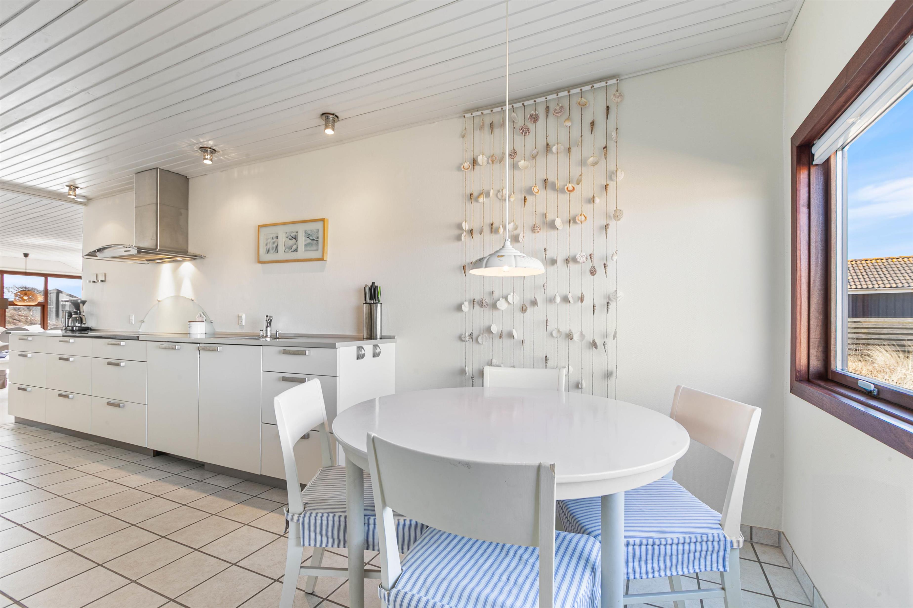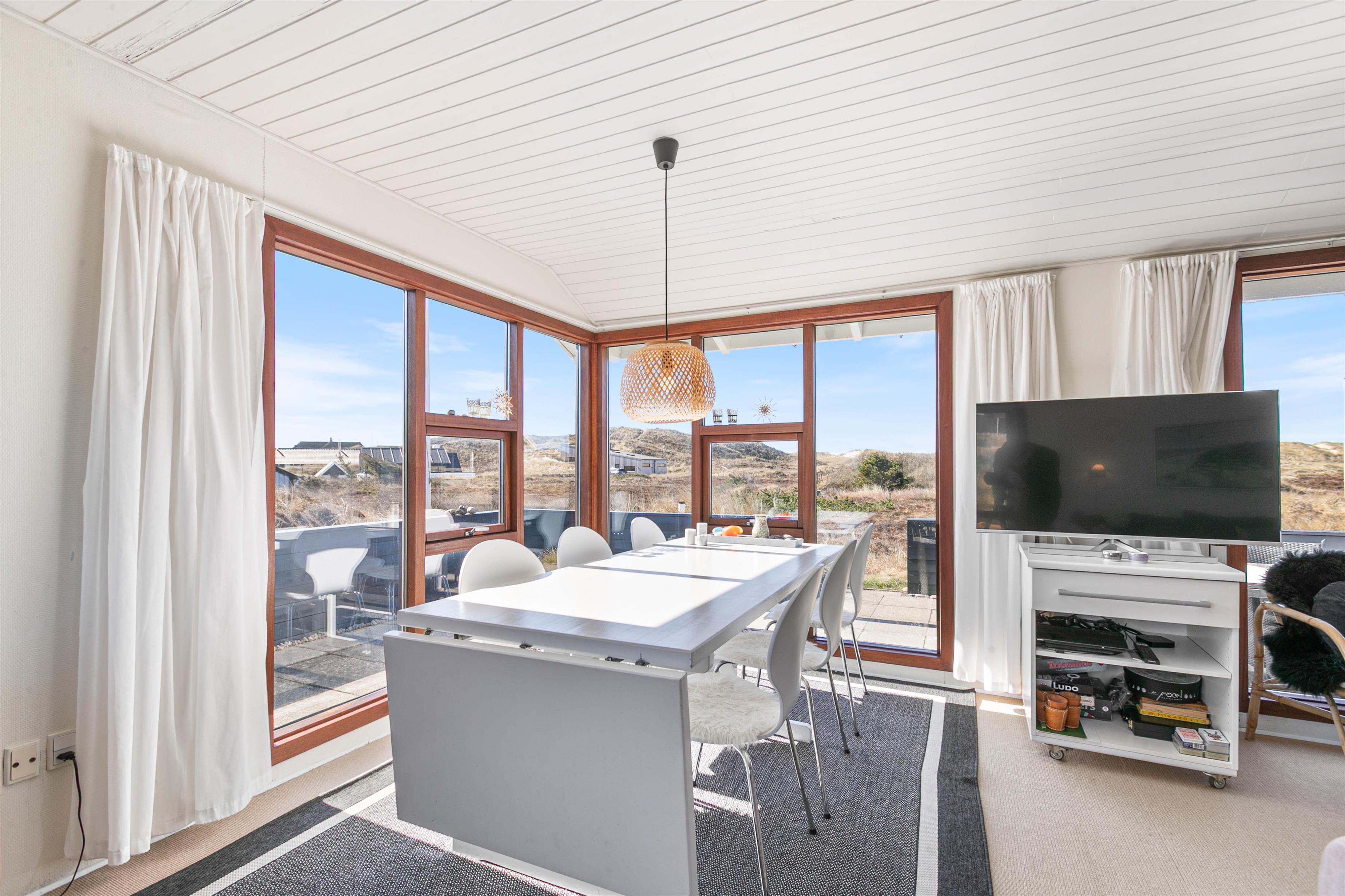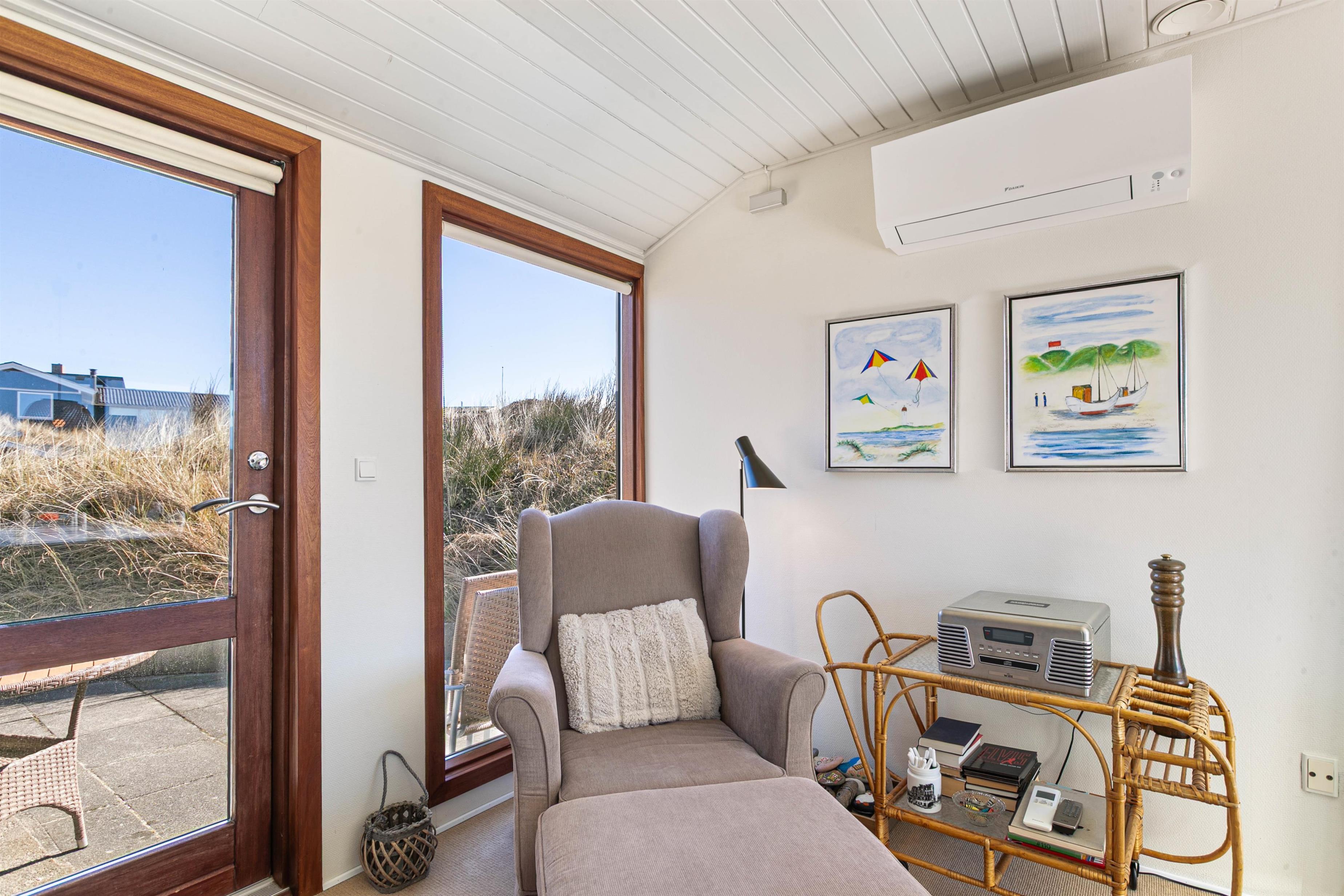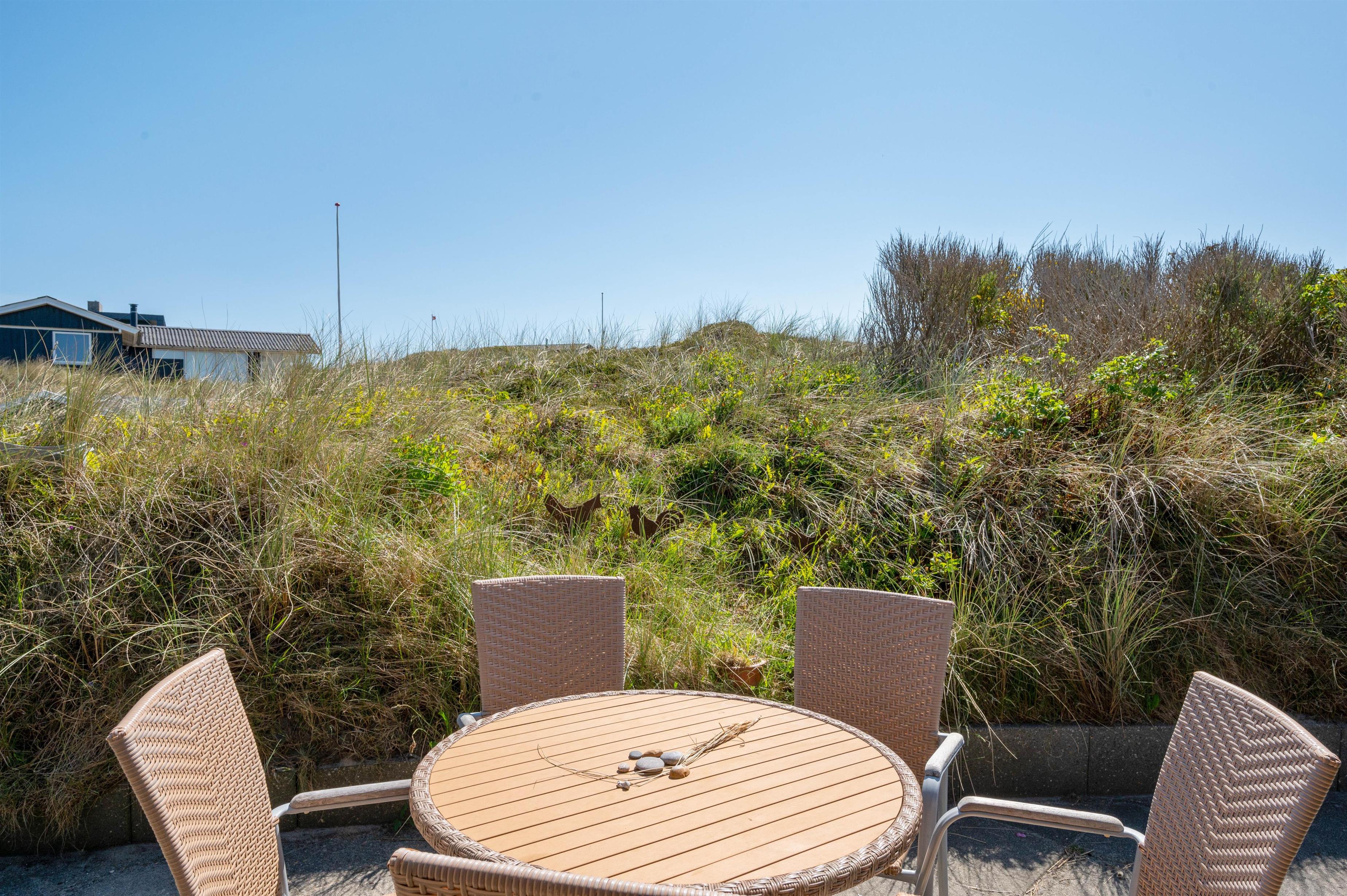 Sommerhuset ligger på Nordsøvej 262 i sidste klitrække mod Vesterhavet og er omgivet af smuk natur til alle sider. Hjertet af huset er det store opholdsrum, som med sine mange vinduer lukker både lyset og den omkringliggende natur indenfor. Her kan I sidde i sofaen og nyde varmen fra brændeovnen, mens I kigger ud over det bølgende klitlandskab. Huset er lyst og indbydende indrettet med gode møbler og moderne komfort.