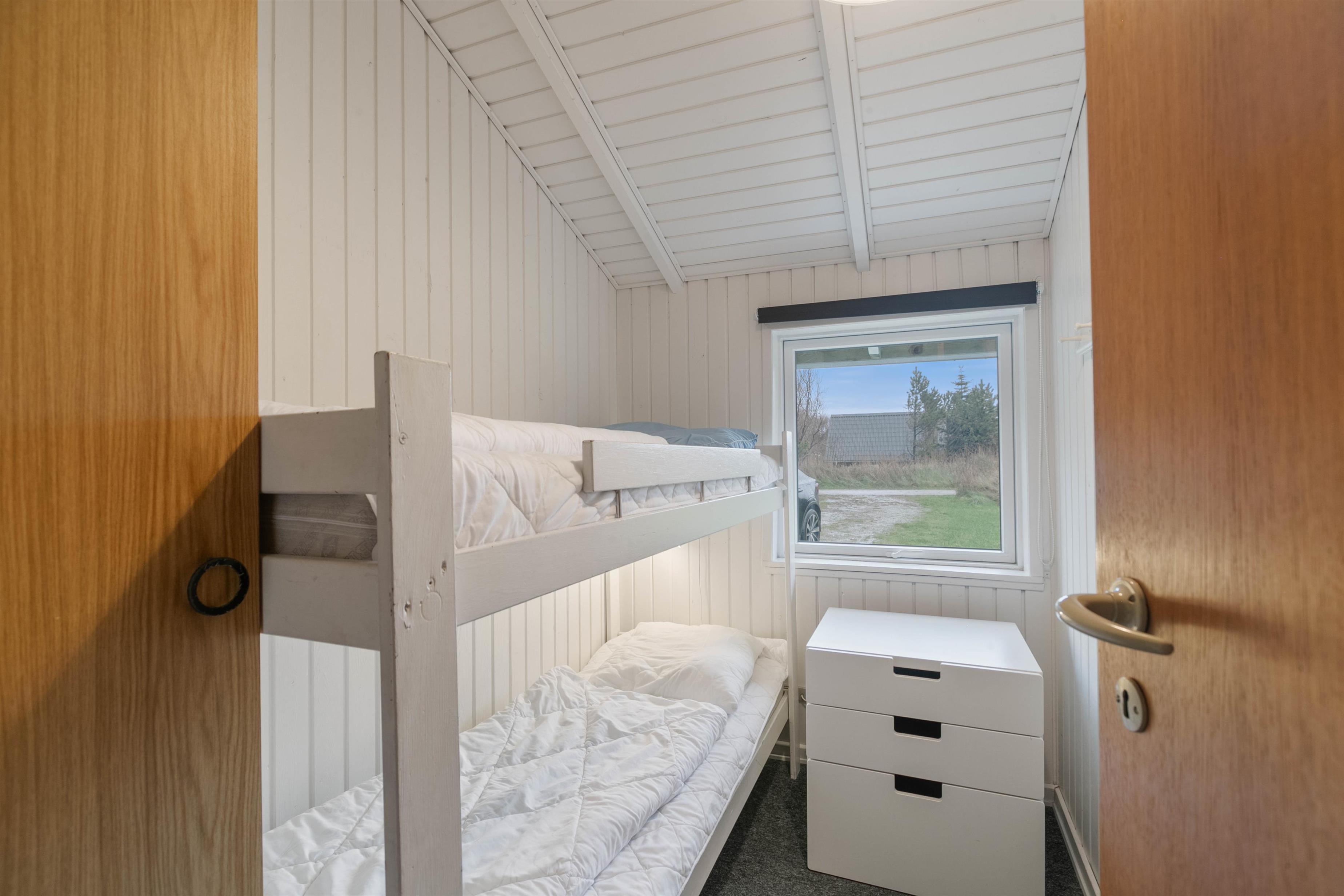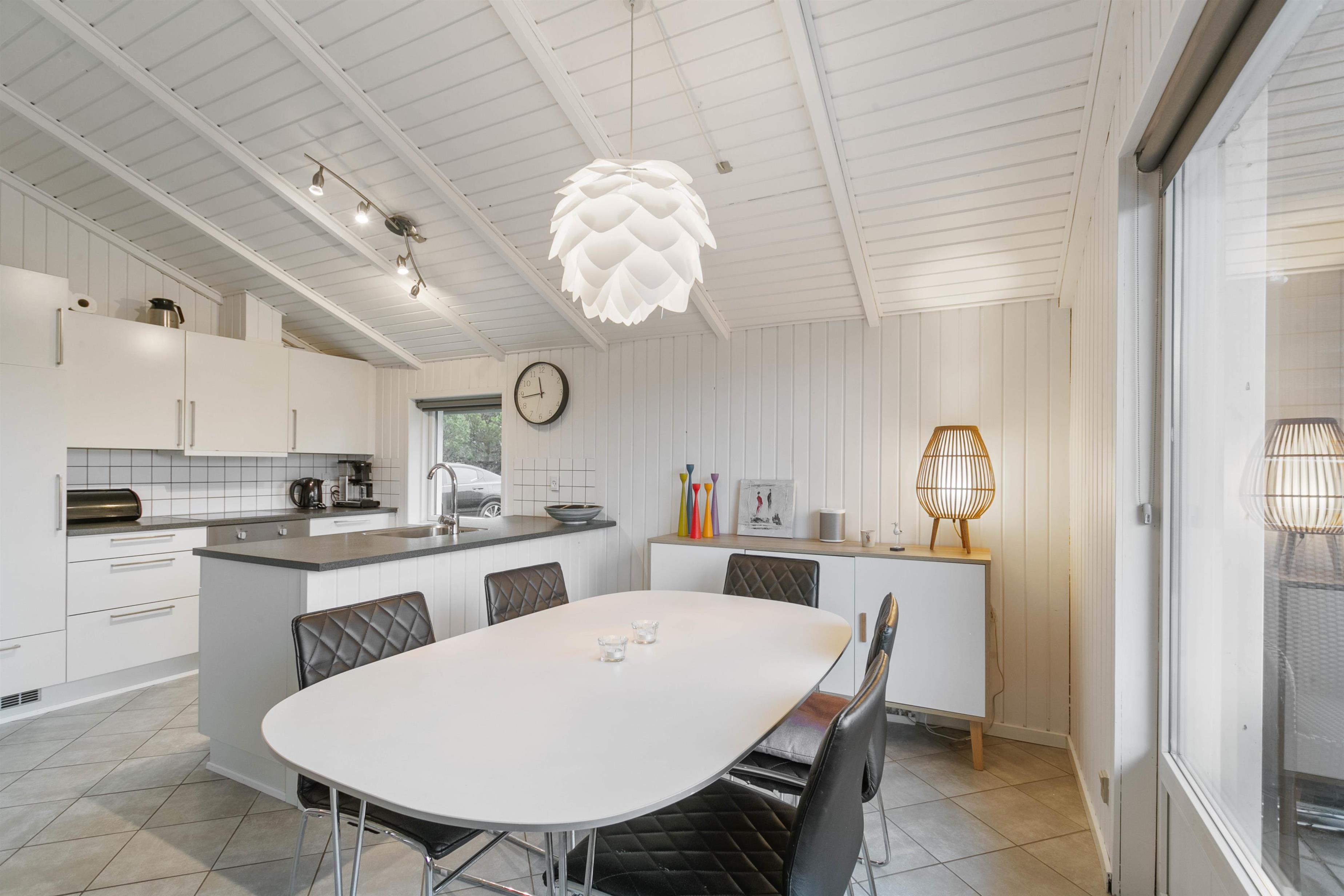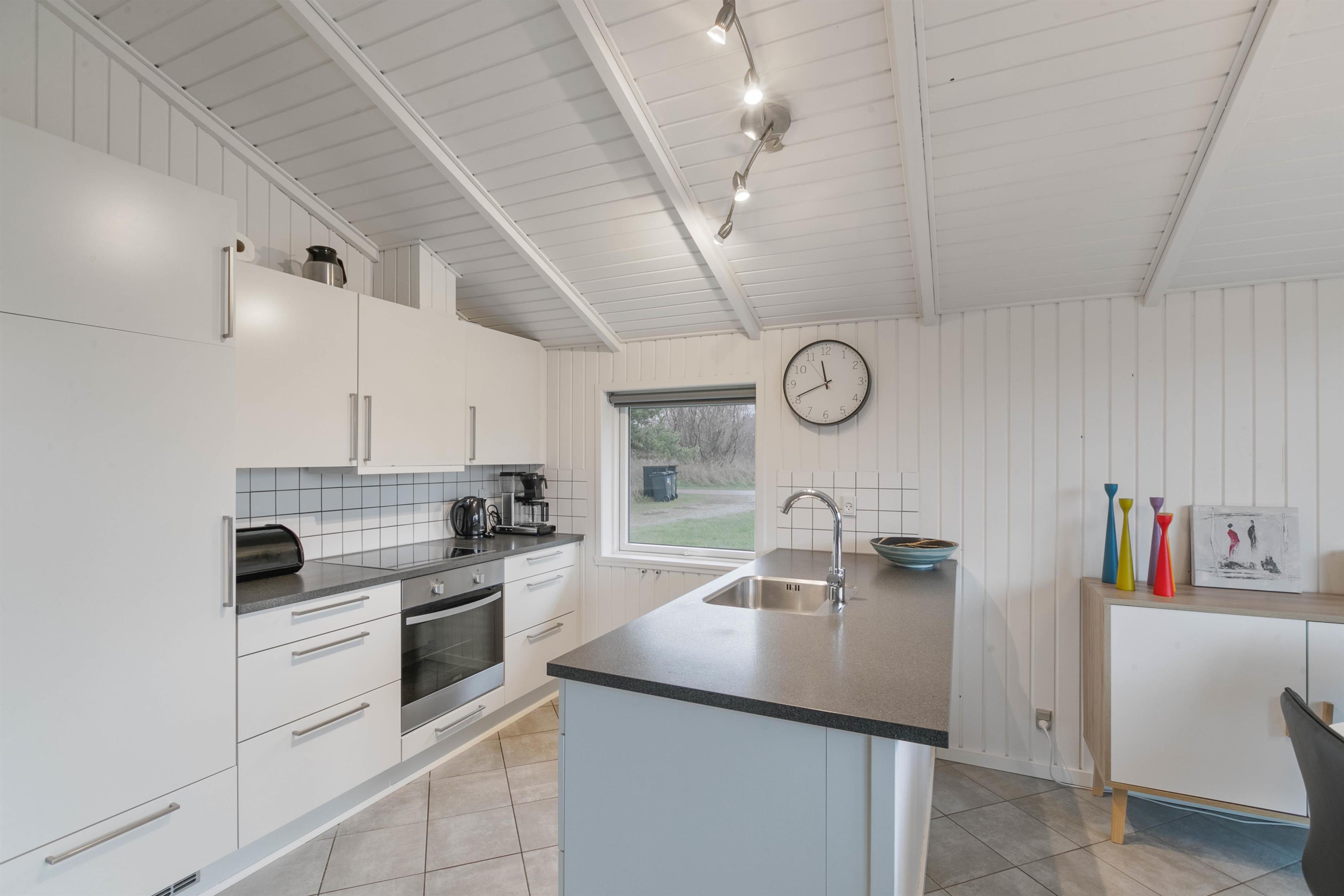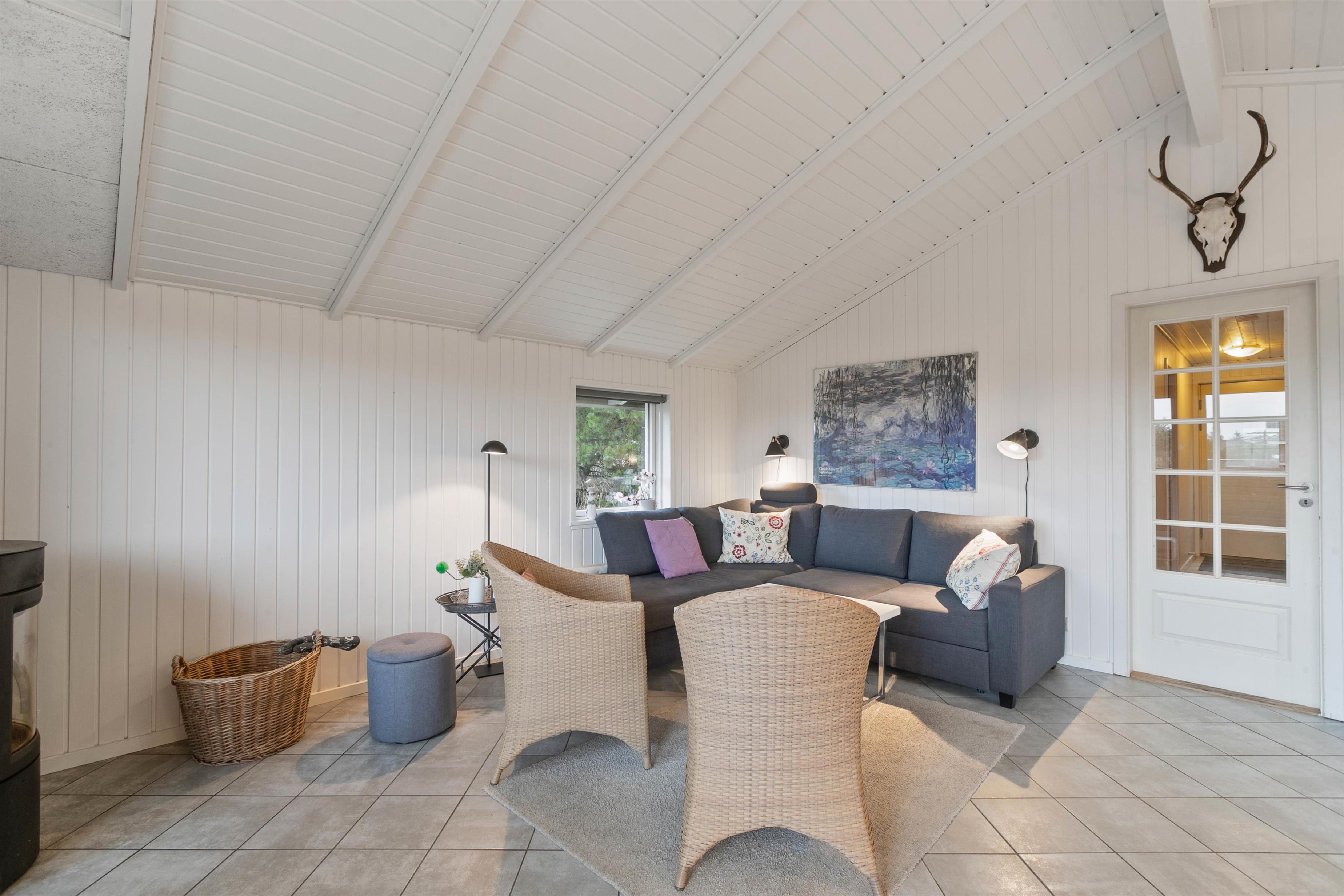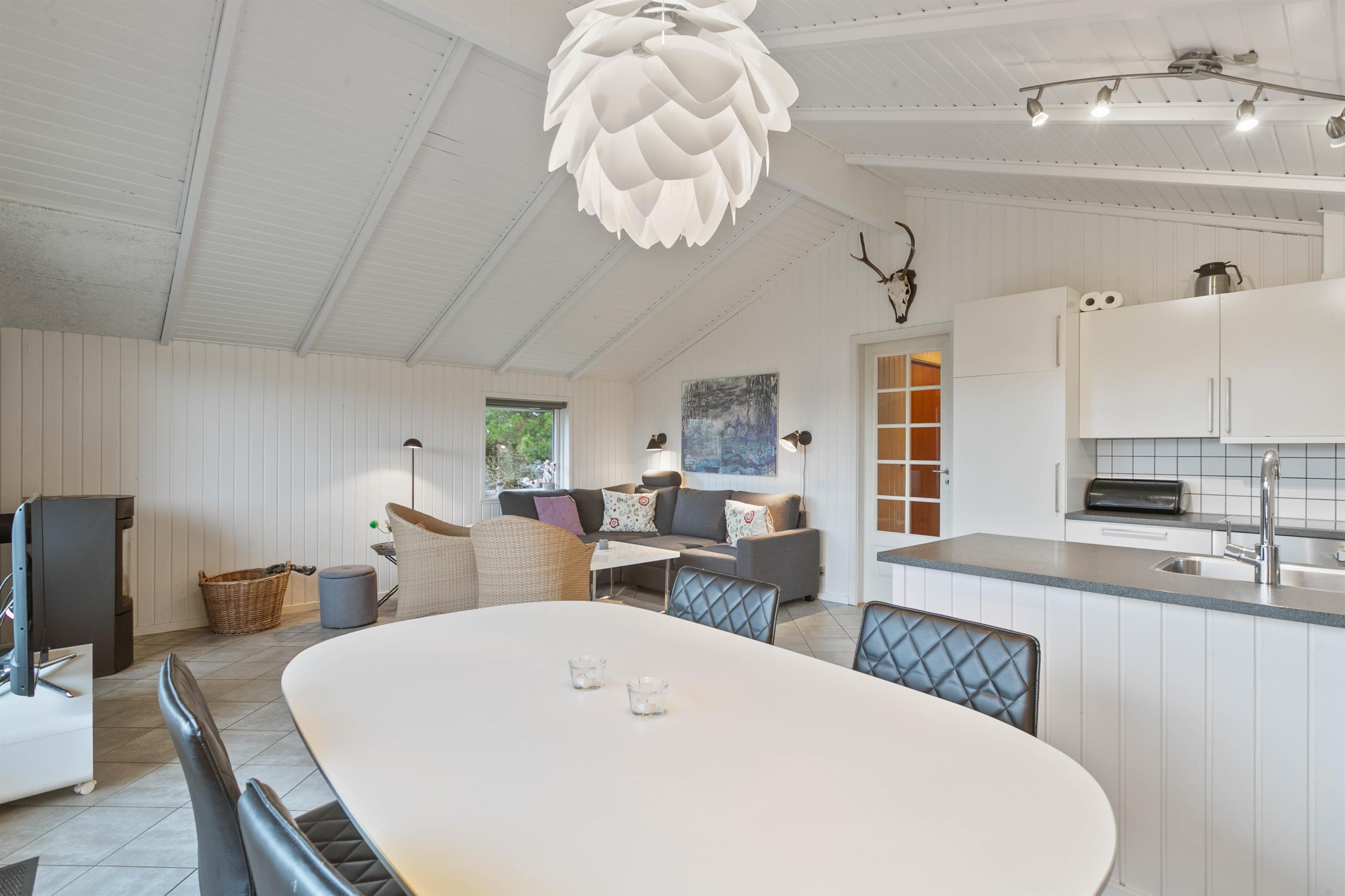 Sommerhusets hjerte er det store opholdsrum, hvor køkken, spiseplads og stue smelter sammen til ét. De hvide vægge og lofter af træ gør pladsen i sommerhuset let og luftig. Huset har tre lyse soverum og plads til i alt 6 personer. Møblerne er pæne og behagelige at sidde i. Her kan I smække fødderne op og nyde feriens ro, efter en lang dag hvor I har udforsket en lokalområdet.