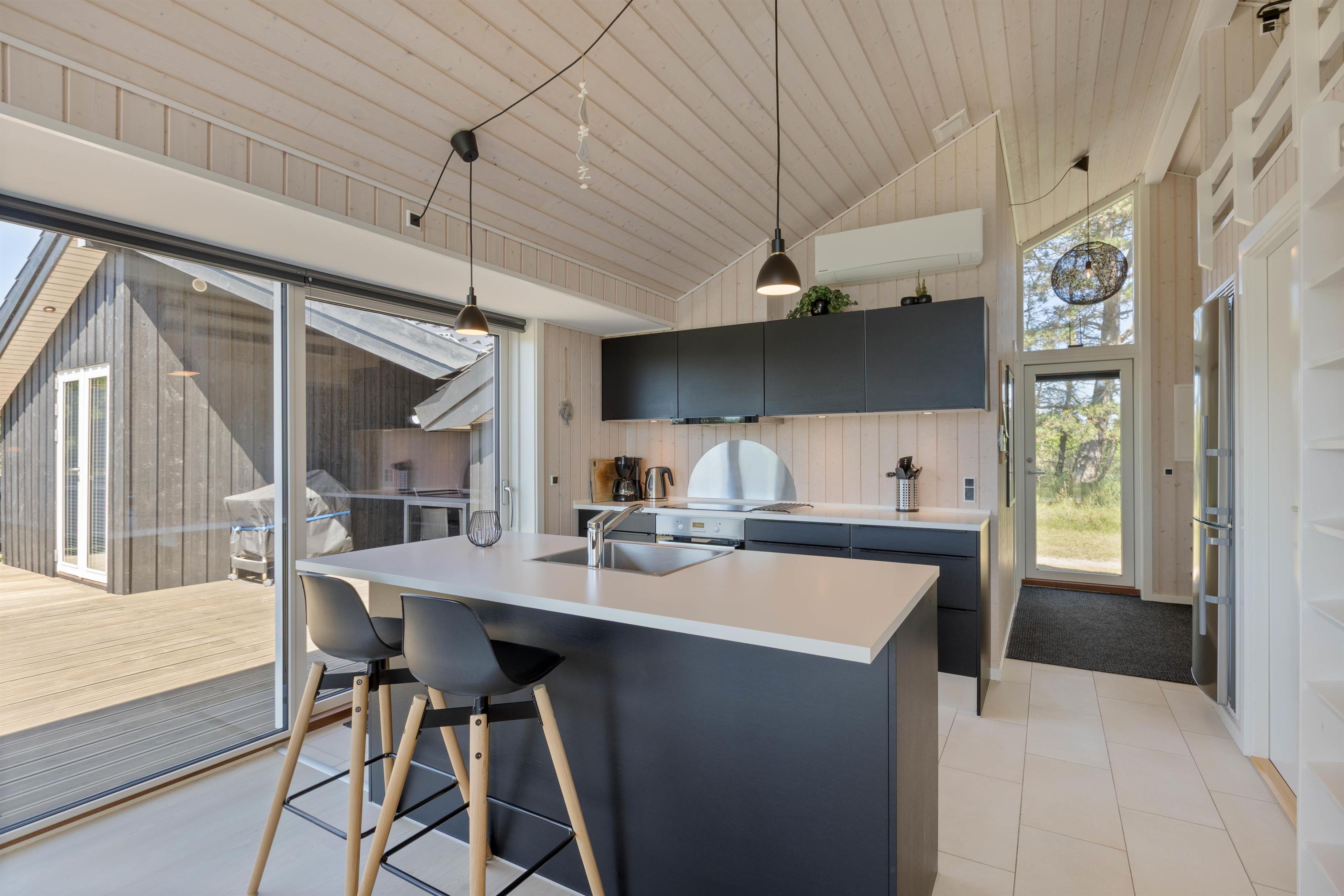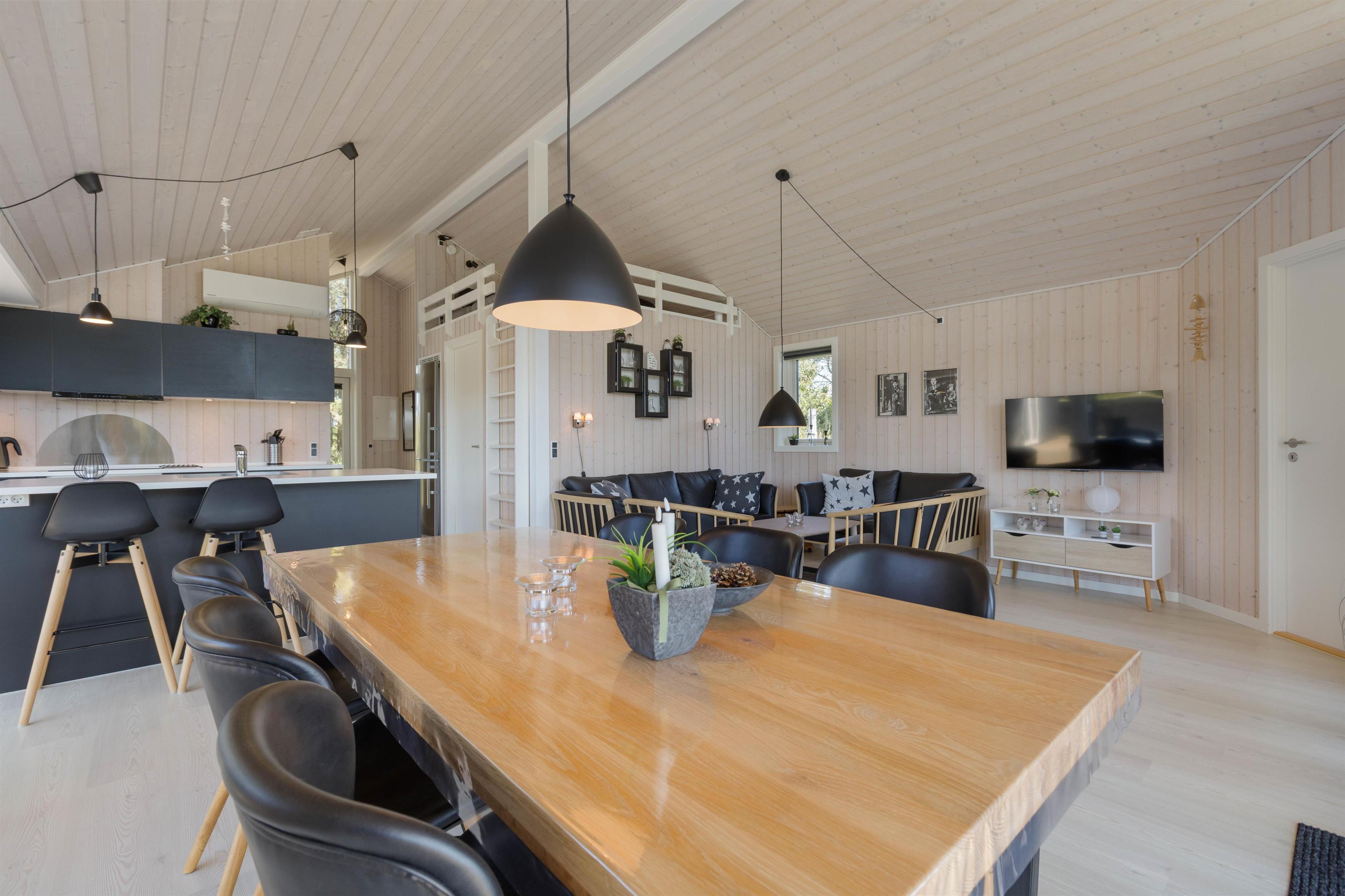 De lyse trælofter, gulve og vægge sørger for en venlig atmosfære, hvor I fra første ferieøjeblik vil føle jer godt tilpas. I det kombinerede opholdsrum med stue, køkken og spiseafdeling er rammerne sat for en ferie med masser af samvær og fællesskab.
