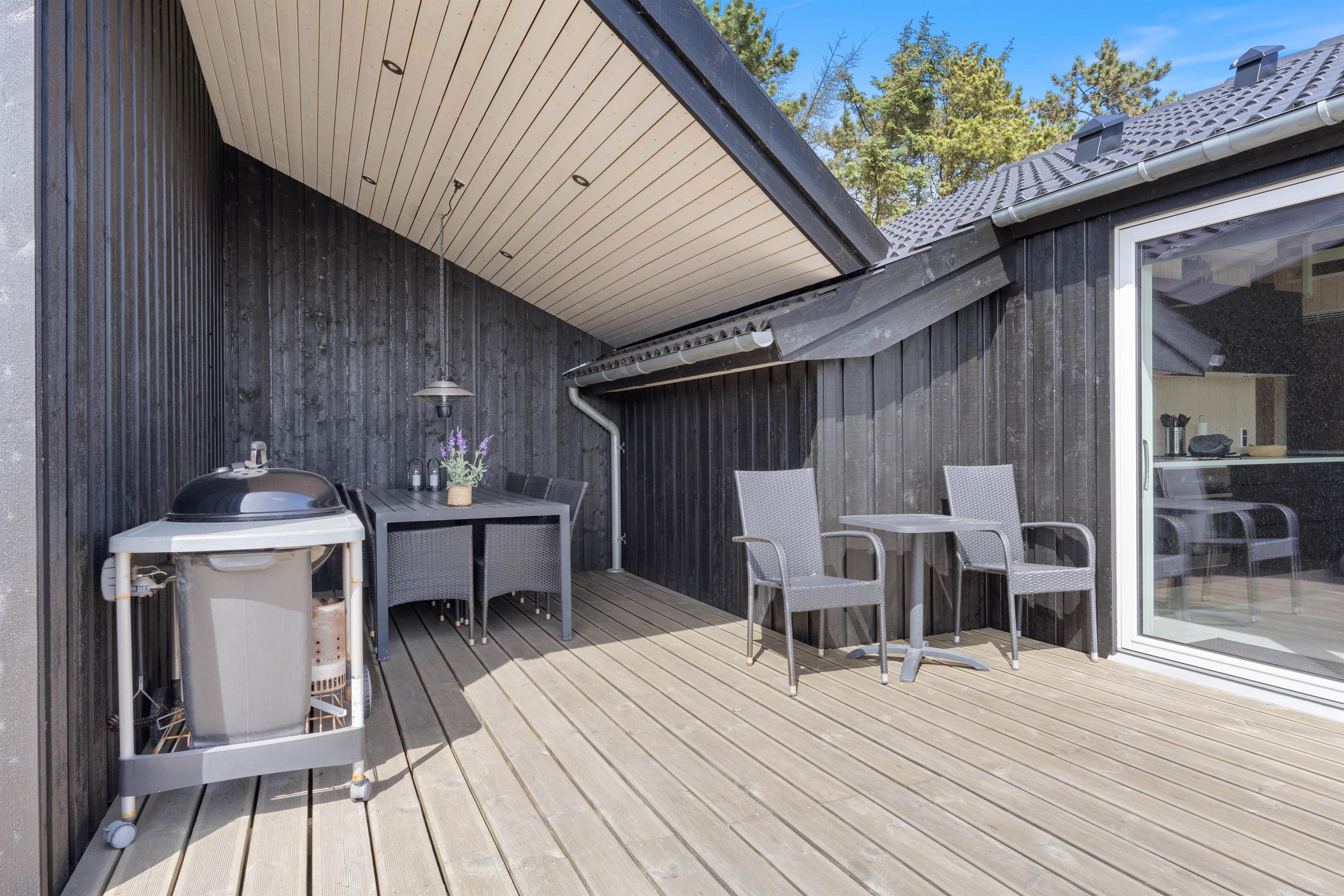 Både fra køkkenet og stuen er der udgang til den store lækre træterrasse, hvor I kan nyde det gode vejr fra liggestolene og spise en god frokost i solen. Terrassen er godt afskærmet hele vejen rundt, og her finder I læ, selv når vestenvinden suser.