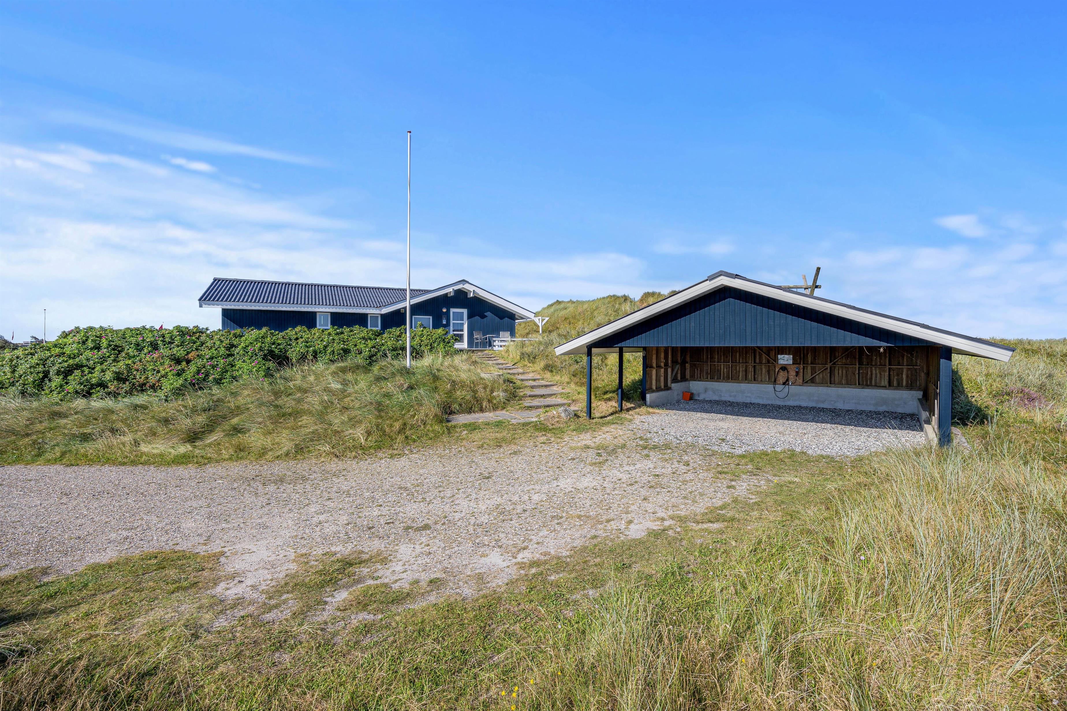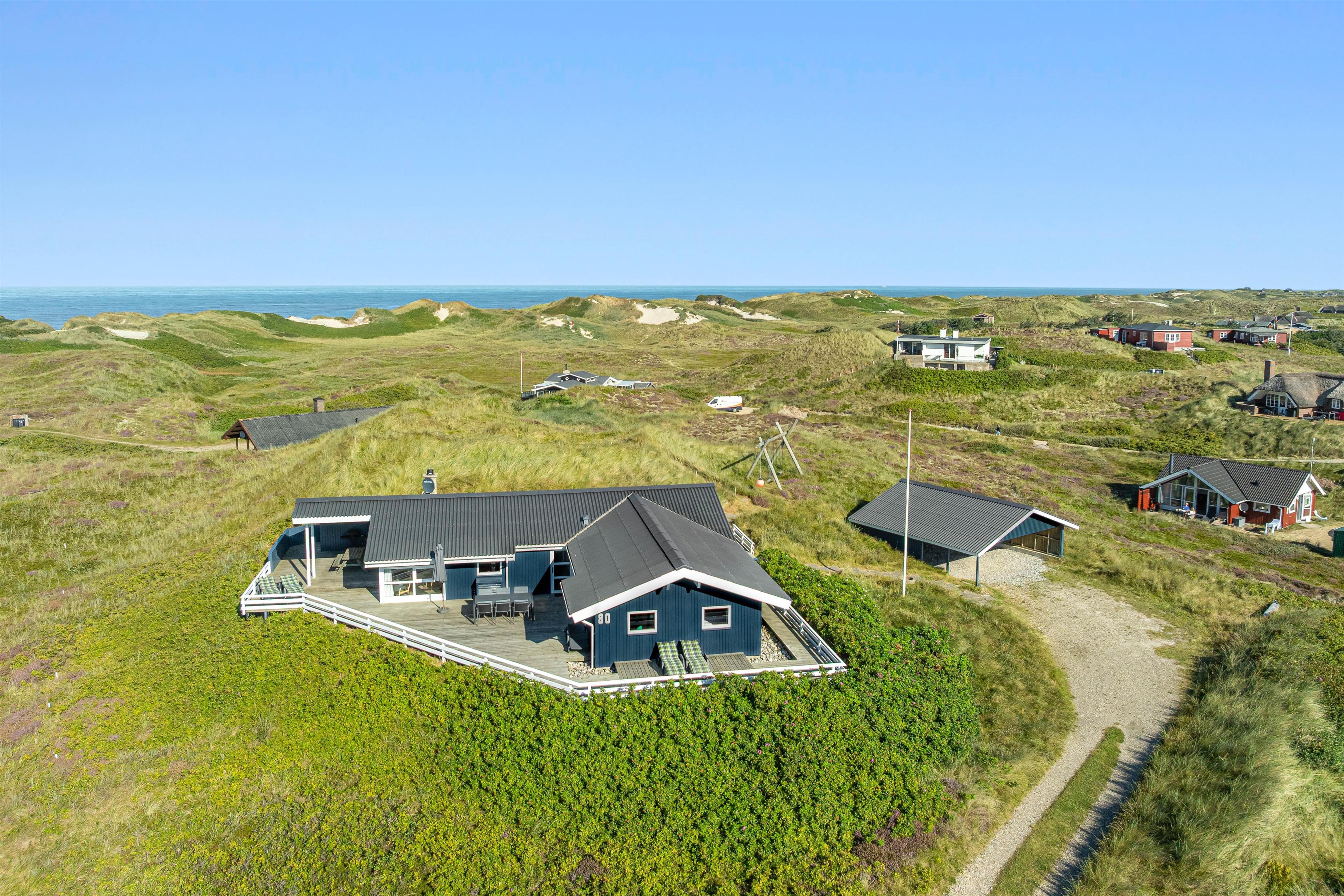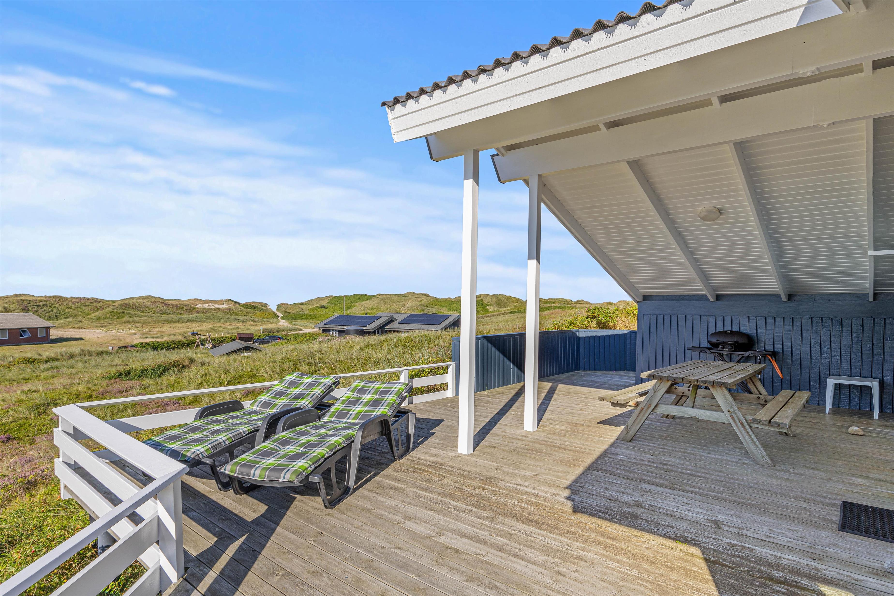 Fra stuen træder I direkte ud på den skønne syd-, øst-, og vestvendte terrasse med områdets måske nok flotteste udsigt. Terrassen er ideel som morgenterrasse, hvor I har solen i øst. I løbet af dagen kan I nyde solen henslængt i en liggestol, mens I om aftenen kan tænde op i grillen og stege et par saftige bøffer, alt imens I betragter den røde solnedgang bag klitterne og lytter til Vesterhavets brusende bølger i baggrunden.