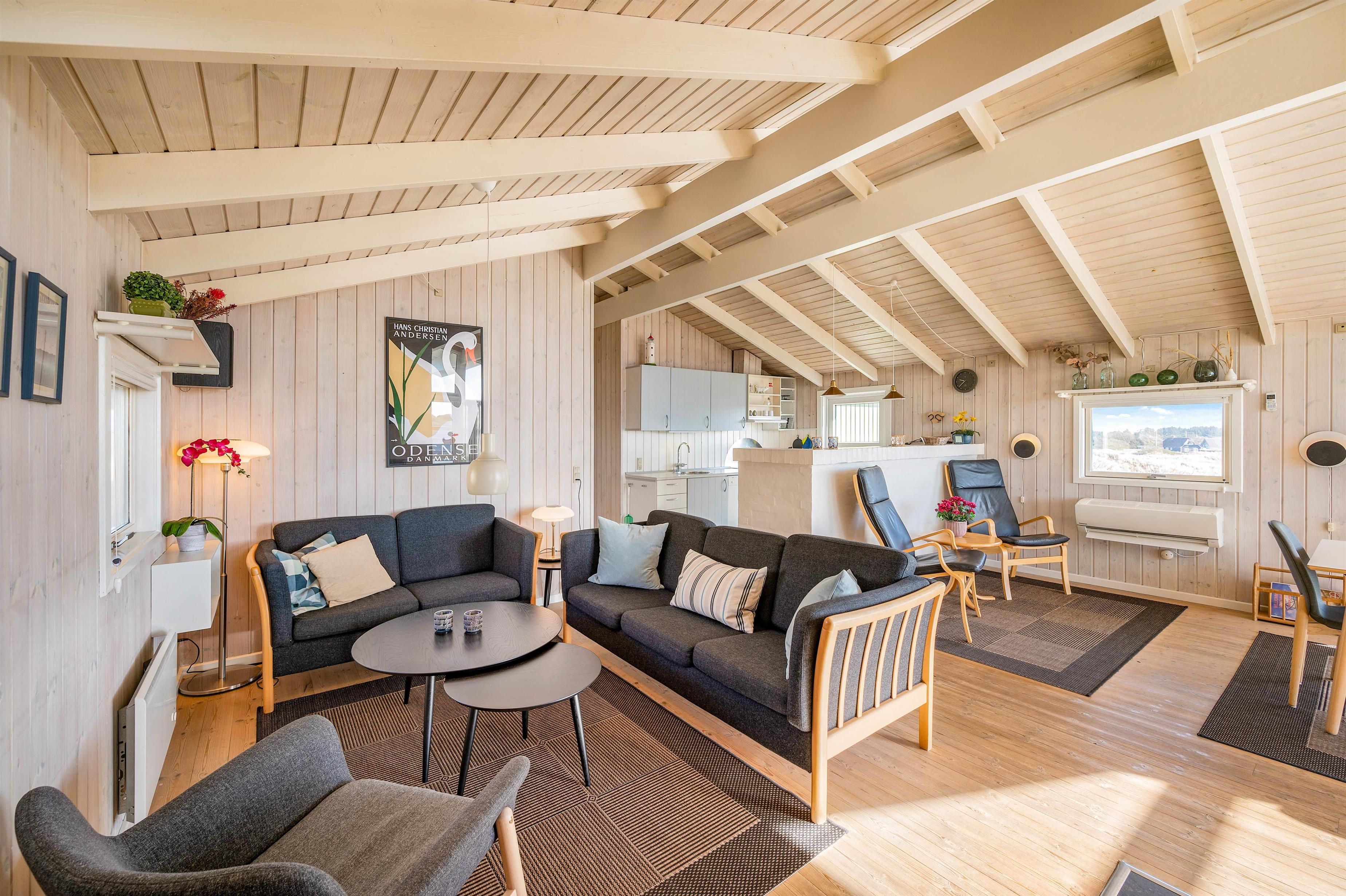 Straks I træder indenfor i det lyse og velindrettede sommerhus, vil I mærke, hvordan feriestemningen langsomt sænker sig over jer. De hvidemalede trævægge og brede loftbjælker gør indretningen ekstra charmerende, og det er tydeligt, at træhuset emmer af ægte sommerhusstemning