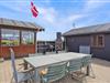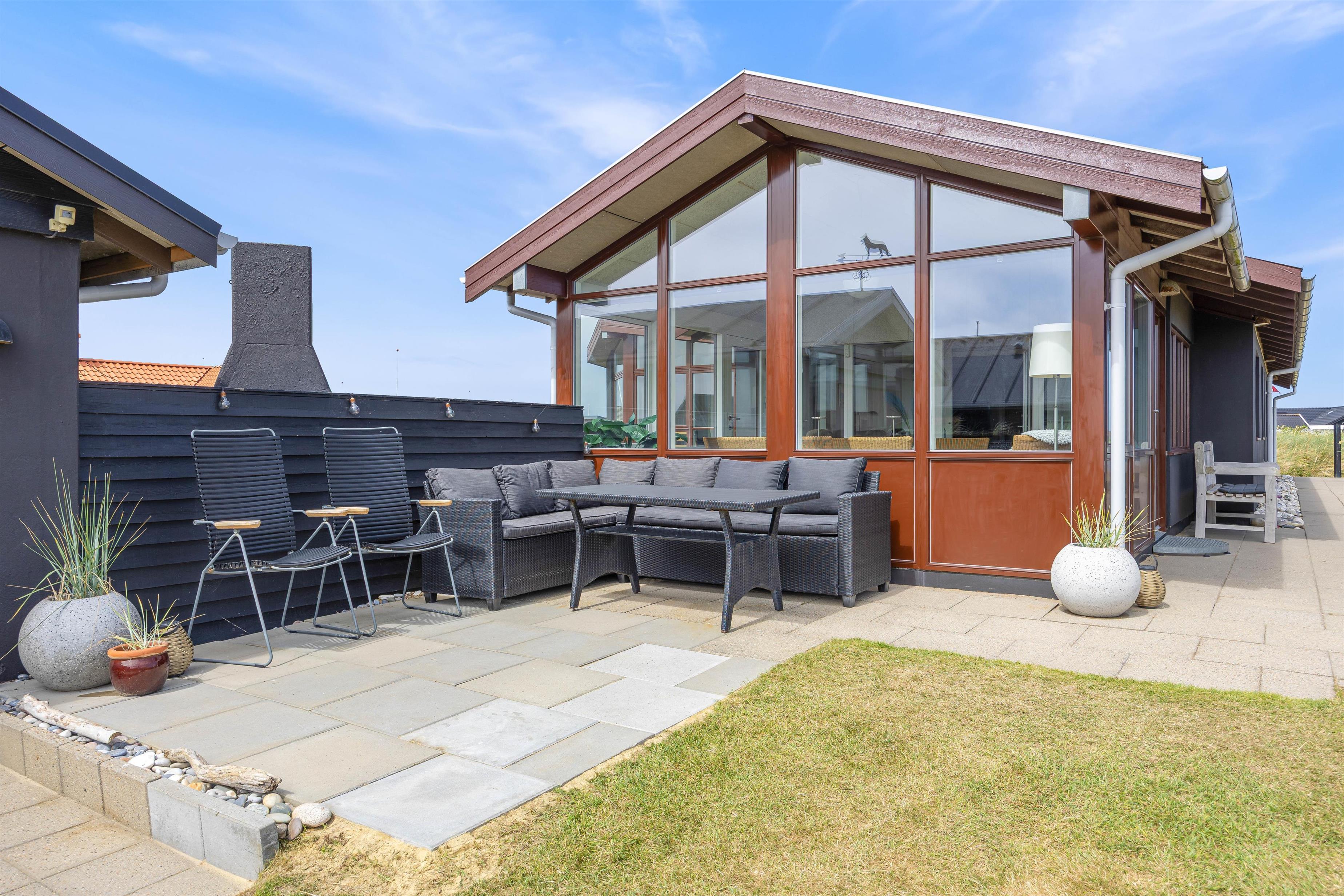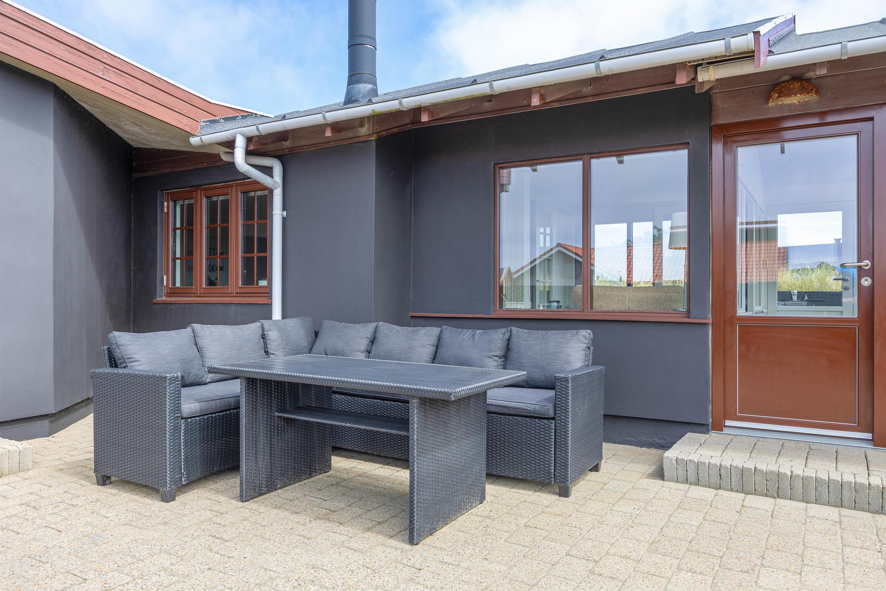 De skønne og solrige dage kan nydes på sommerhusets lukkede og afskærmede terrasse. Tag en lur på udendørs-hjørnesofaen, nyd jeres aftensmad ved havebordet eller nyd solens stråler fra en af liggestolene. Udelivet kan nydes i lige så høj grad som livet indendørs!
