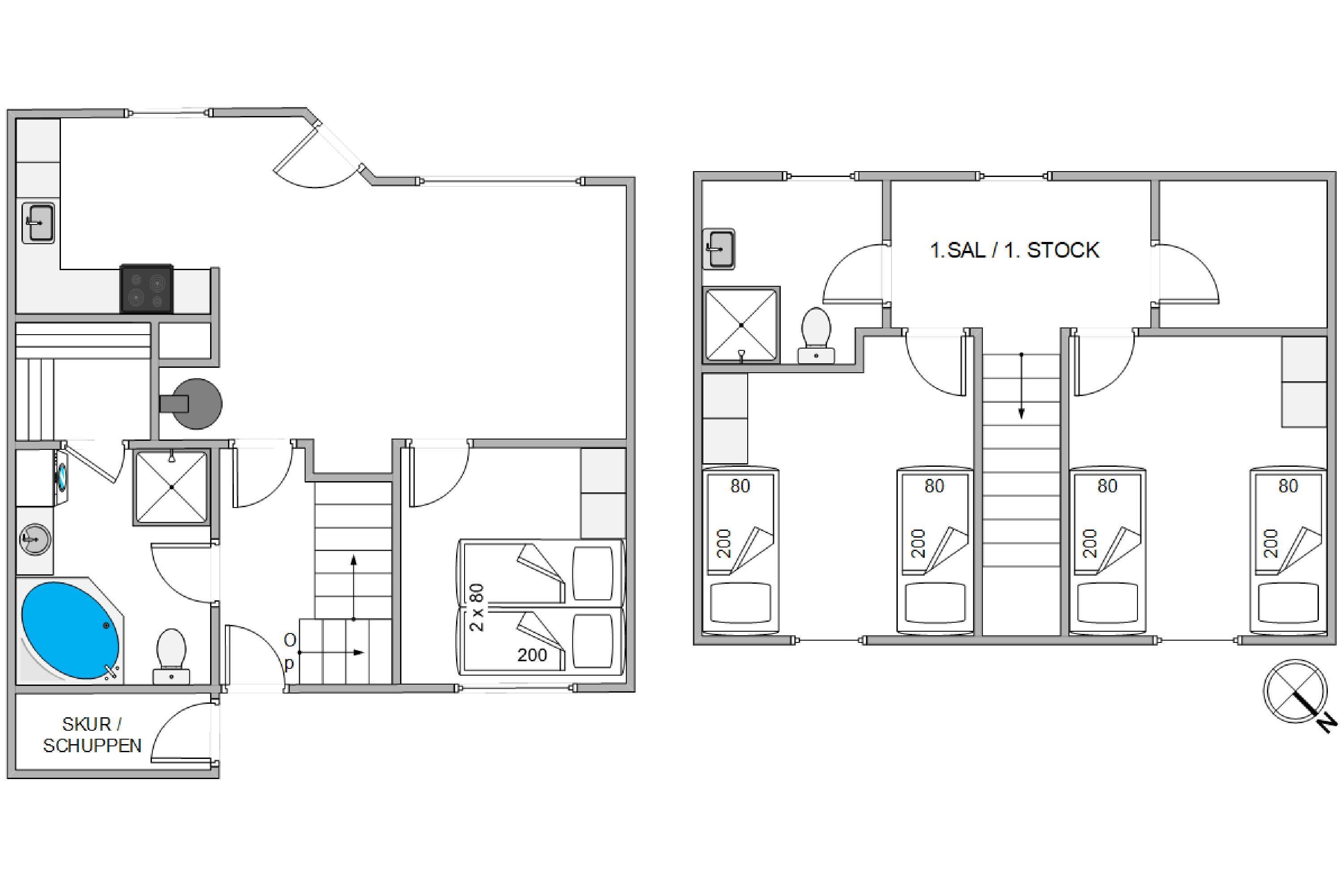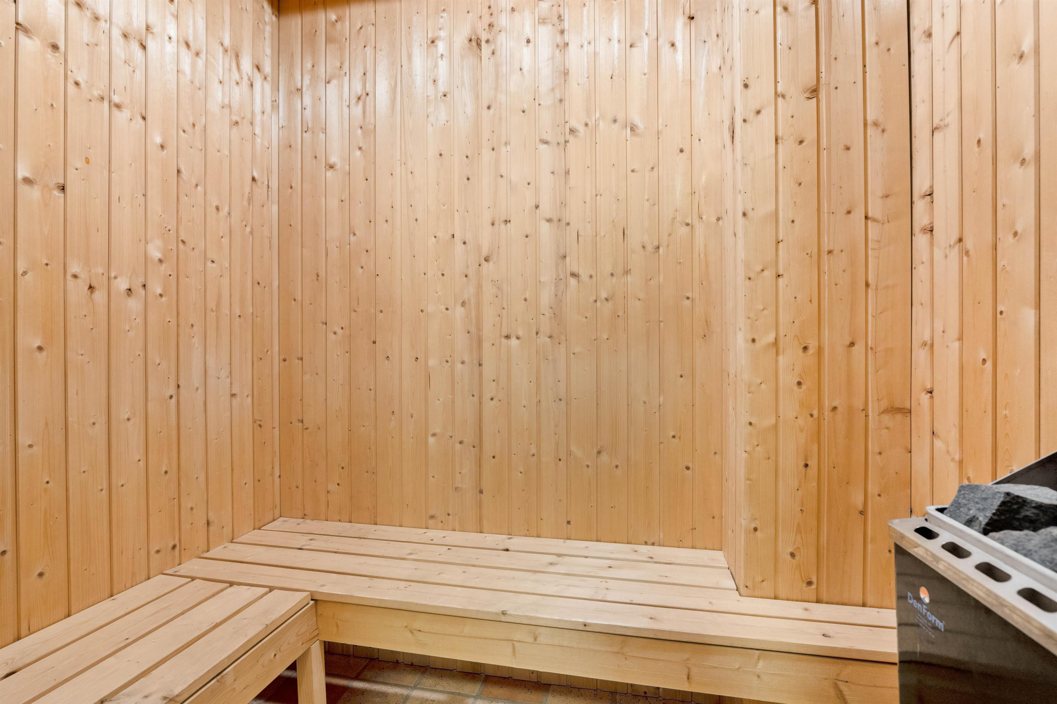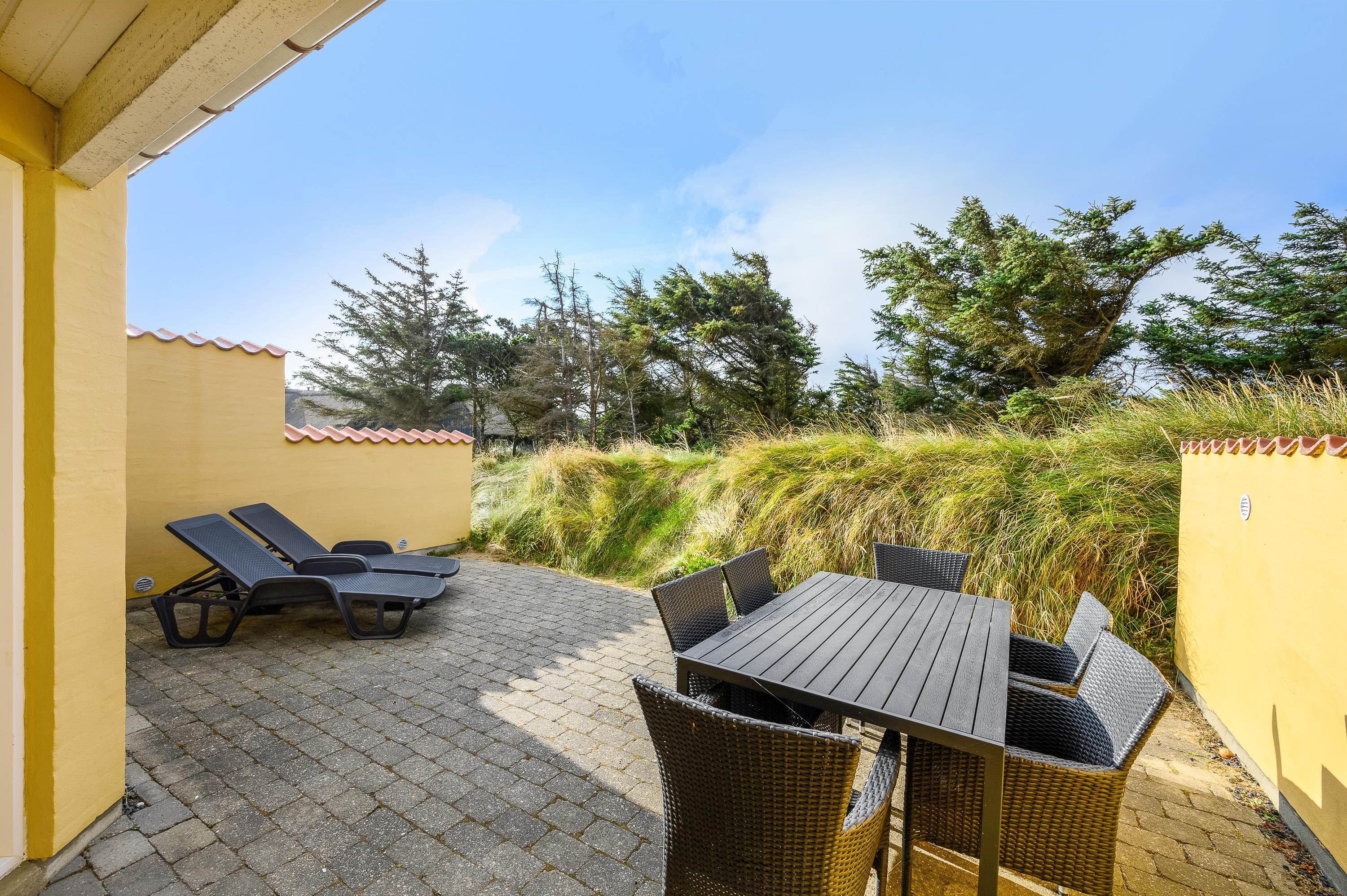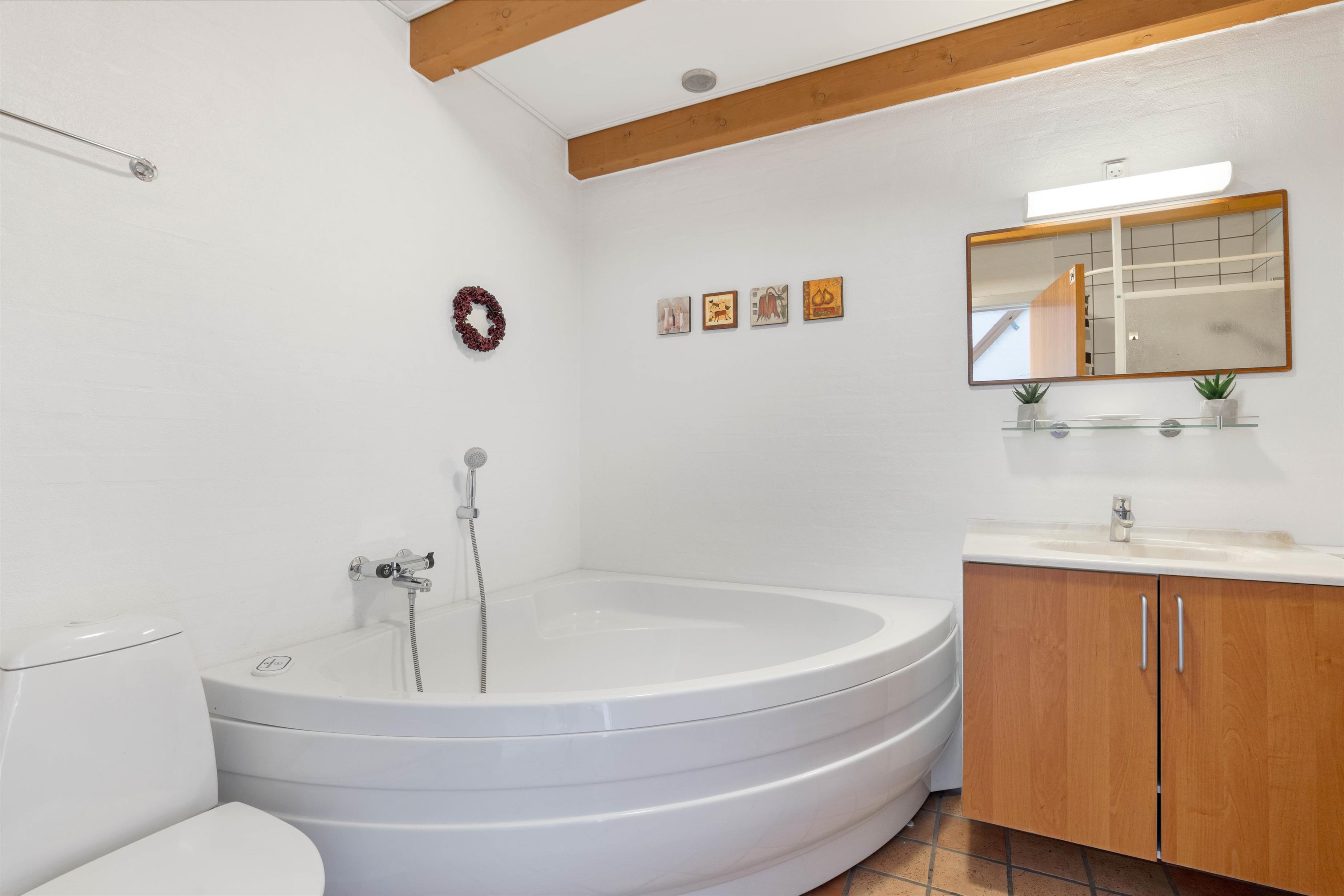 Feriehuset har hele to badeværelser. Badeværelset i stueplan er med gulvvarme. Desuden er det ene badeværelse indrettet med både spabad og sauna, hvor I rigtigt kan mærke følelsen af velvære og ferie. Og hvis I vil ud at nyde det gode vejr, så har feriehuset en lækker læfyldt terrasse, hvor der både står diverse havemøbler og en grill til rådighed. Her kan I læne jer tilbage i én af liggestolene med en øl i hånden eller trække markisen ud for at få lidt skygge.