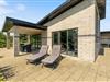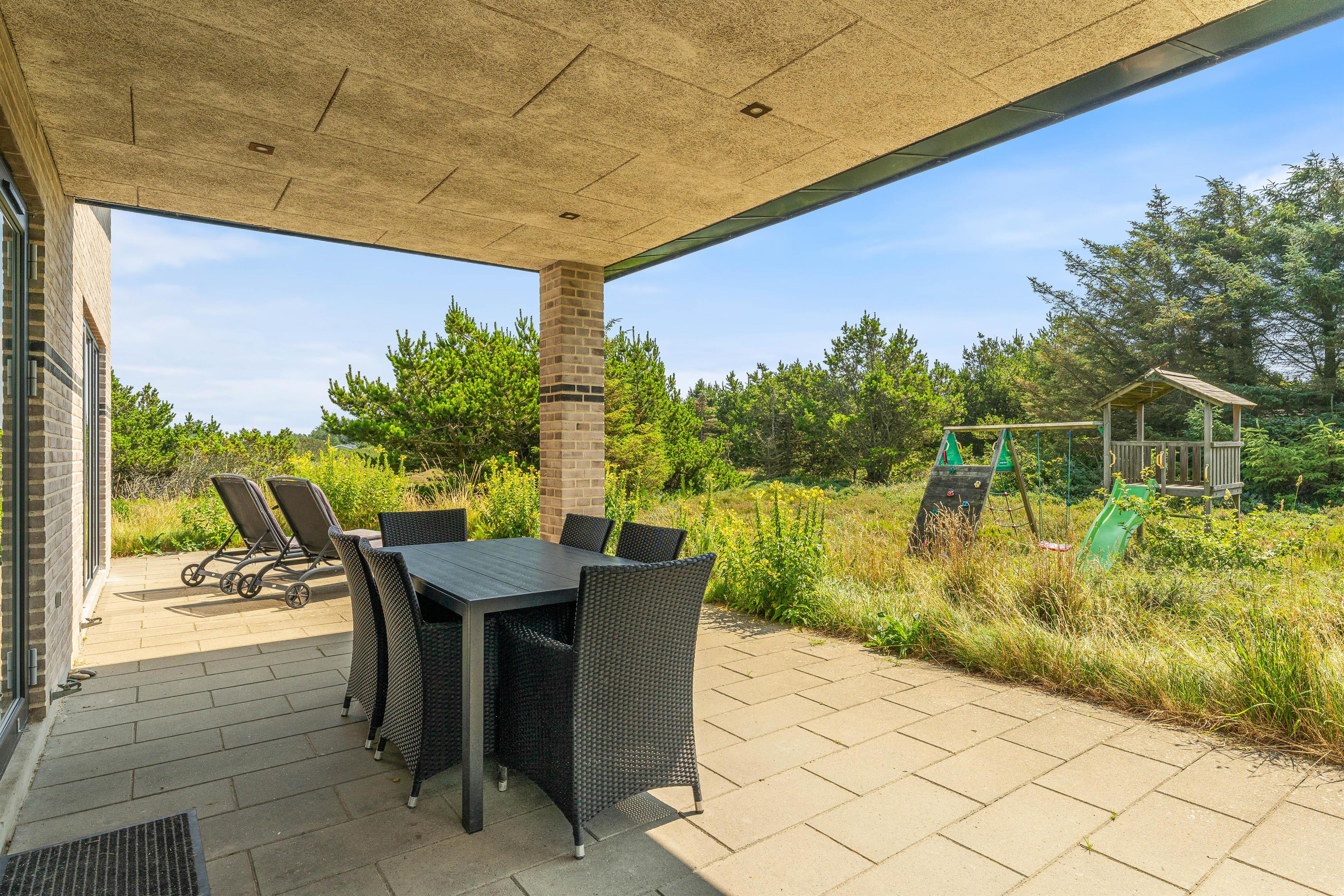 Feriehuset ligger på en 2.566 kvadratmeter stor naturgrund, hvilket giver jer et stort uderum til både leg og afslapning. Den store terrasse har flere siddekroge og overdækkede dele med spots i loftet, så I kan nyde de lune sommeraftener udenfor, selv efter mørket falder på.