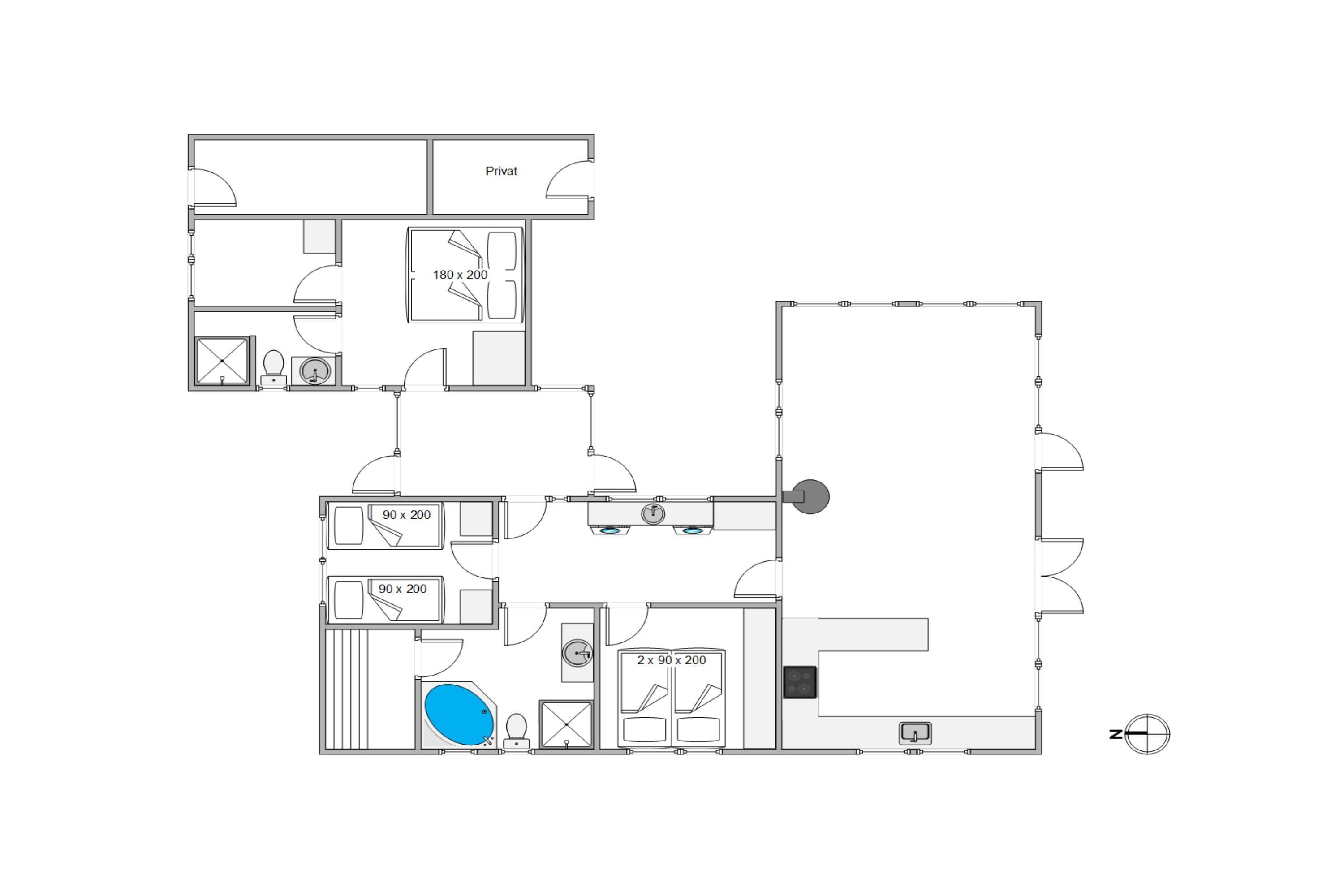 To af de tre soveværelser har eget tv, og huset har to badeværelser, det ene med direkte tilgang fra soveværelset. På det største badeværelse finder I den lille wellnessoase med sauna og spabad, hvor I kan tanke nye kræfter efter en gåtur langs vandet.