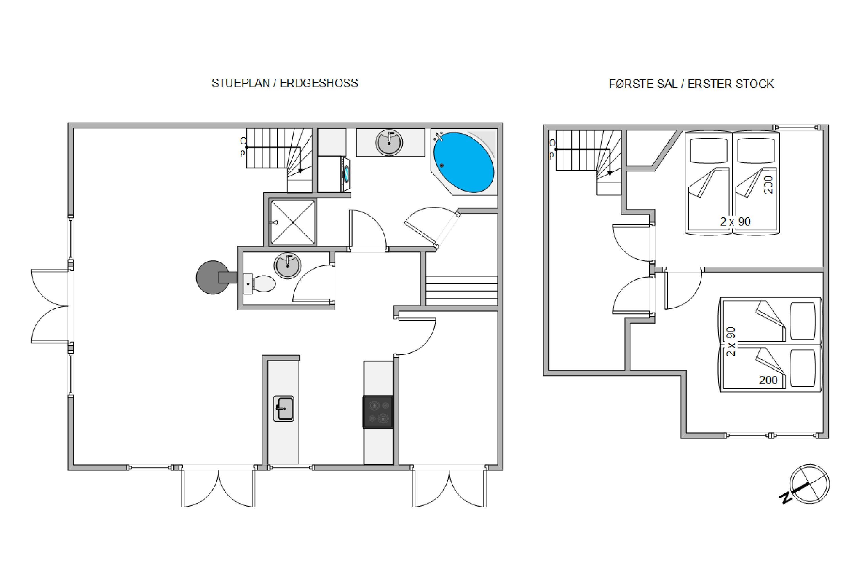 Lige så snart I træder ind adf hoveddøren, bliver I mødt af en hyggelig feriestemning, og I vil straks føle jer hjemme. Den 76 m² store ferielejlighed rummer 2 gode soveværelser og 1 badeværelse. De to soveværelser er begge indrettet med 2 enkeltsenge, der er sammensat til dobbeltsenge. I stueetagen finder I ferielejlighedens badeværelse, hvor der er indlagt gulvvarme, så I skal ikke bekymre jer om kolde fødder. På badeværelset finder I også en sauna og et spabad, så her er rig mulighed for at komme helt ned i gear og blive varmet godt igennem.