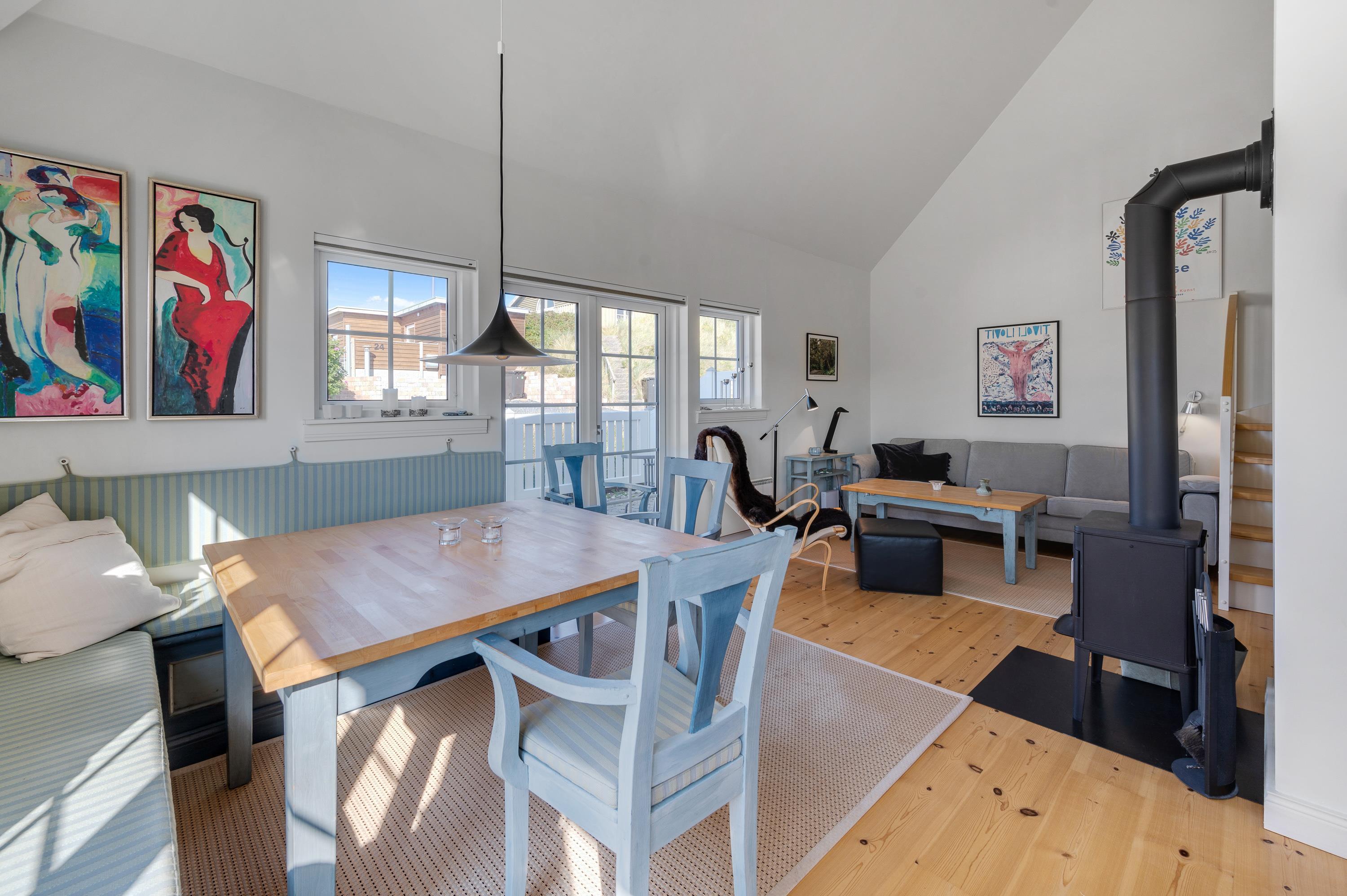 Hjertet og det store samlingspunkt i lejligheden, alrummet, finder I i ferielejlighedens stueplan. Her er der åben forbindelse mellem køkken, stue og spisestue, så I kan nyde hinandens selskab, selvom nogle står for madlavningen i køkkenet, mens andre ser tv i stuen. I alrummet er der desuden en brændeovn, der fuldender den hyggelige feriestemning og spreder dejlig varme.