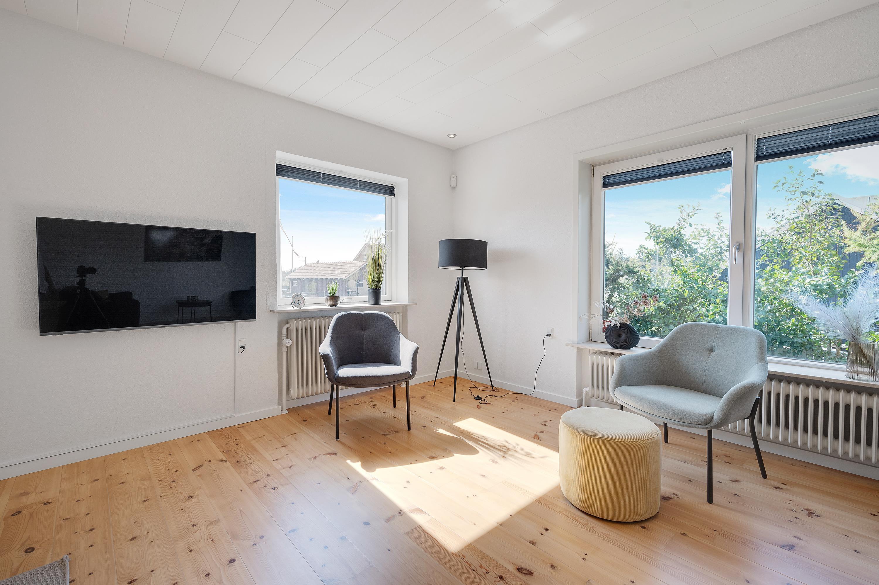 Feriehuset ligger lidt tilbagetrukket fra landevejen og kan danne udgangspunkt for mange udflugter i området langs den jyske vestkyst. Selve feriehuset har en hyggelig og venlig indretning, hvor køkkenet er i åben forbindelse med stuen. Her kan I sidde og slappe af foran tv'et og planlægge feriens aktiviteter.