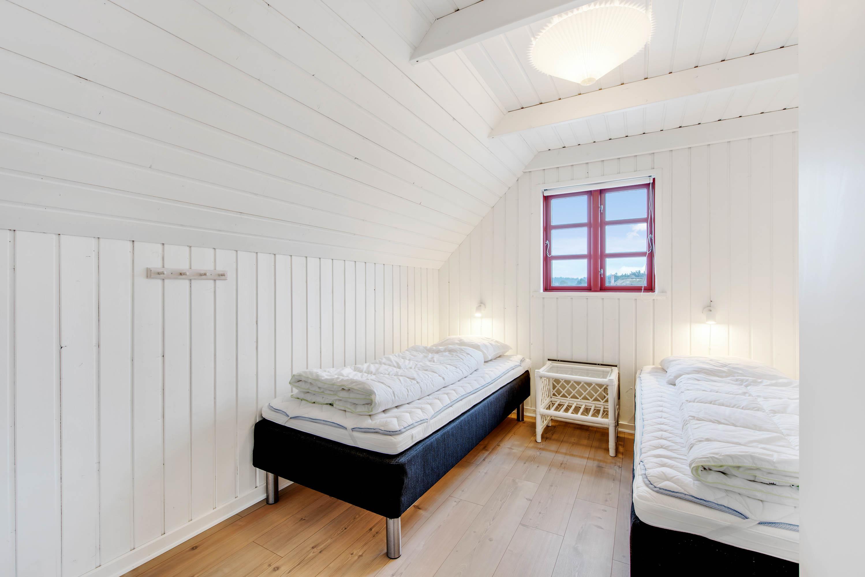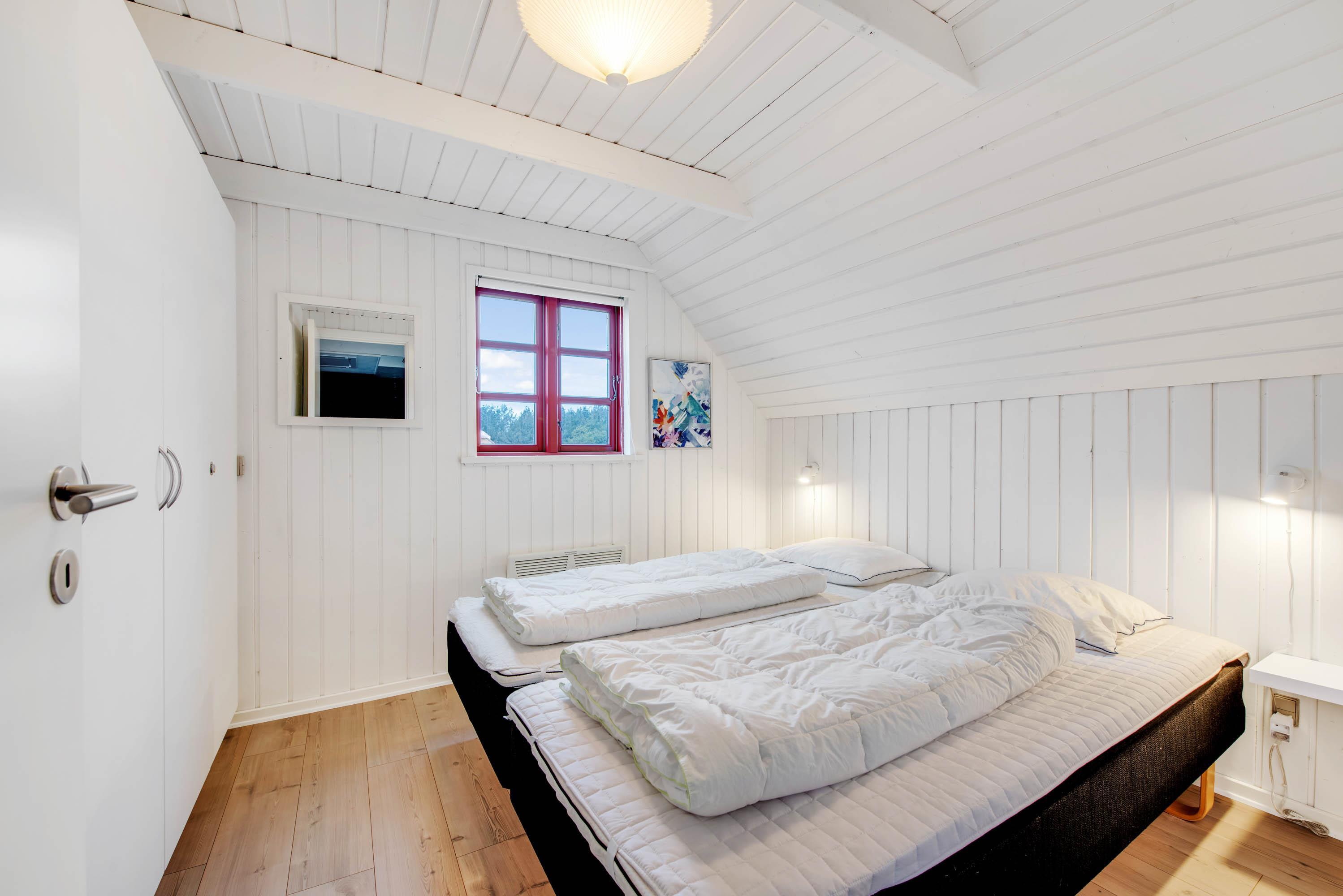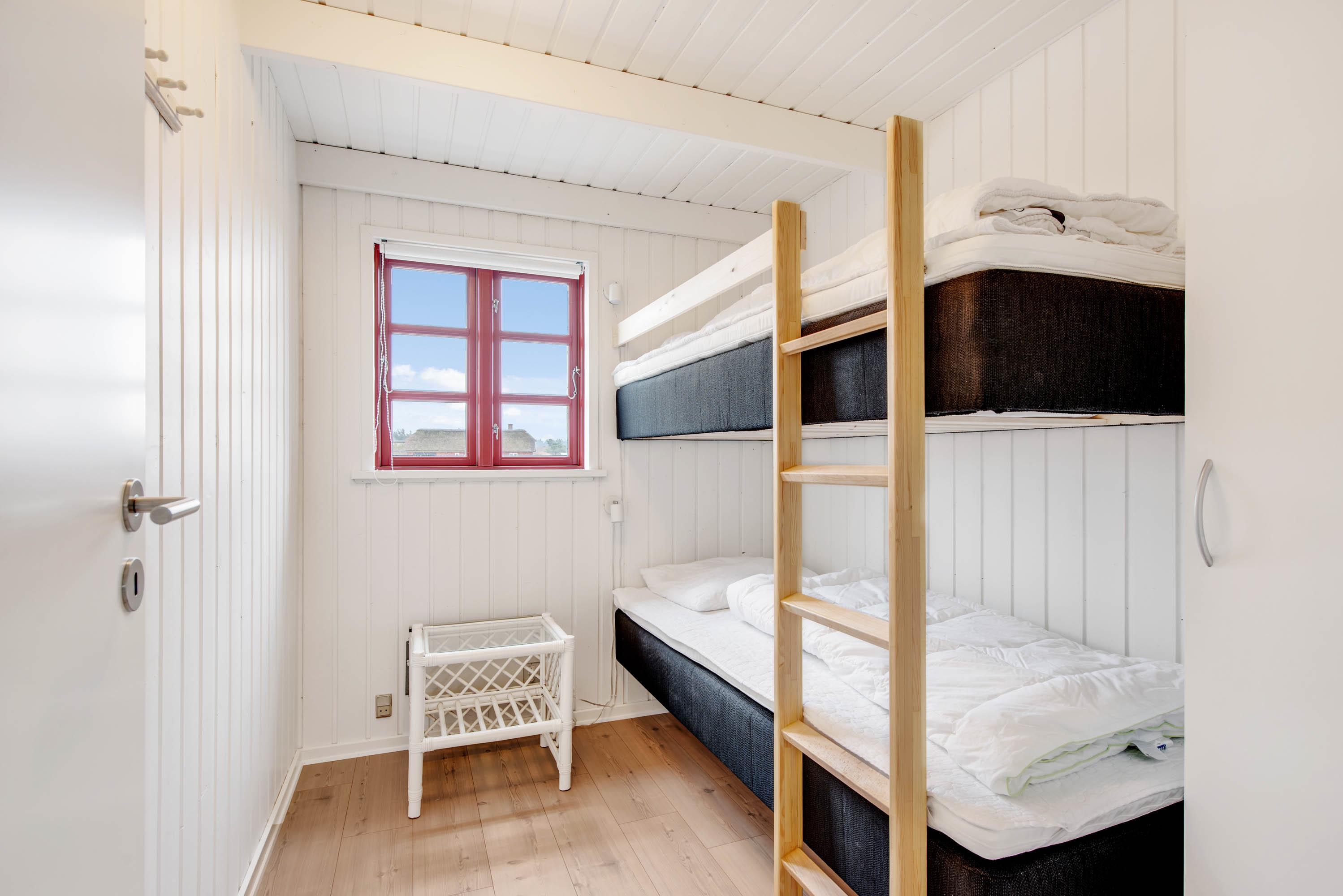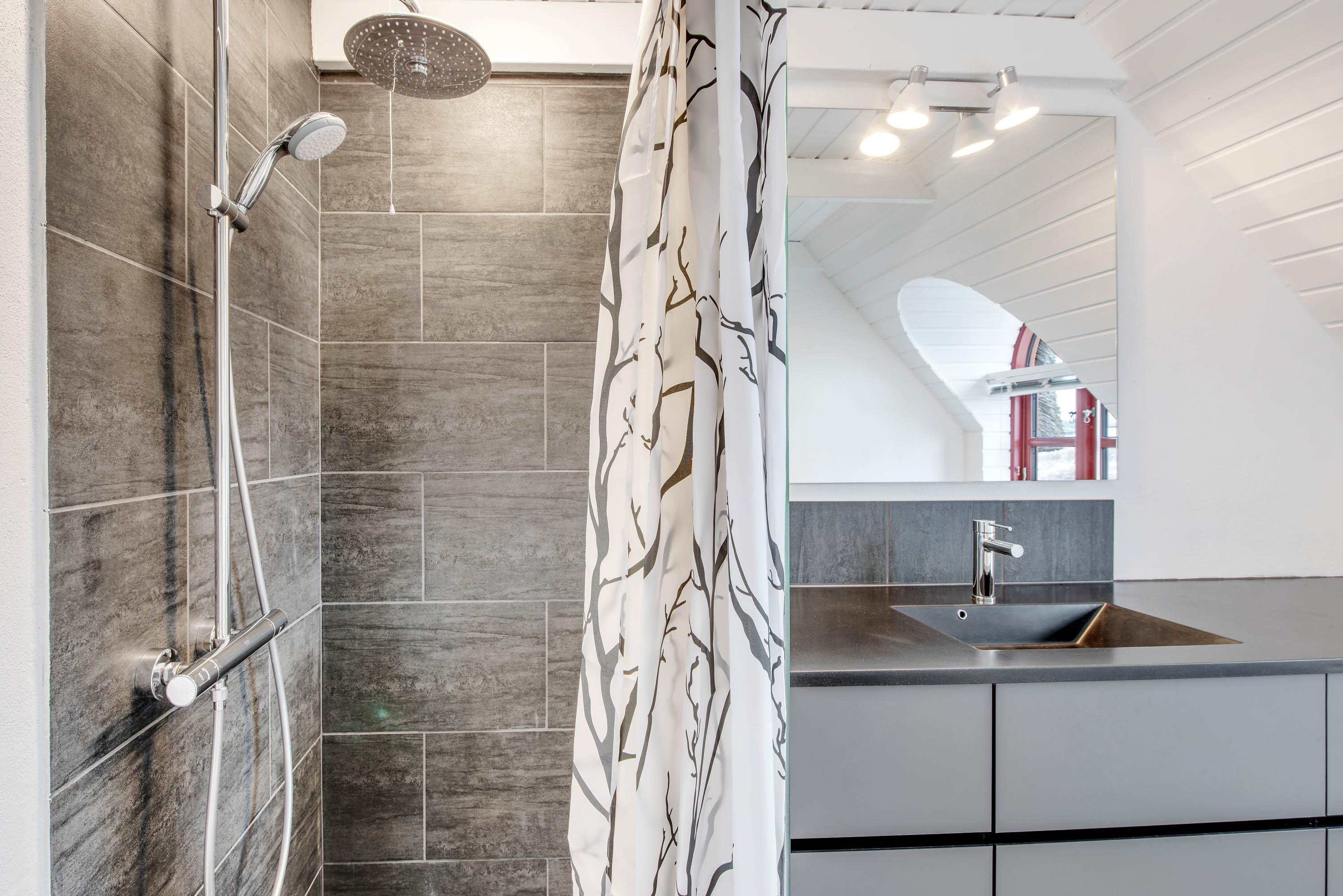 Badeværelset er lyst og moderne, og her er der ingen bekymring for kolde fødder takket være gulvvarmen. I sommerhuset er der desuden tre soveværelser – et med dobbeltseng, et med køjesenge og et med to enkeltsenge.