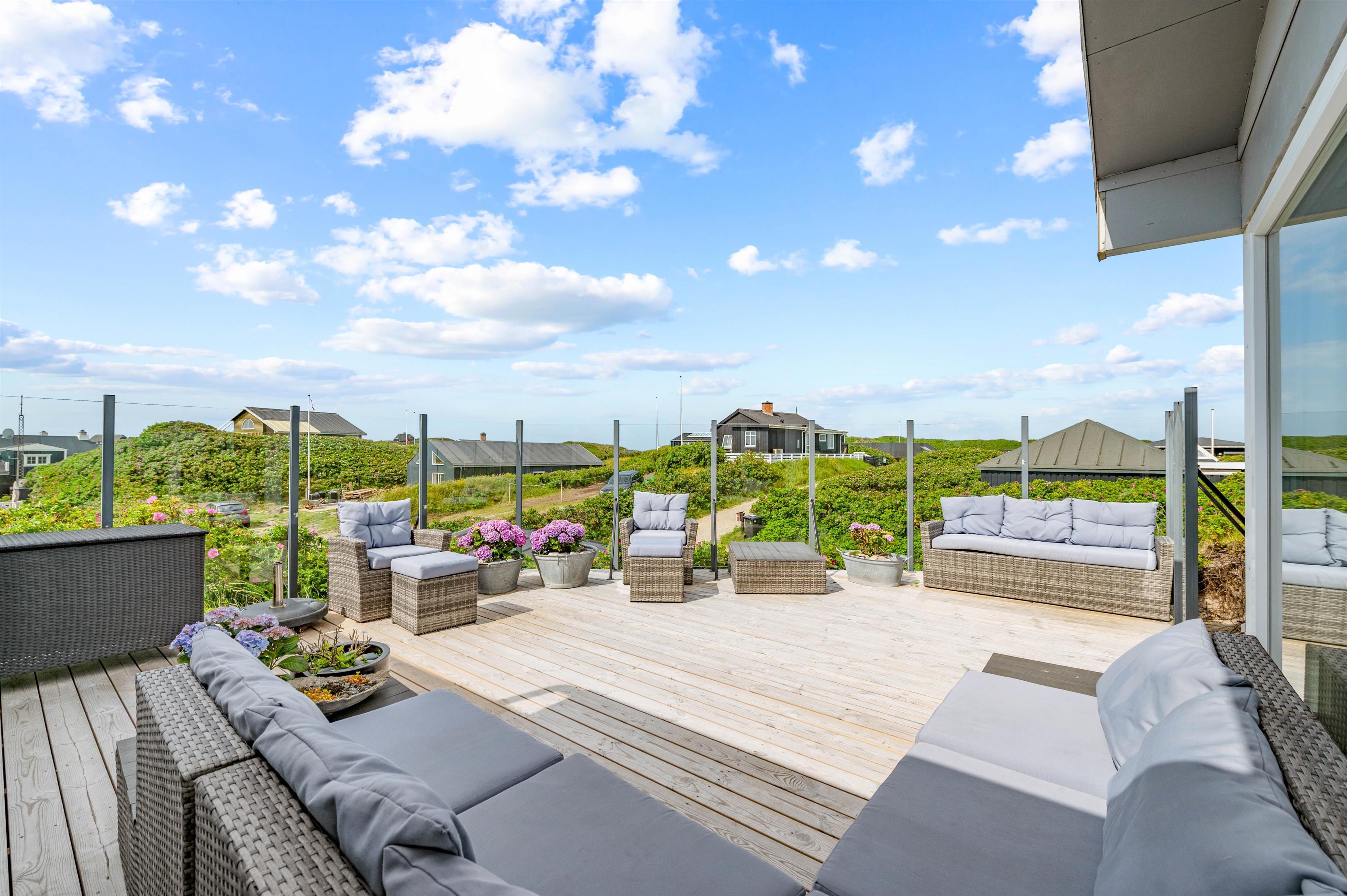 Flere små udendørs hyggekroge og panoramaudsigt over Søndervig