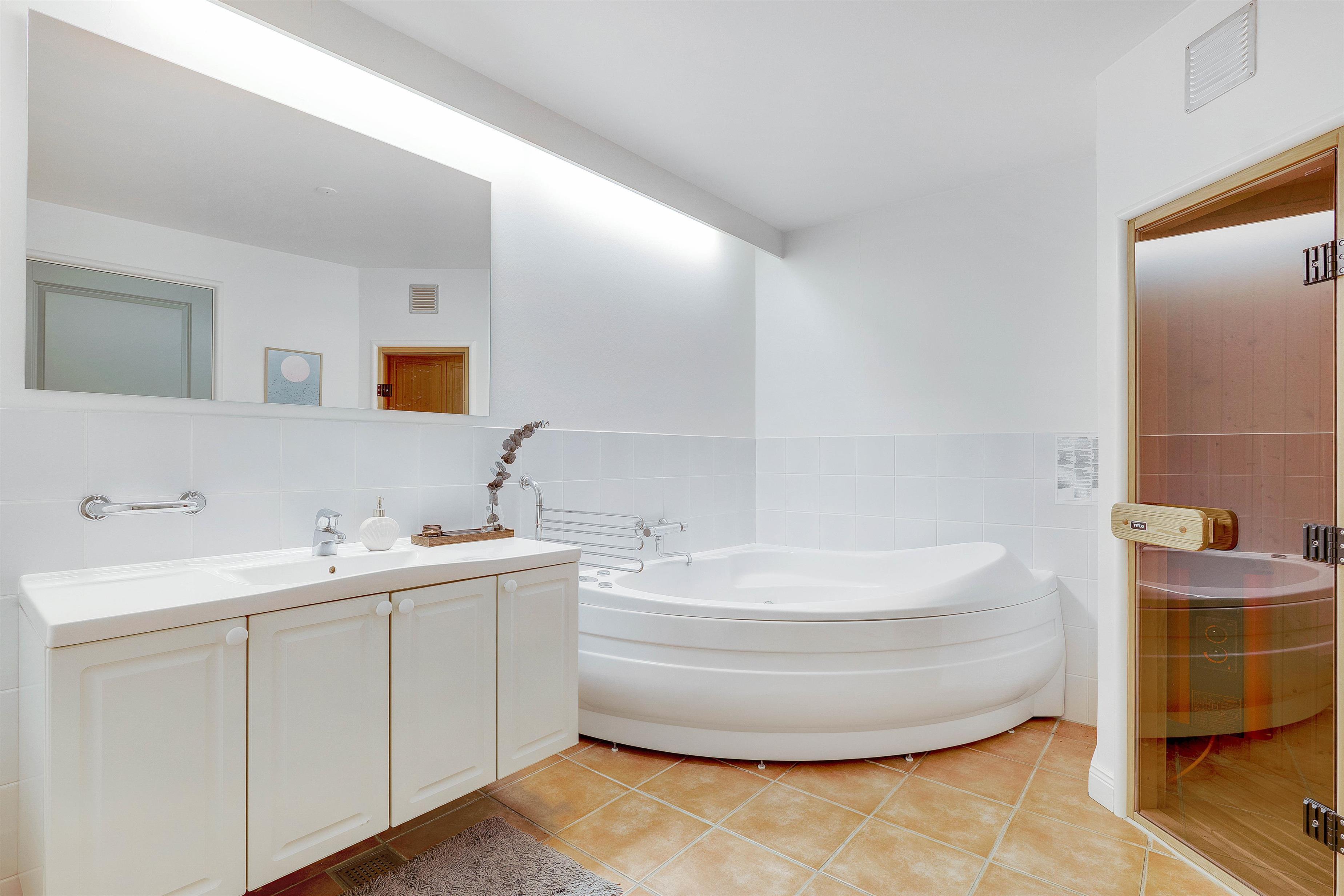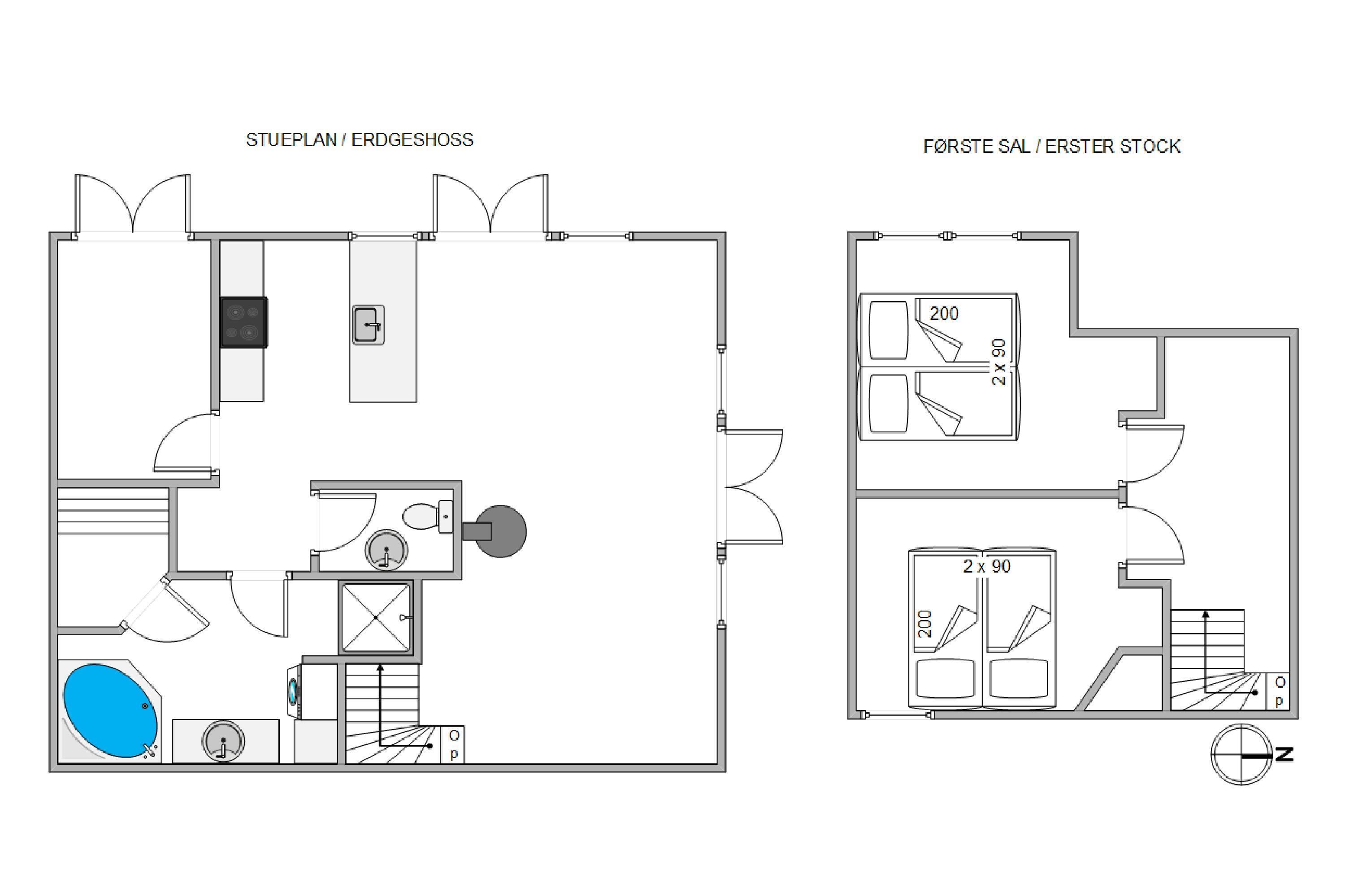 Stue- og spiseafdelingen med integreret køkken ligger på stueetagen og fungerer som lejlighedens hjerte og familiens mødested på ferien. Her kan I planlægge feriens næste aktiviteter. Derudover er der både et stort badeværelse og et gæstetoilet, hvor der er gulvvarme, så I ikke skal bekymre jer om kolde fødder om morgenen. I det store badeværelse finder I også en sauna og spabad, hvor I rigtig kan slappe af og blive ordentlig gennemvarmet. Soveværelserne befinder sig på første sal.