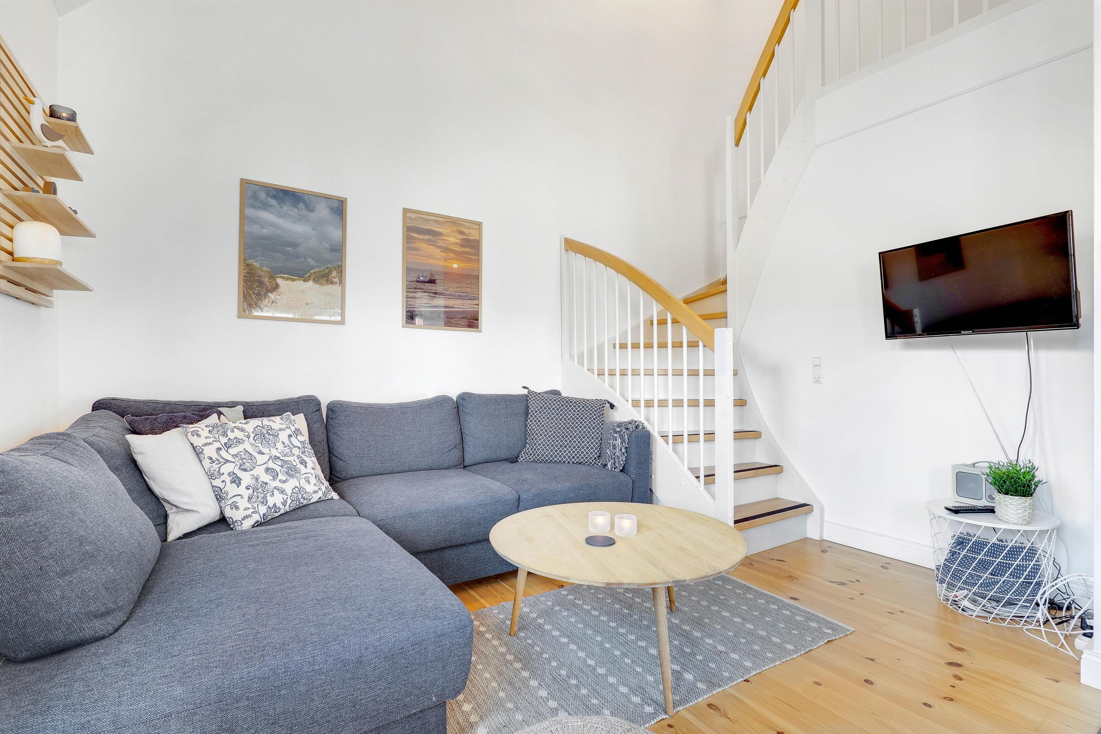Indretningen er lys, hyggelig og stilren, og der er skabt en harmonisk sammenhæng mellem de forskellige rum. I stuen kan I nyde brændeovnens varme og hyggelige atmosfære, perfekt til rolige aftener foran flammerne. Som alternativ kan lejlighedens luft-til-luft varmepumpe sikre en behagelig og energibesparende temperatur.