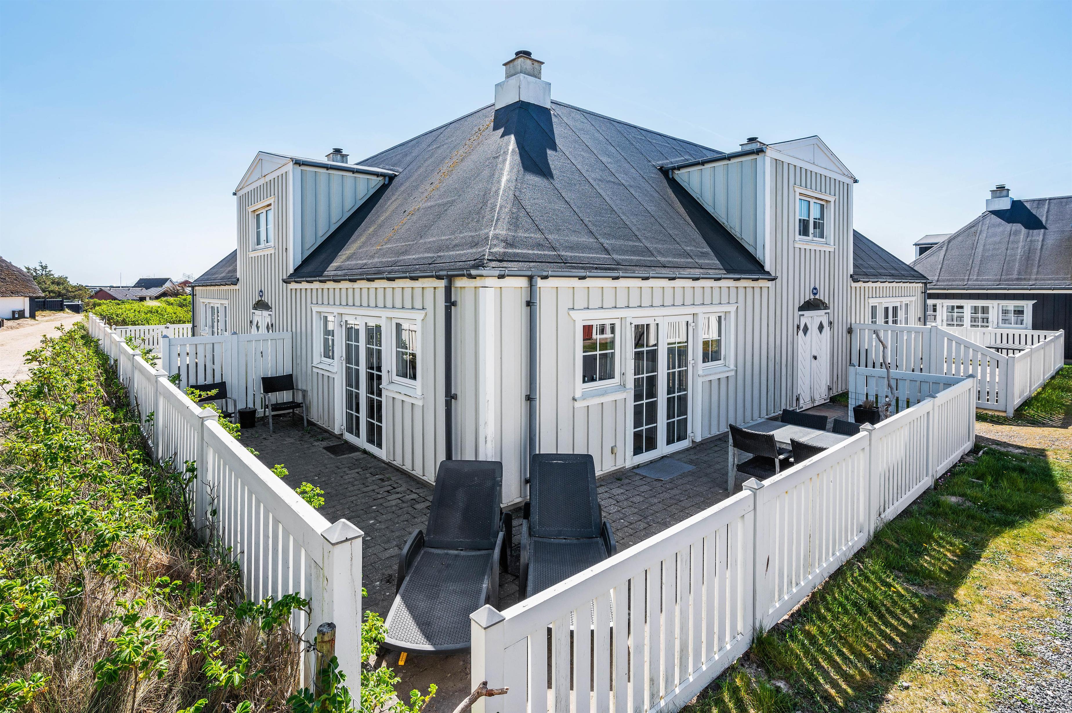 Fra stuen er der 2 udgange til terrassen, som er udstyret med gode havemøbler, liggestole og en grill. Her står intet i vejen for en dejlig sommerdag med solbadning og derudover kan I nyde et godt måltid tilberedt over grillen.