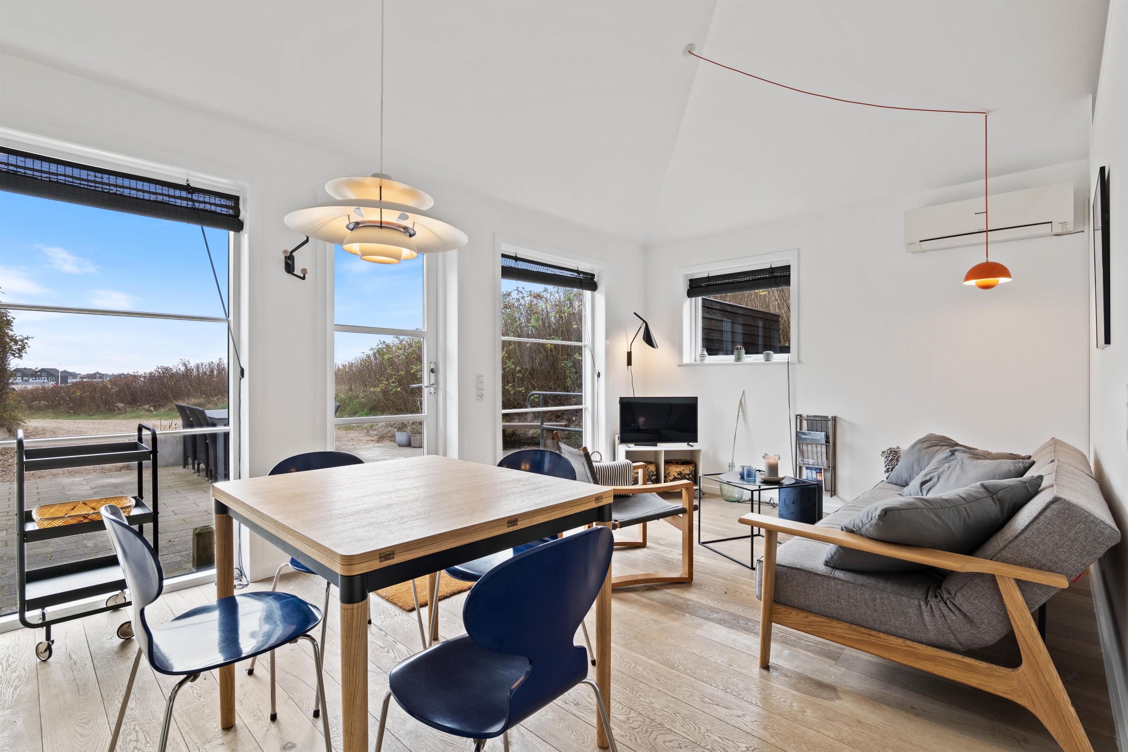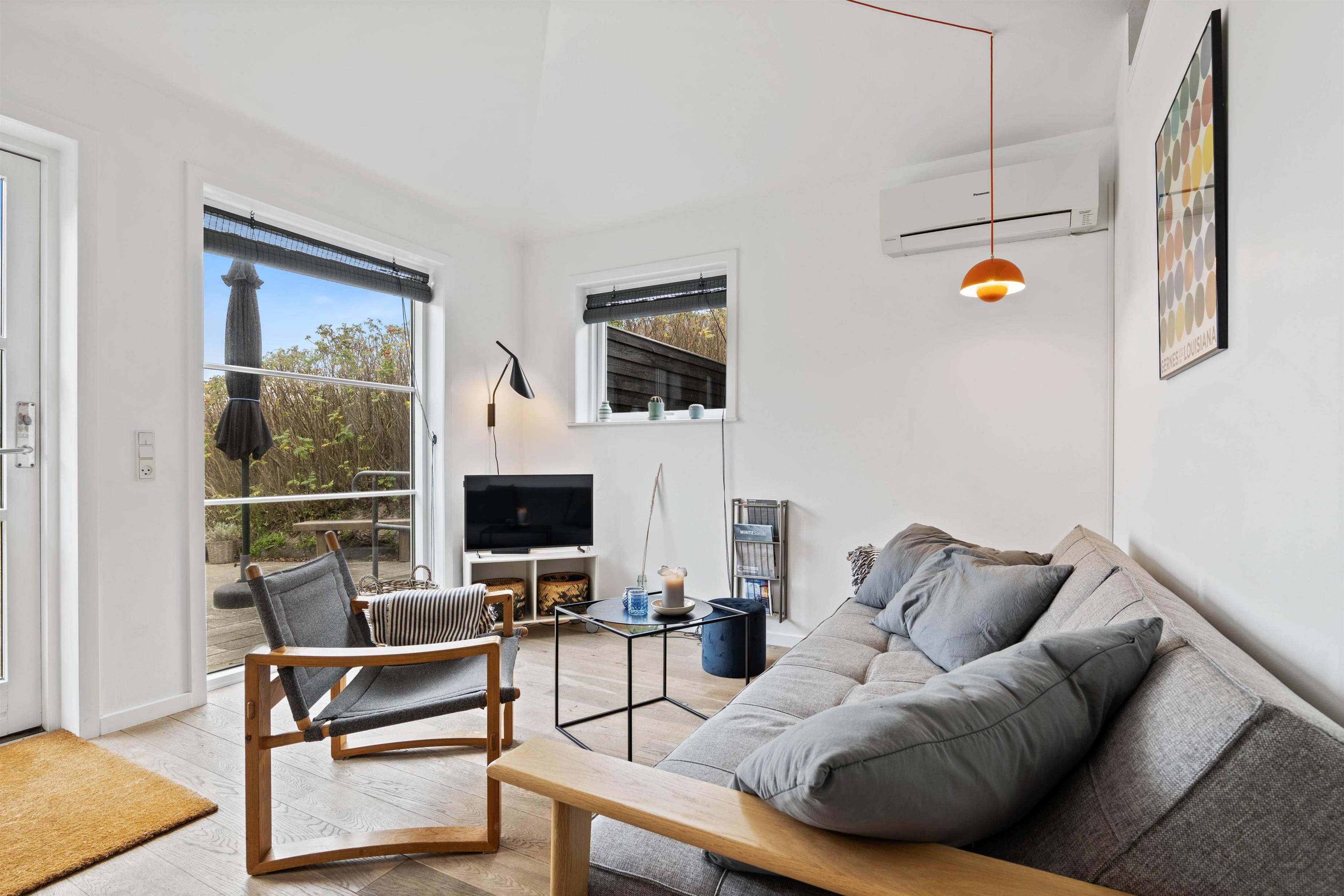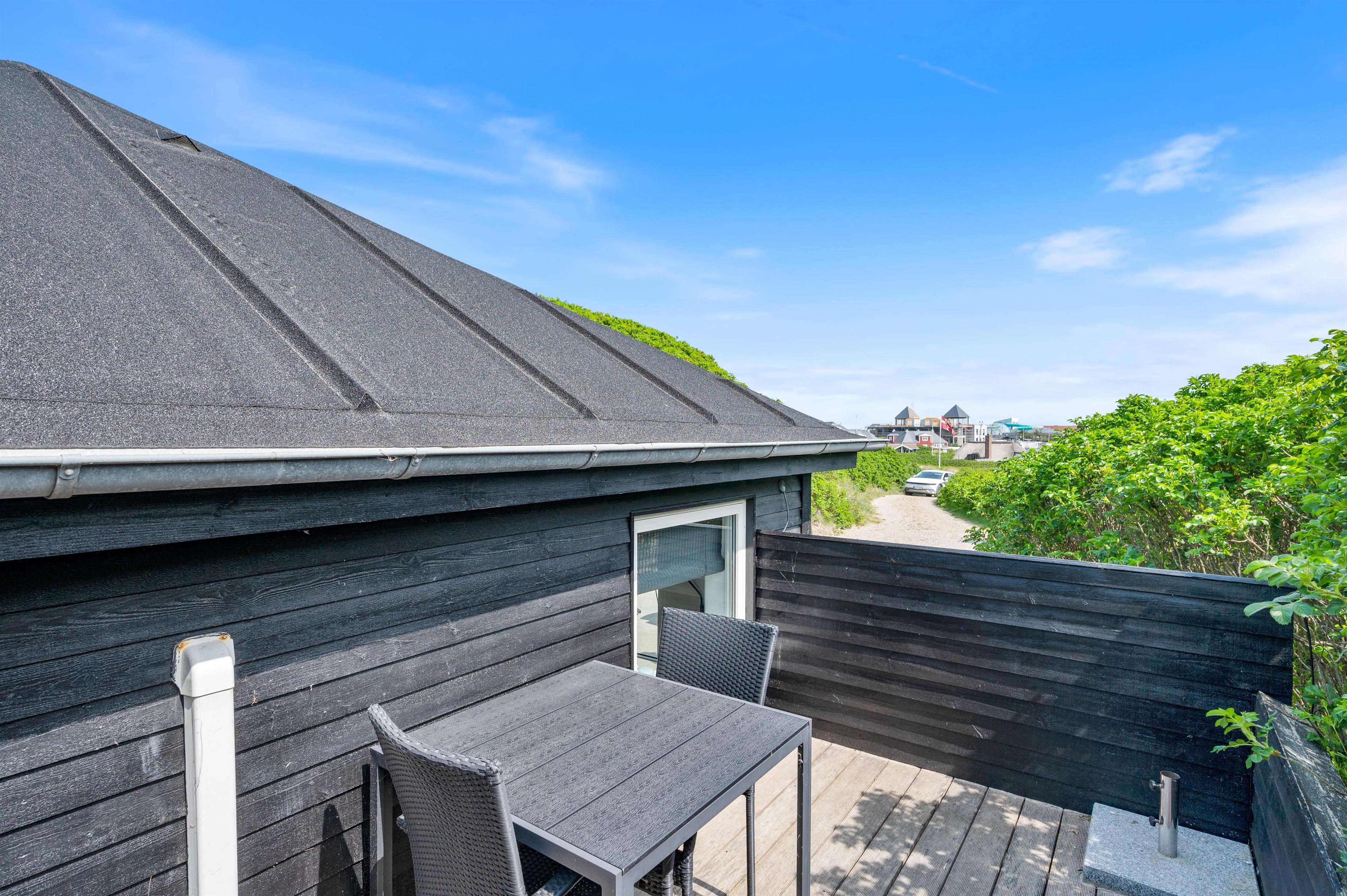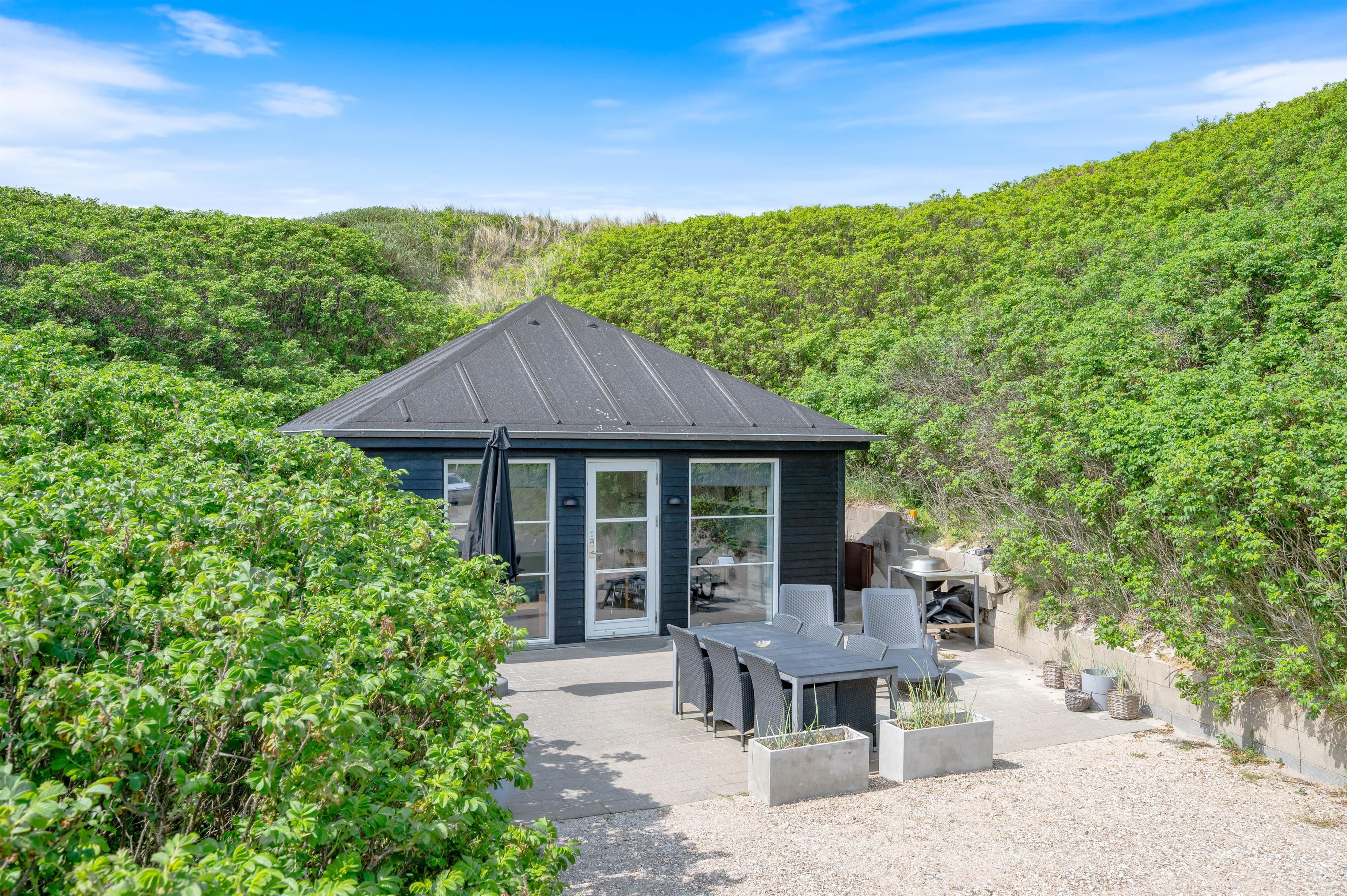For at komme ned til sommerhuset skal du ned ad en lille grusvej. På en vindstille dag kan du sidde på terrassen helt uforstyrret og lytte til det brusende vand på den anden side af klitten. Terrassen er naturligvis møbleret med havemøbler, liggestole og grill. Perfekt til hyggelige grillaftener i godt selskab med familien.
