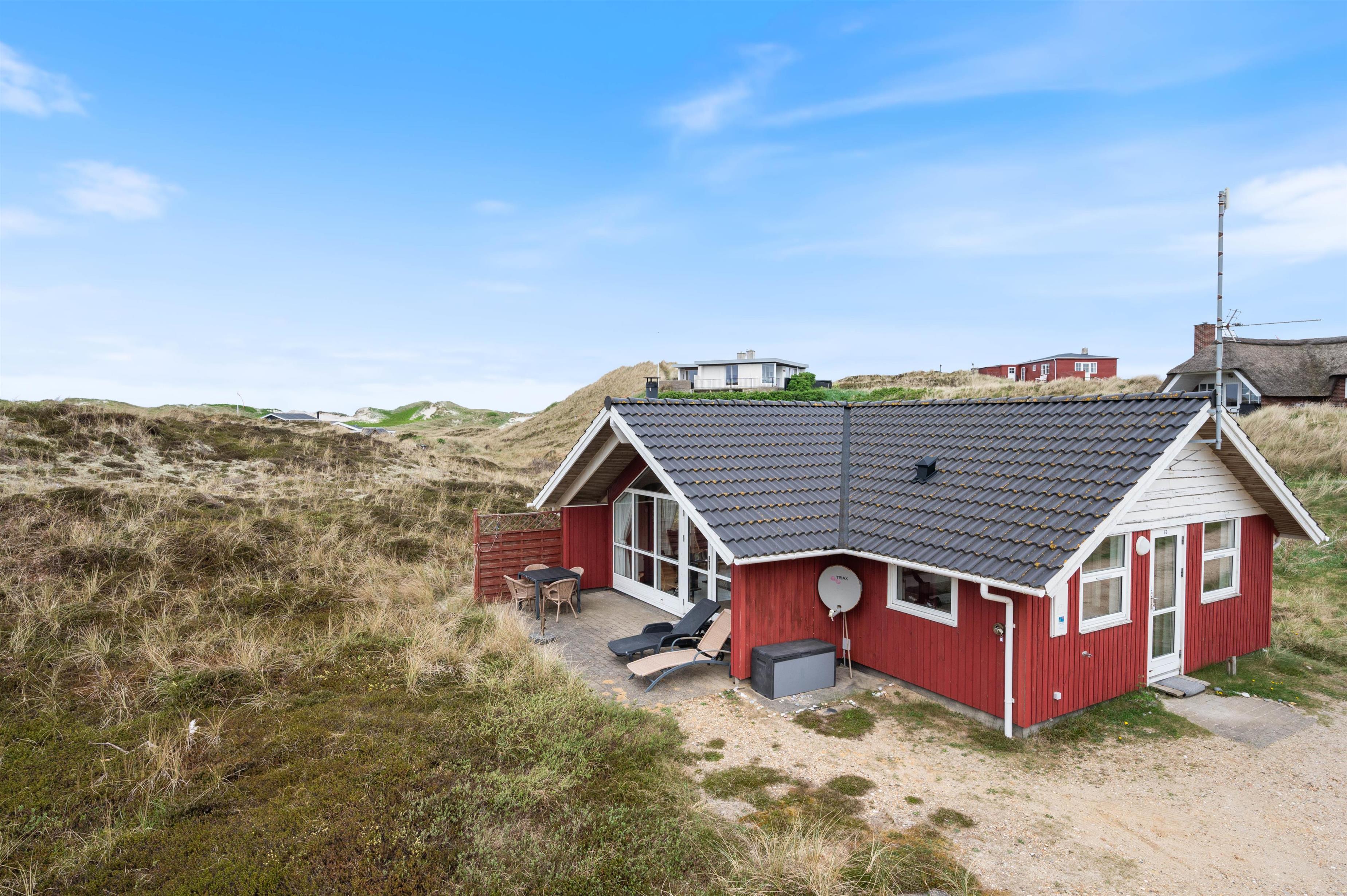 Sommerhuset på Marehalmen 69 har en helt særlig beliggenhed midt i klit- og hedelandskabet og kun 300 meter fra Vesterhavet. I kan med andre ord nyde dagens første kop kaffe på terrassen til lyden af Vesterhavets blide sang i baggrunden. Bedre start på dagen findes ikke. For de morgenfriske vandhunde bør hver dag naturligvis indbefatte en svømmetur i Vesterhavet.