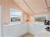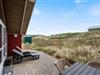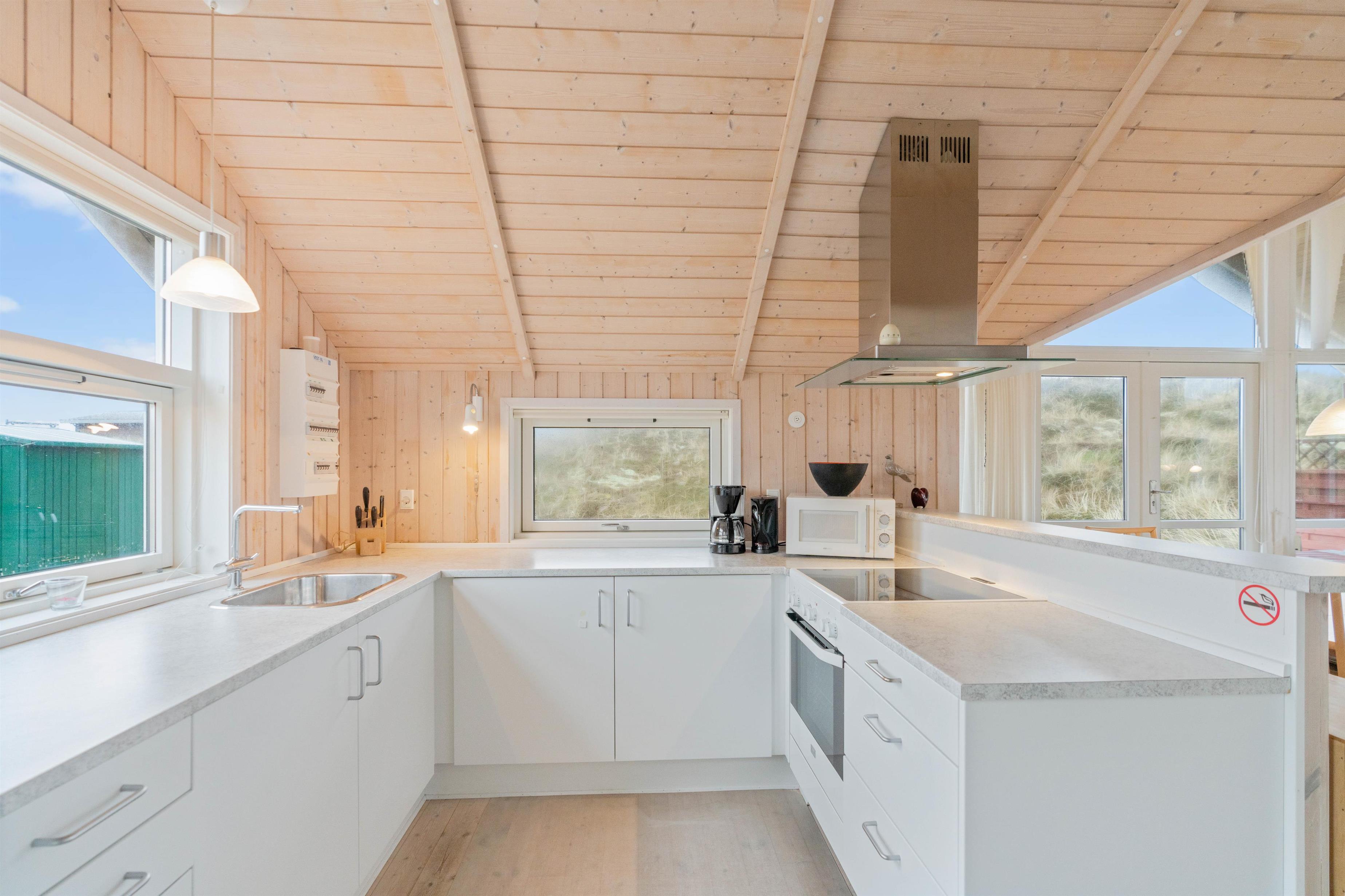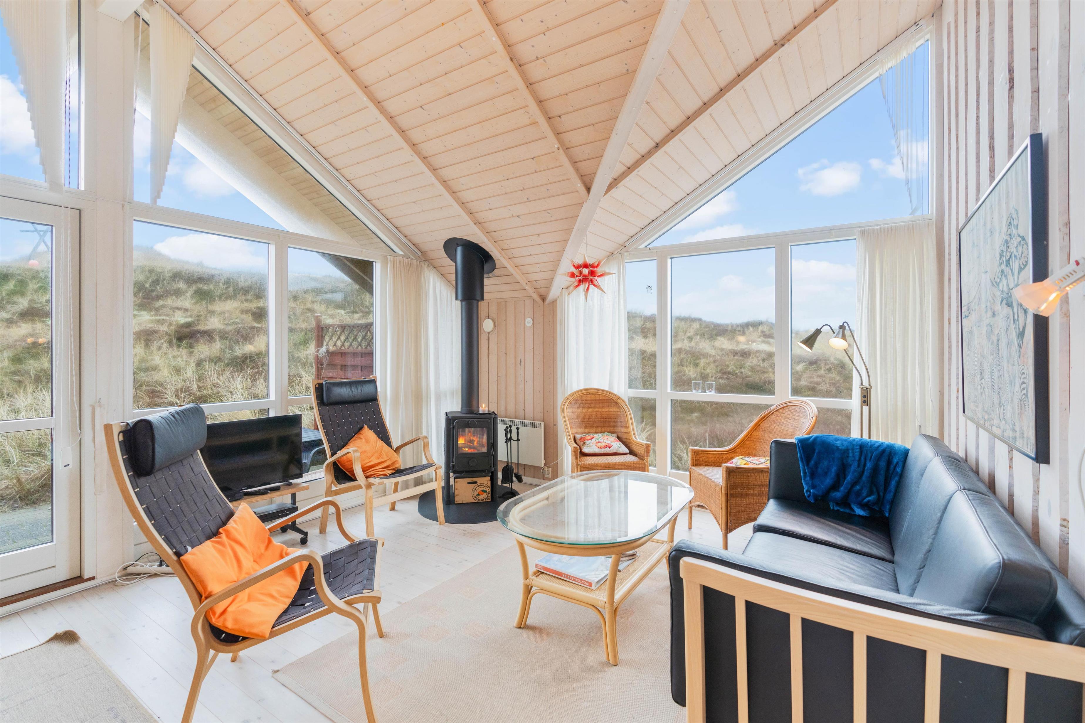 Det store opholdsrum er præget af to store vinduespartier, der bader rummet i lys. Men ikke nok med det, så inviterer vinduerne udsigten helt indenfor, så det føles som om, man befinder sig midt i klitterne. Det giver en helt særlig ro, og I vil helt sikkert mærke både puls og skuldre sænke sig.