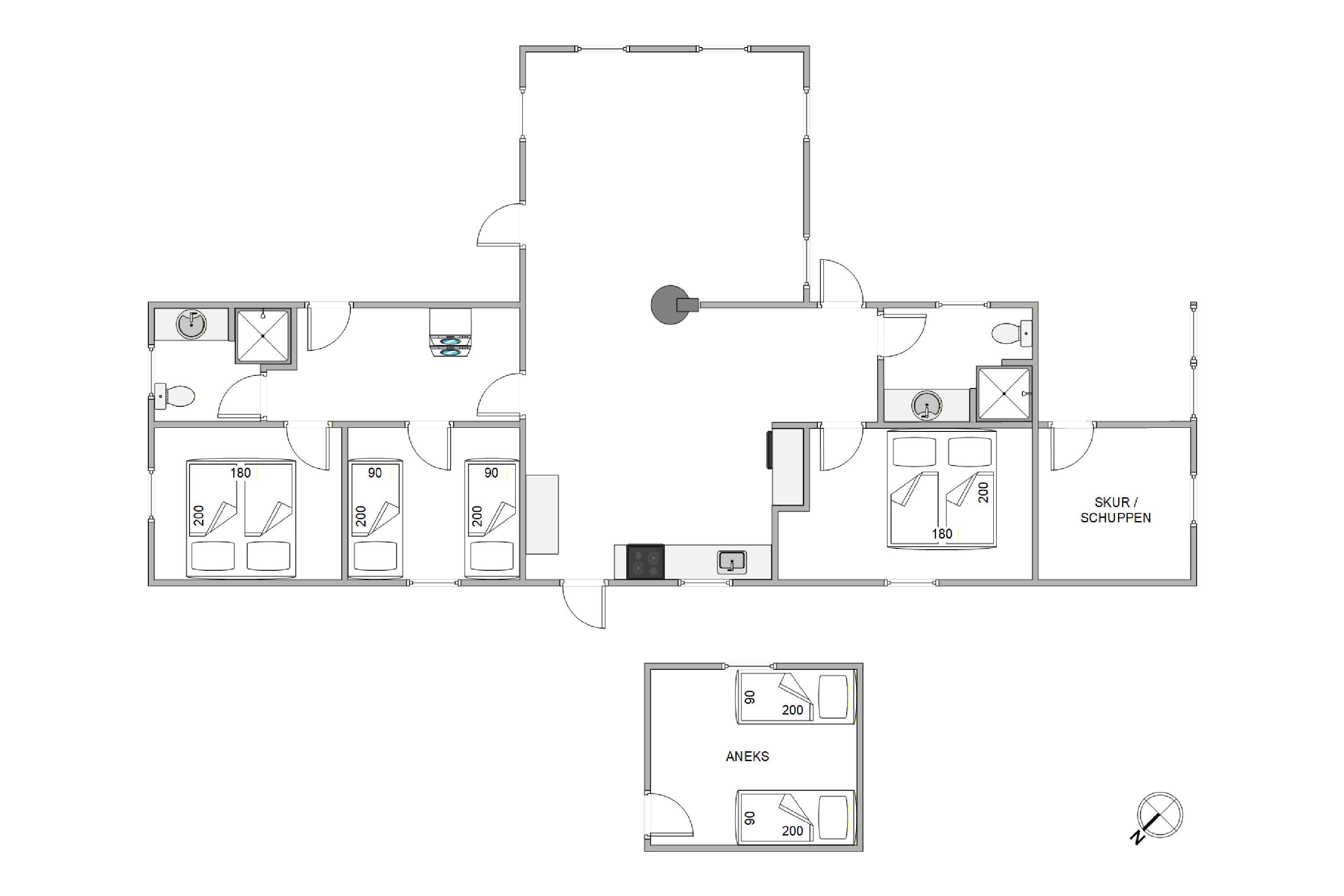 Sommerhuset byder på 3 lyse og rummelige soveværelser hvoraf 2 af soveværelserne er indrettet med dobbeltseng, og i det sidste soveværelse i hovedhuset finder I 2 enkeltsenge. Det 4. soverum er i annekset, hvor I finder 2 enkelsenge. Her er der rig mulighed for at slappe af og lade op efter en dag fyldt med oplevelser ved Vesterhavet. Som ekstra komfort råder sommerhuset over to moderne badeværelser begge med behagelig gulvvarme, så dagen kan startes og sluttes på den mest komfortable måde.