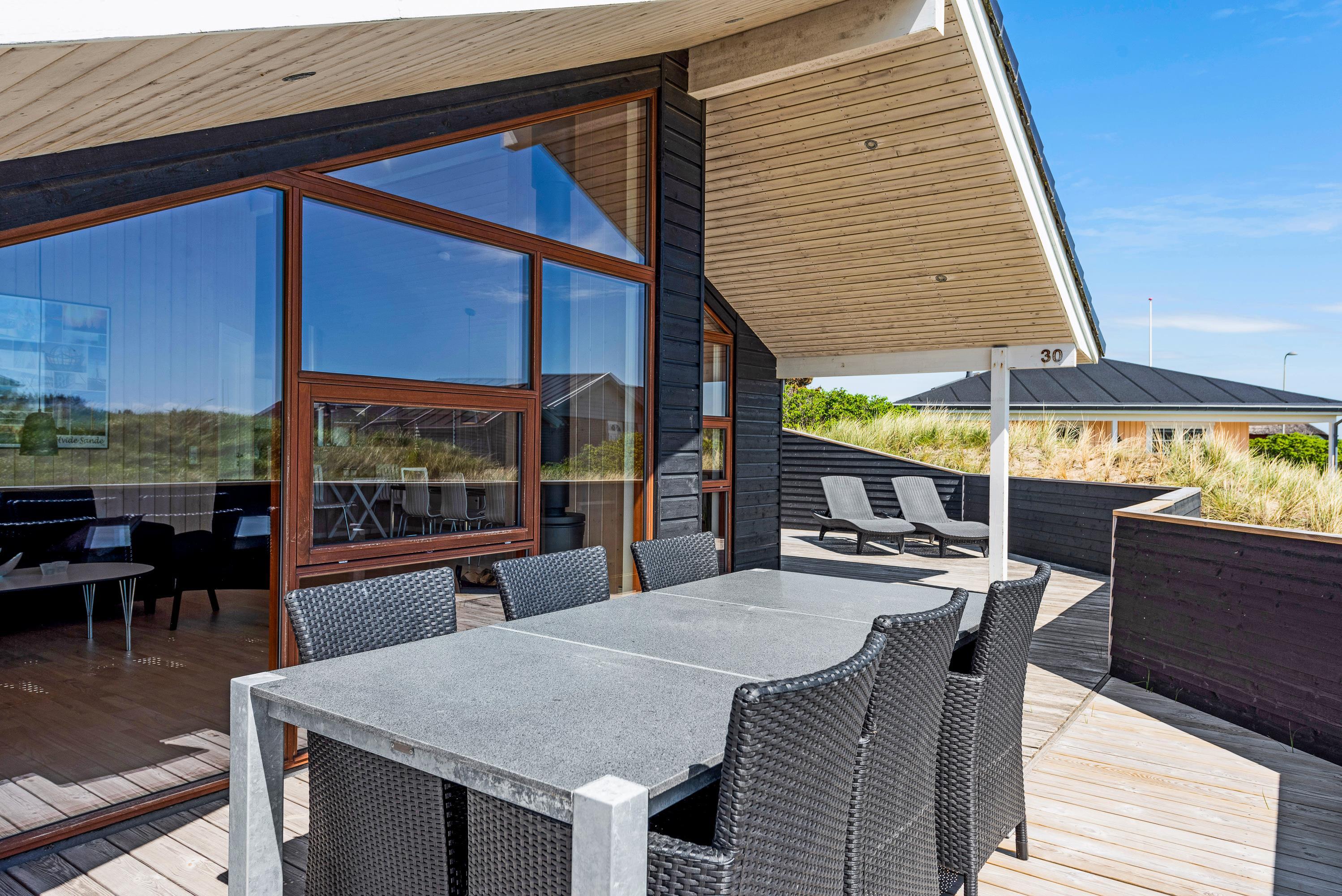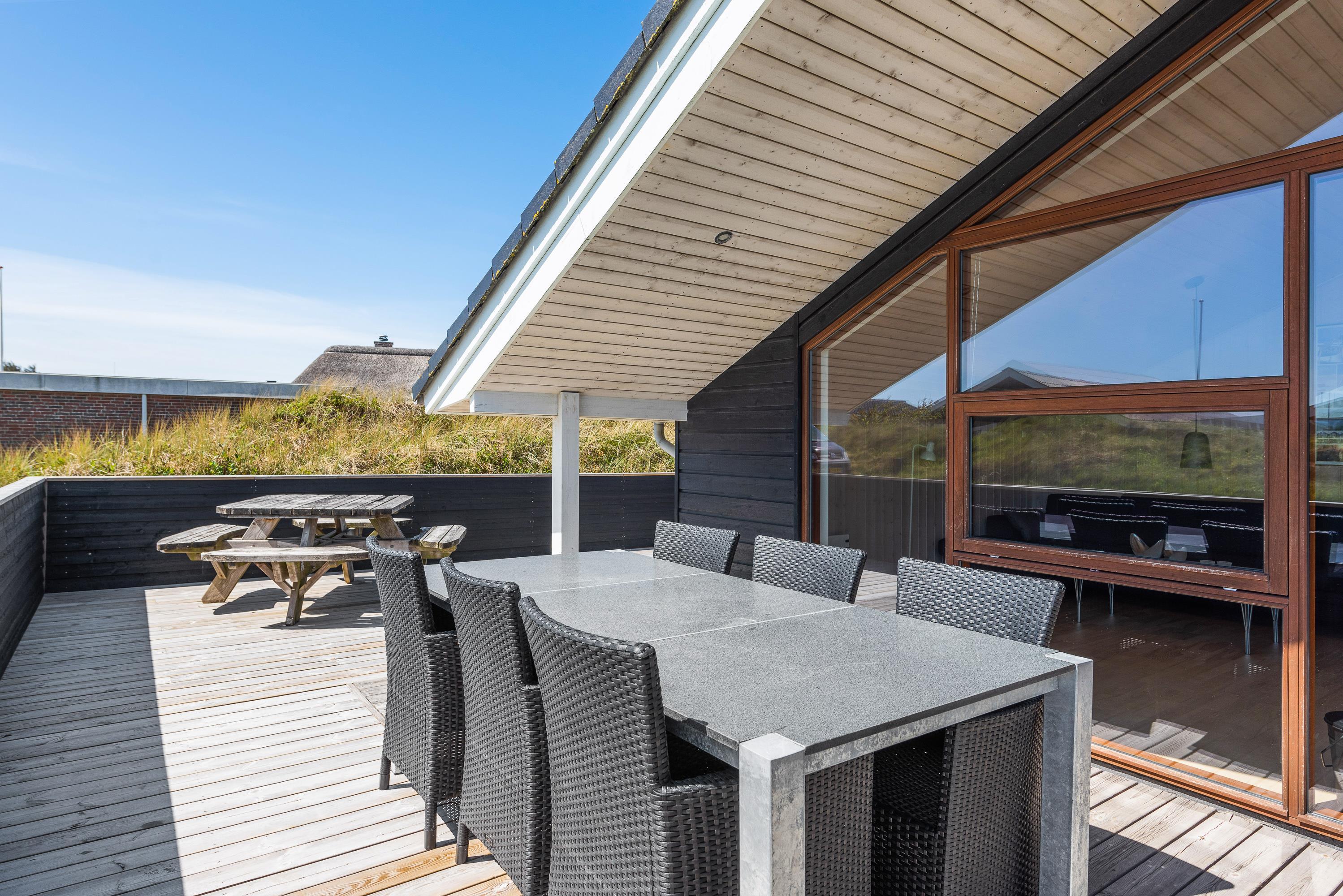 Rundt om huset her på Nordsøvej 30 i Søndervig er der på de tre sider træterrasse, og man kan altid finde sol og et læ-hjørne. Den ultimative nydelse må være en skøn grill middag på terrassen, for derefter at hoppe i udespaen og derfra nyde solnedgangen over klitterne – måske med et glas rosé – og med Vesterhavets brusen i baggrunden. Efter en lang tur på stranden kan I skylle fødderne af under udebruseren, der er til rådighed fra april til november. Afslutningen på en god dag kan være en tur i udesaunaen.