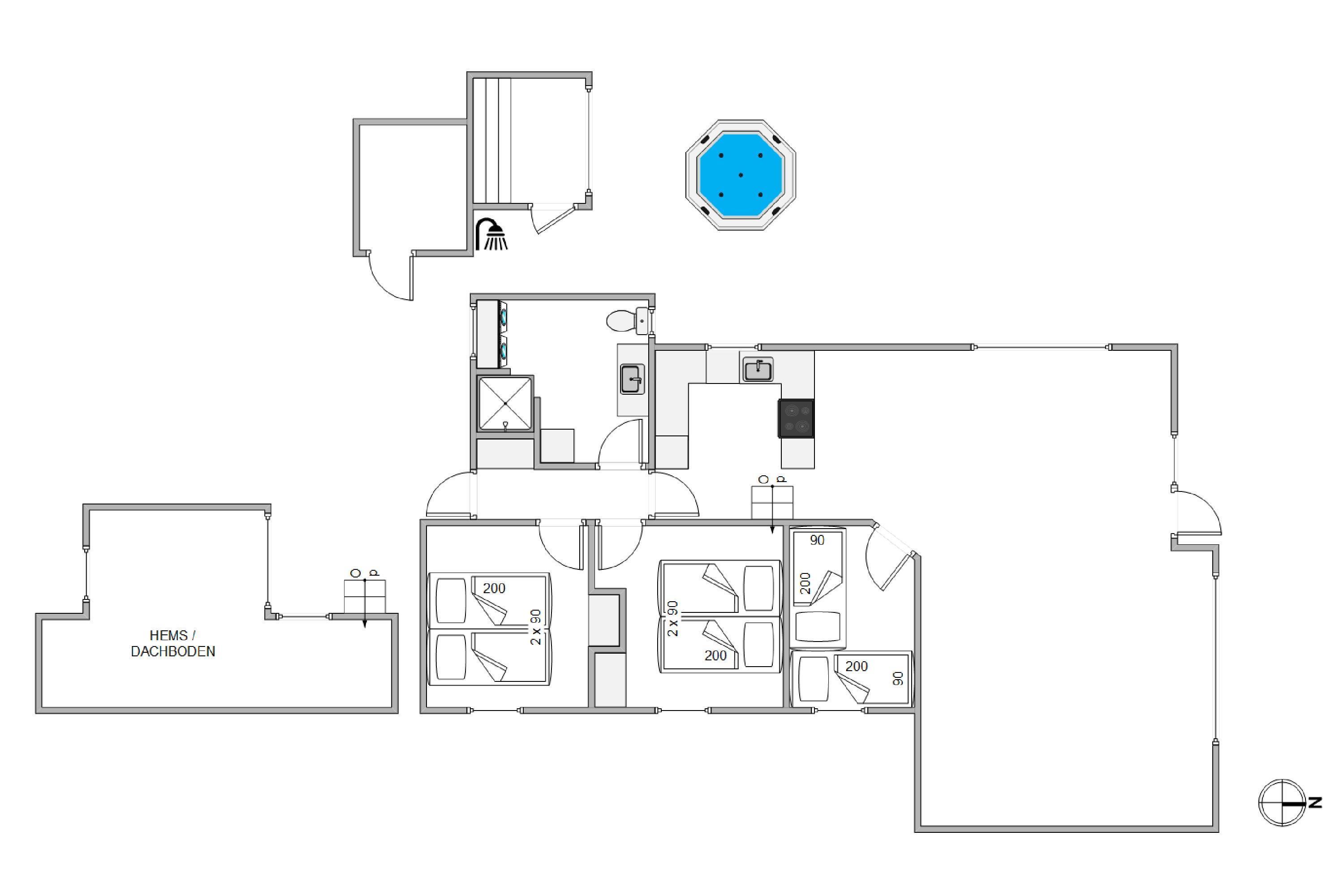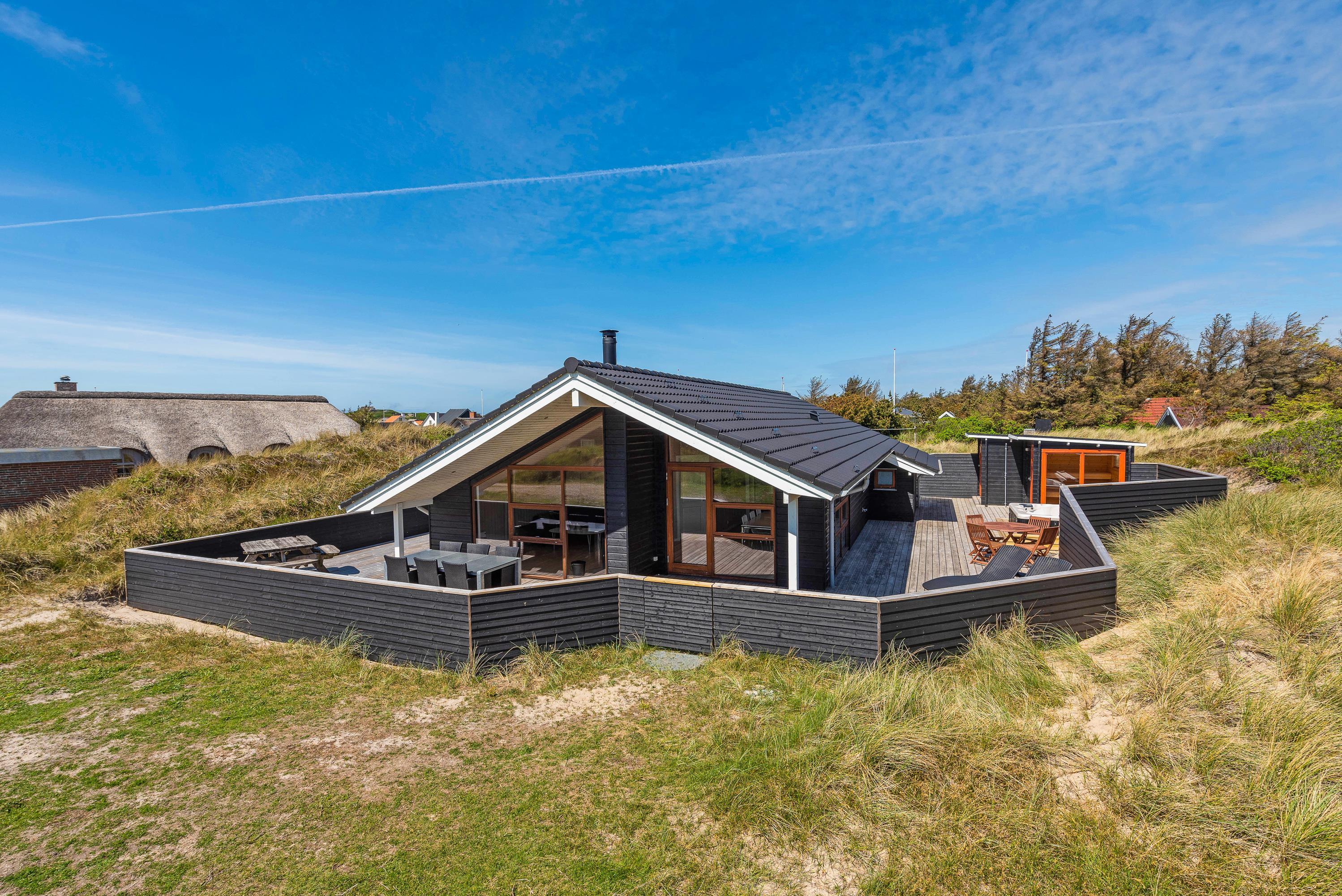 Lækkert lyst feriehus på Nordsøvej 30 – kun 500 meter fra Søndervig og 400 meter fra det altid brusende Vesterhav. Huset har udespa og herfra kan man virkelig nyde landskabet, mens man lader sig forkæle med et afslappende spabad.