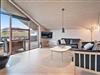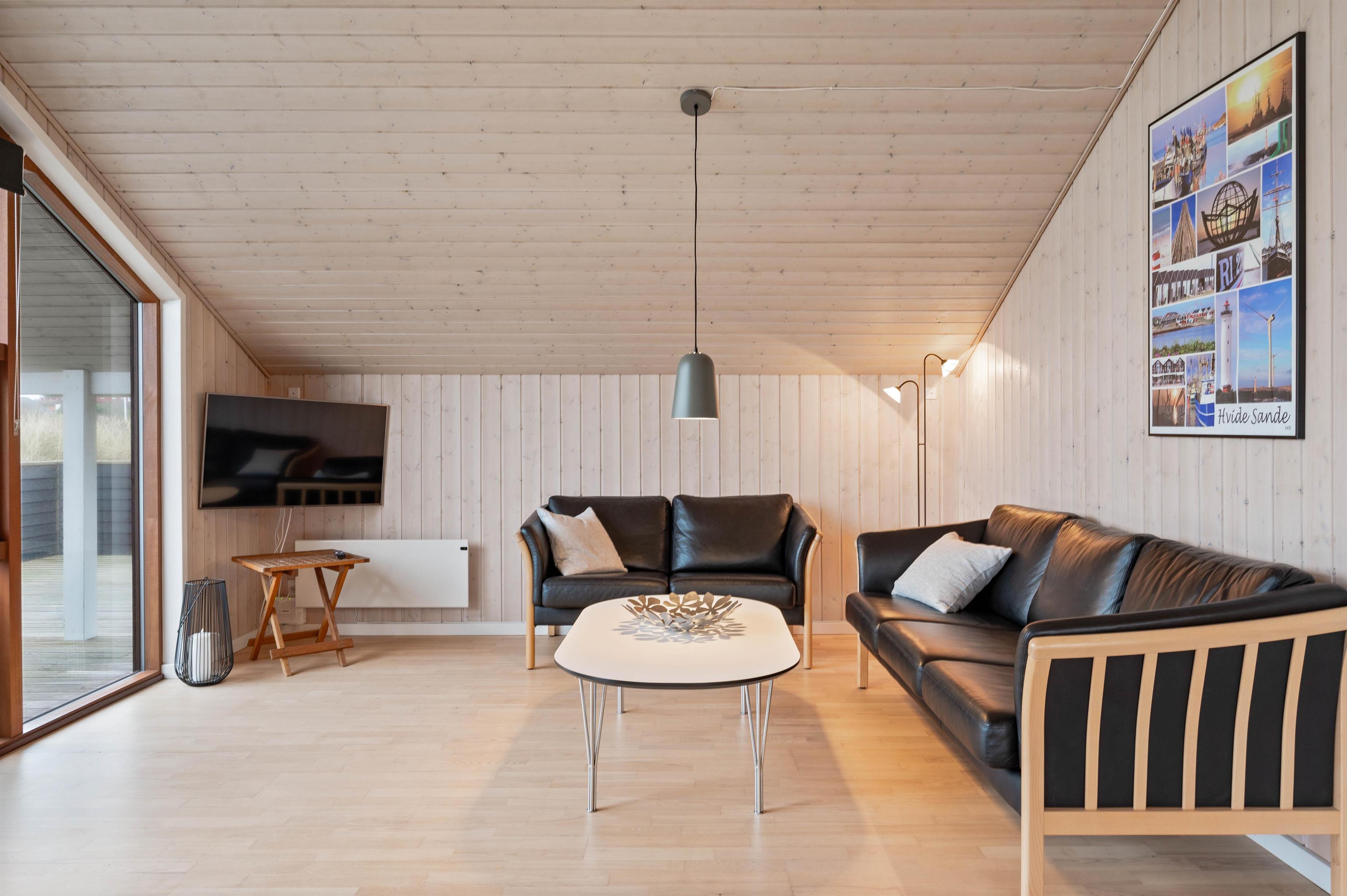 Fra spiseplads og stue har man et fantastisk view over klitlandskabet igennem de store vinduespartier mod syd, som også lader solen og lyset fylde opholdsrummet. Fra sofaen kan man, på en kold dag, nyde varmen og den knitrende ild fra brændeovnen, måske med en god bog og en kop kaffe.