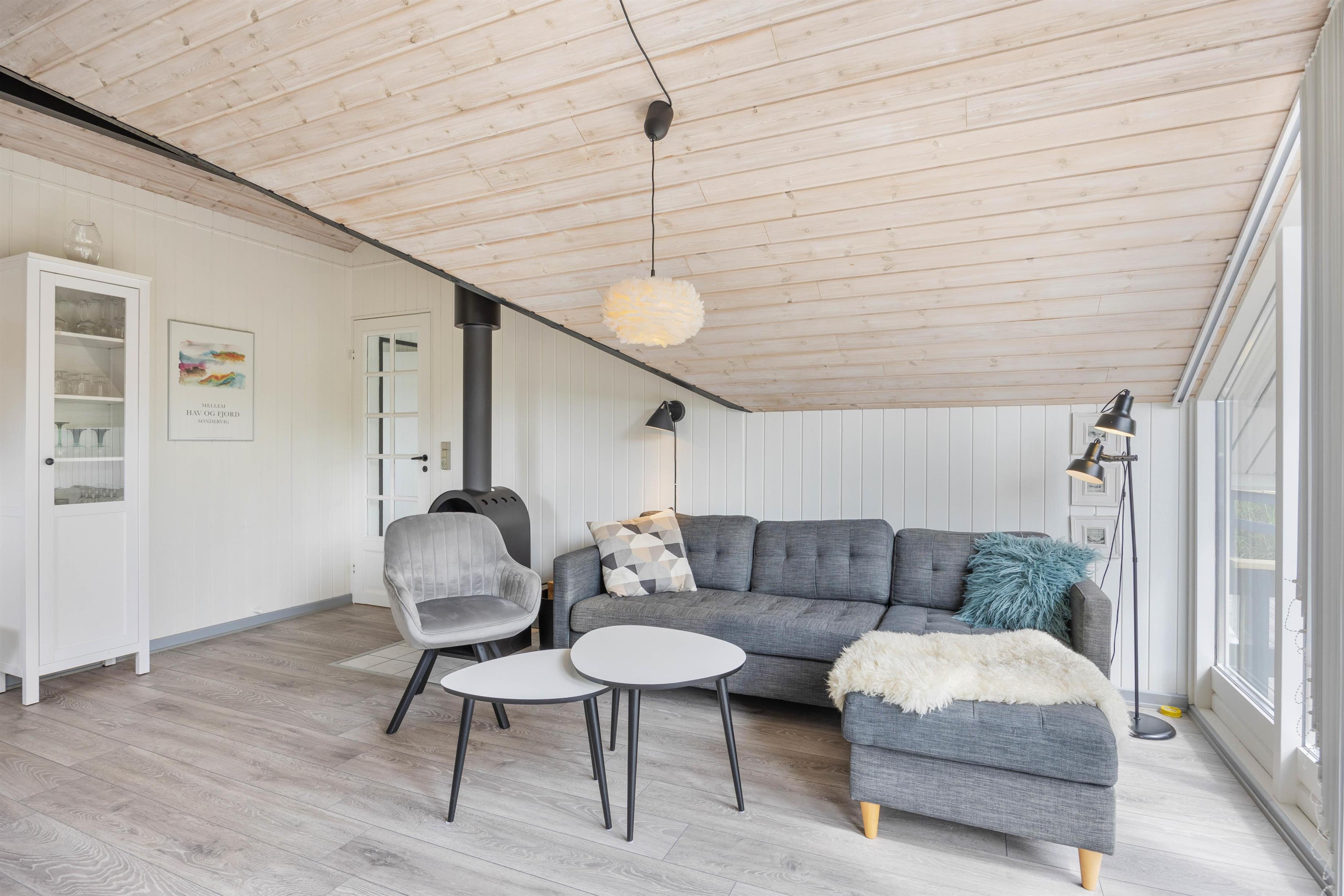 Huset emmer af klassisk sommerhuscharme. Det kan til dels tilskrives det høje loft til kip, de lyse paneler på vægge og lofter og den lune brændeovn, der sender varmebølger ud i hele opholdsrummet. De store vinduespartier sørger for at bade rummet i lys, hvilket bidrager til den gode atmosfære og rummelighed.