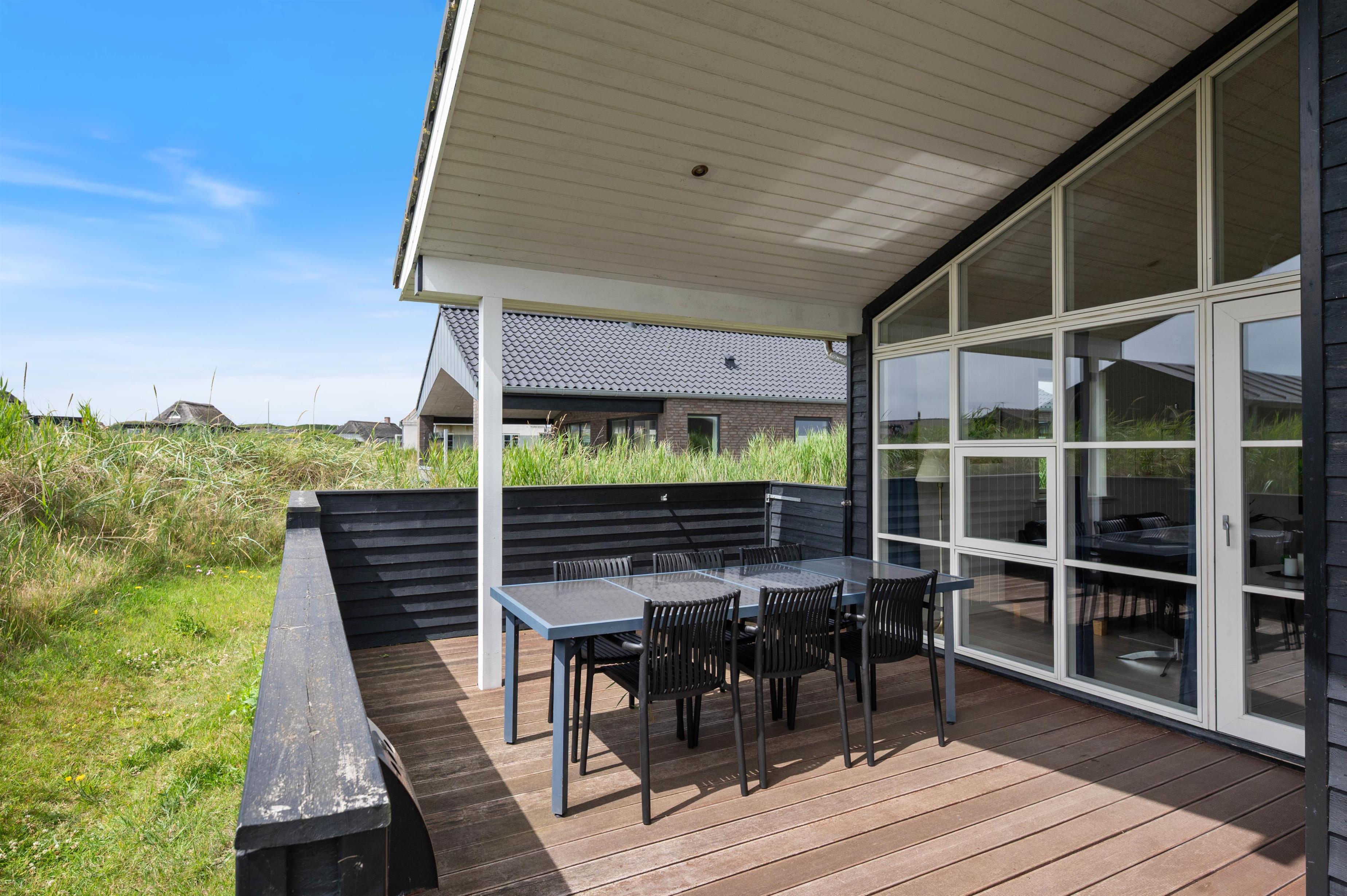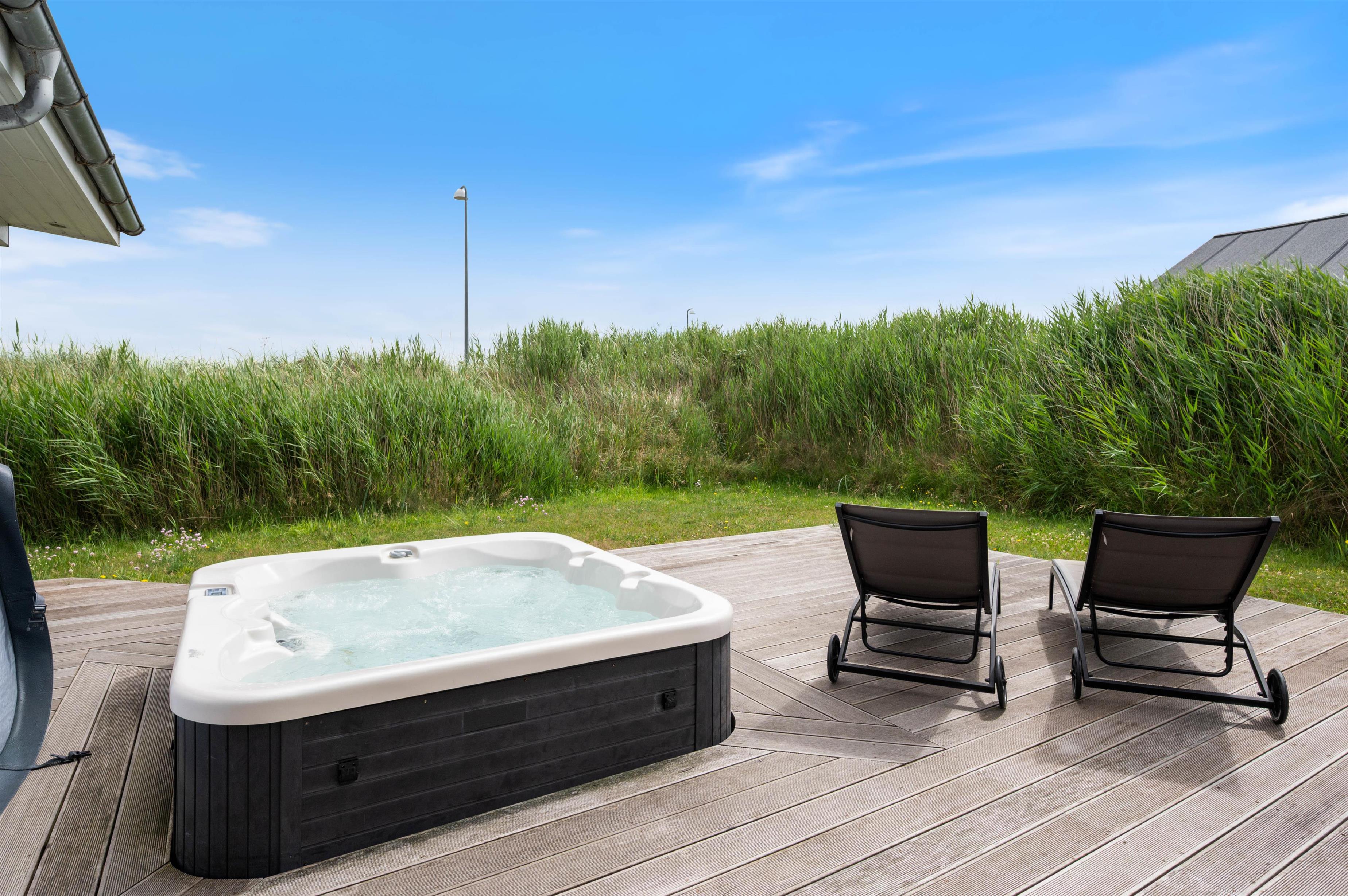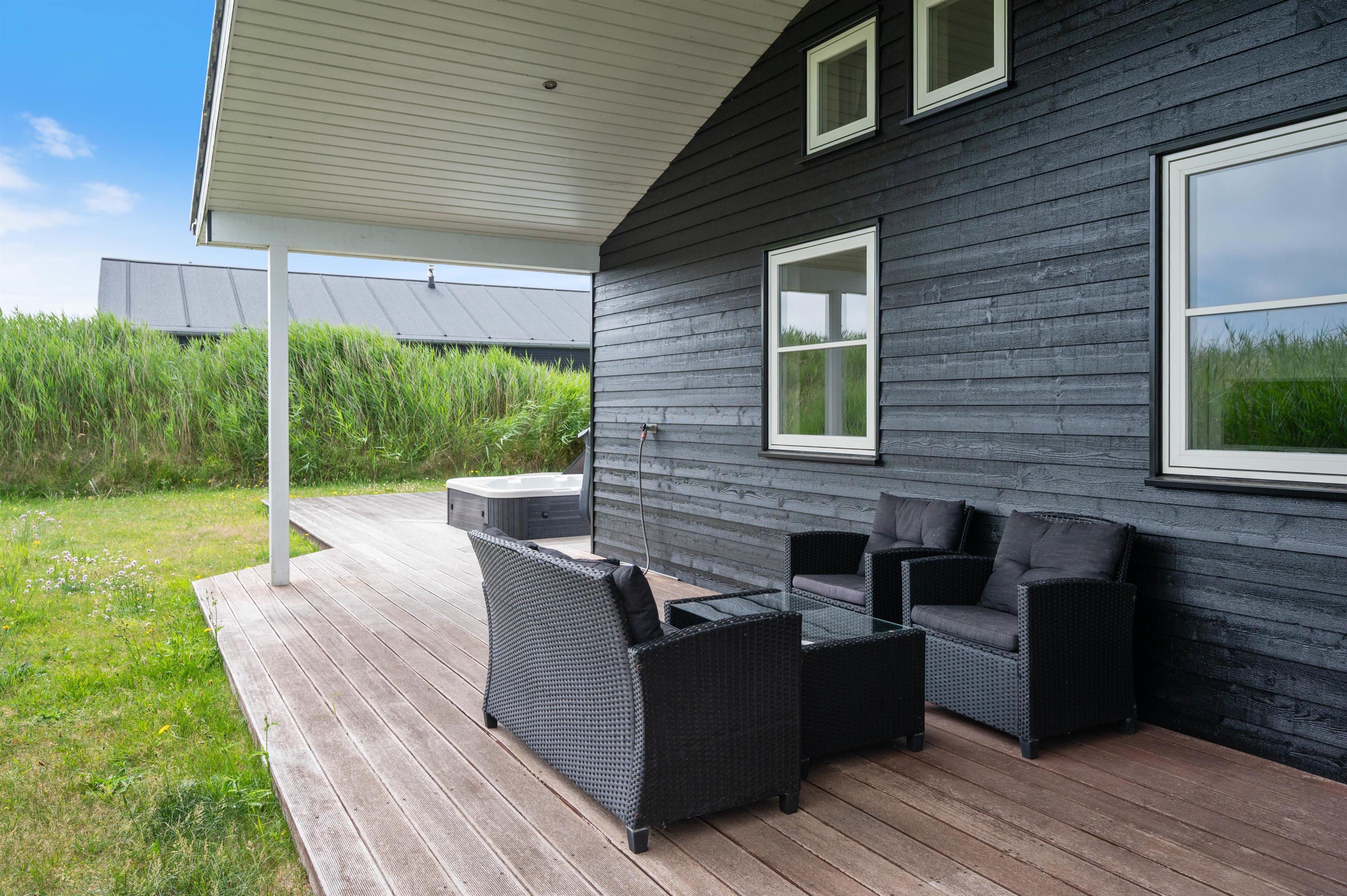 Dette hus har gode terrasser, som strækker sig rundt langs det meste af huset. Den er delvist overdækket, delvis lukket, og delvist afskærmet. Så her er det altid muligt at opholde sig på terrassen og nyde den friske luft og en hyggelig grillaften med familie eller venner. På terrassen er der også en udespa, som er særdeles hyggelig for både børn og voksne hele året rundt. Huset ligger tæt på byens 18-hullers golfbane - kun er 2 km væk fra Lodbergsvej 72.