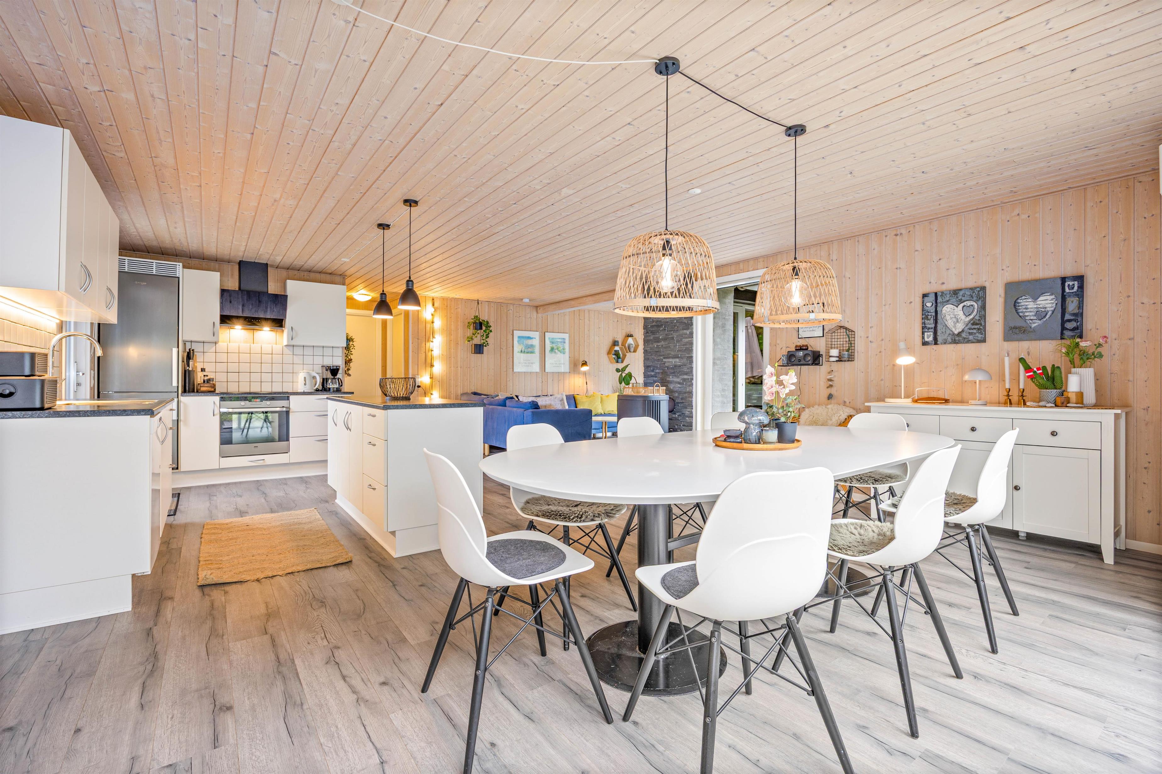 Husets køkken, spiseplads og stue er i et dejligt stort rum, med store glaspartier ud mod terrassen, og med en dejlig brændeovn der hurtigt kan give varme og hyggestemning i hele huset. Her er god plads til hele familien, både ved spisebordet til et spil kort eller når maden skal tilberedes i køkkenet. Der er gode og komfortabler møbler foran fladskærmen når der rigtig skal slappes af.