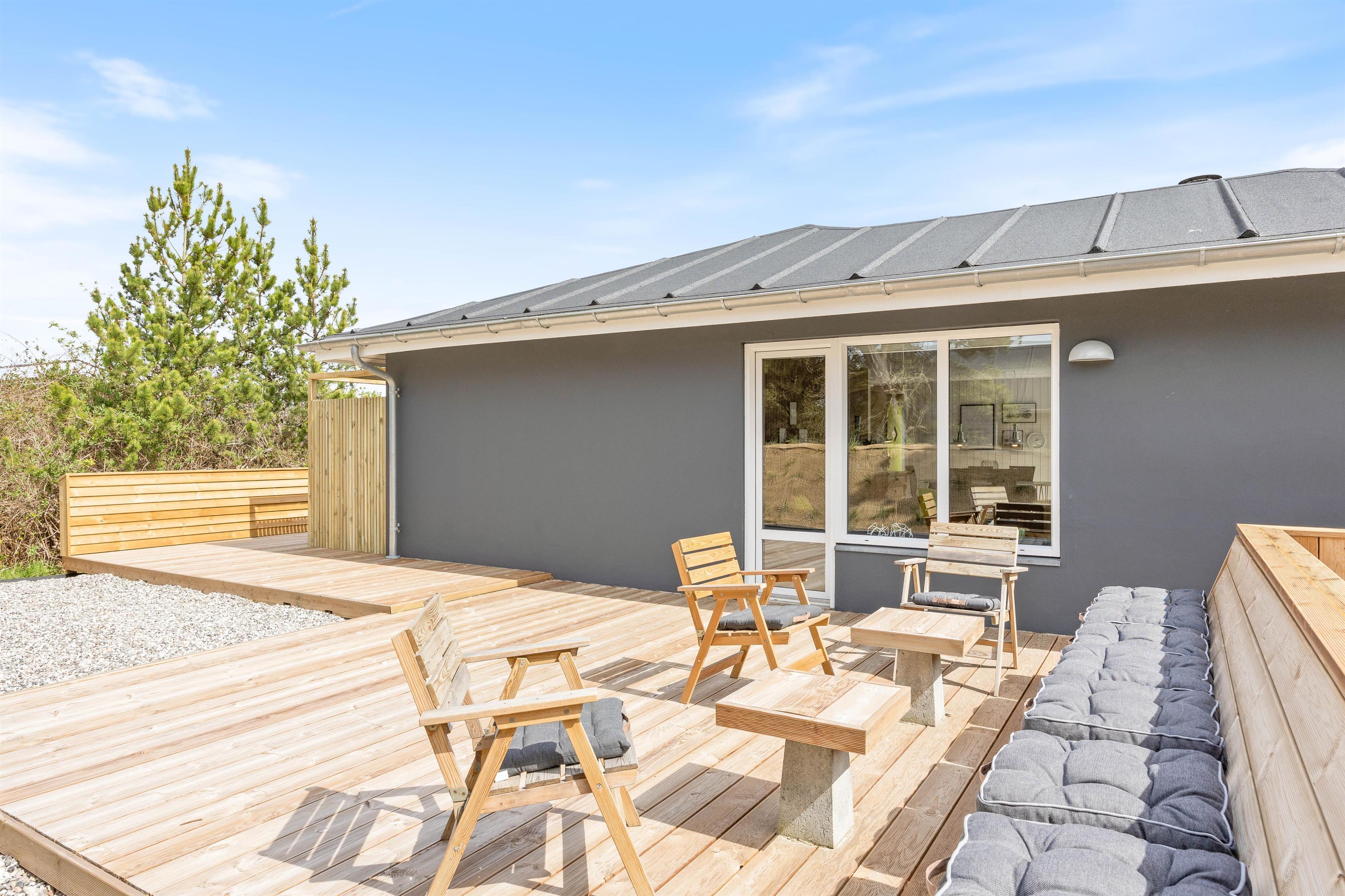 Den 1160 m2 store naturgrund på Hjelmevej 24 ligger i læ for Vestenvinden på en blind vej. Den store træterrasse byder på masser af plads til afslapning og solbadning. Når vejret tillader det, kan I grille og tilberede skønne feriemiddage under åben himmel. Hvis det bliver for varmt, kan I køle jer ned under udendørsbruseren eller finde et skyggefuldt sted på sommerhusgrunden. I perioden april til november vil udebrusen være til benyttelse.