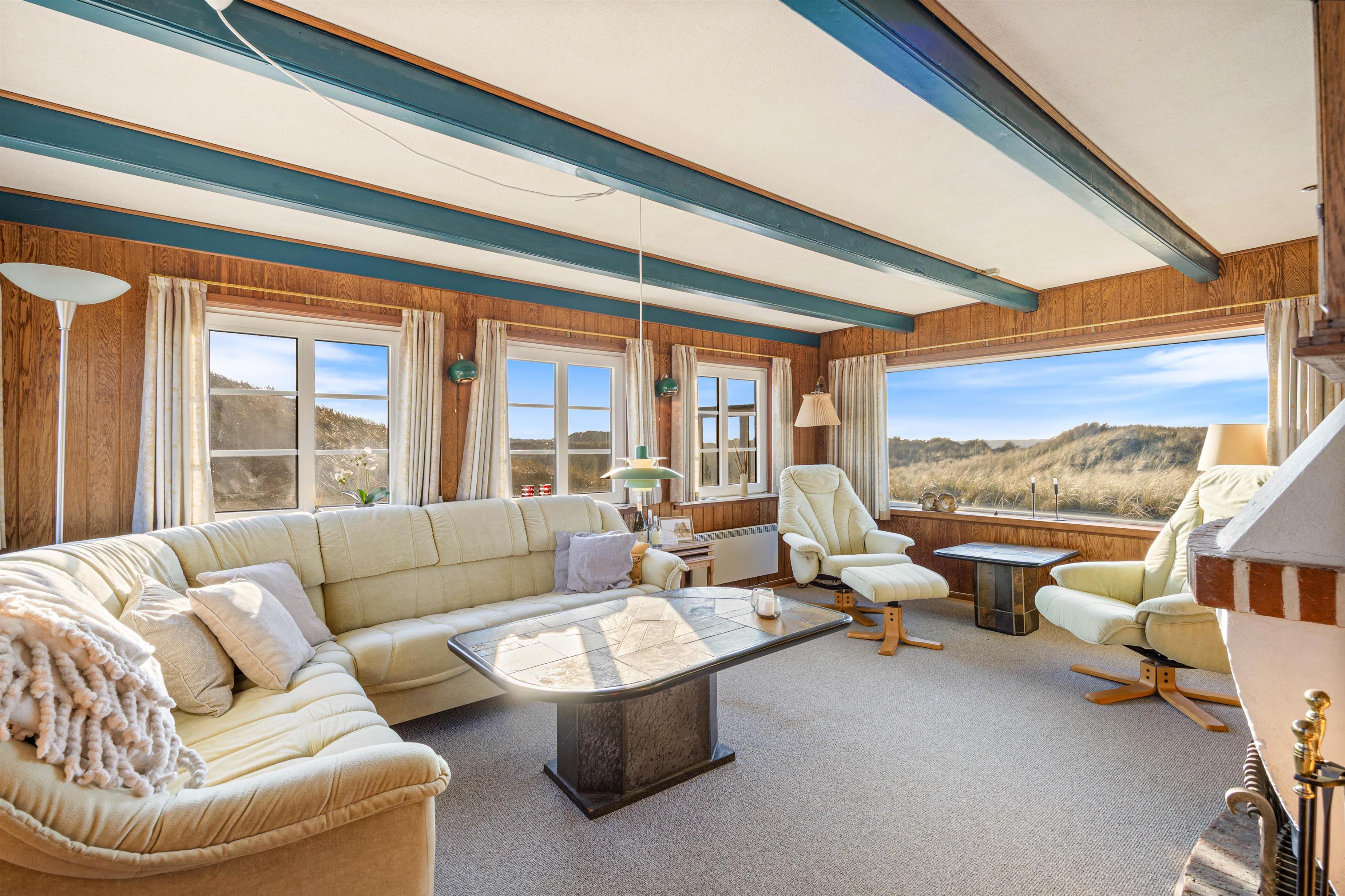 Når I træder ind i den historiske stue er det første, der falder jer i øjnene det store vindue, som giver jer en fantastisk udsigt over klitlandskabet. Her kan I sætte jer godt til rette en aften og nyde en smuk solnedgang ud over Vesterhavet.
