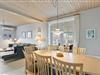 I det store opholdsrum i stueetagen kan hele familiens samles til lækre feriemiddage og brætspilsaftner om spisebordet. Opvaskemaskinen rydder hurtigt op efter madlavningen. Gennem vinduerne i den afrundede havestue kommer der masser af lys ind i huset, og I kan i al slags vejr sidde og nyde udsigten til himlen og den grønne sommerhusgrund.