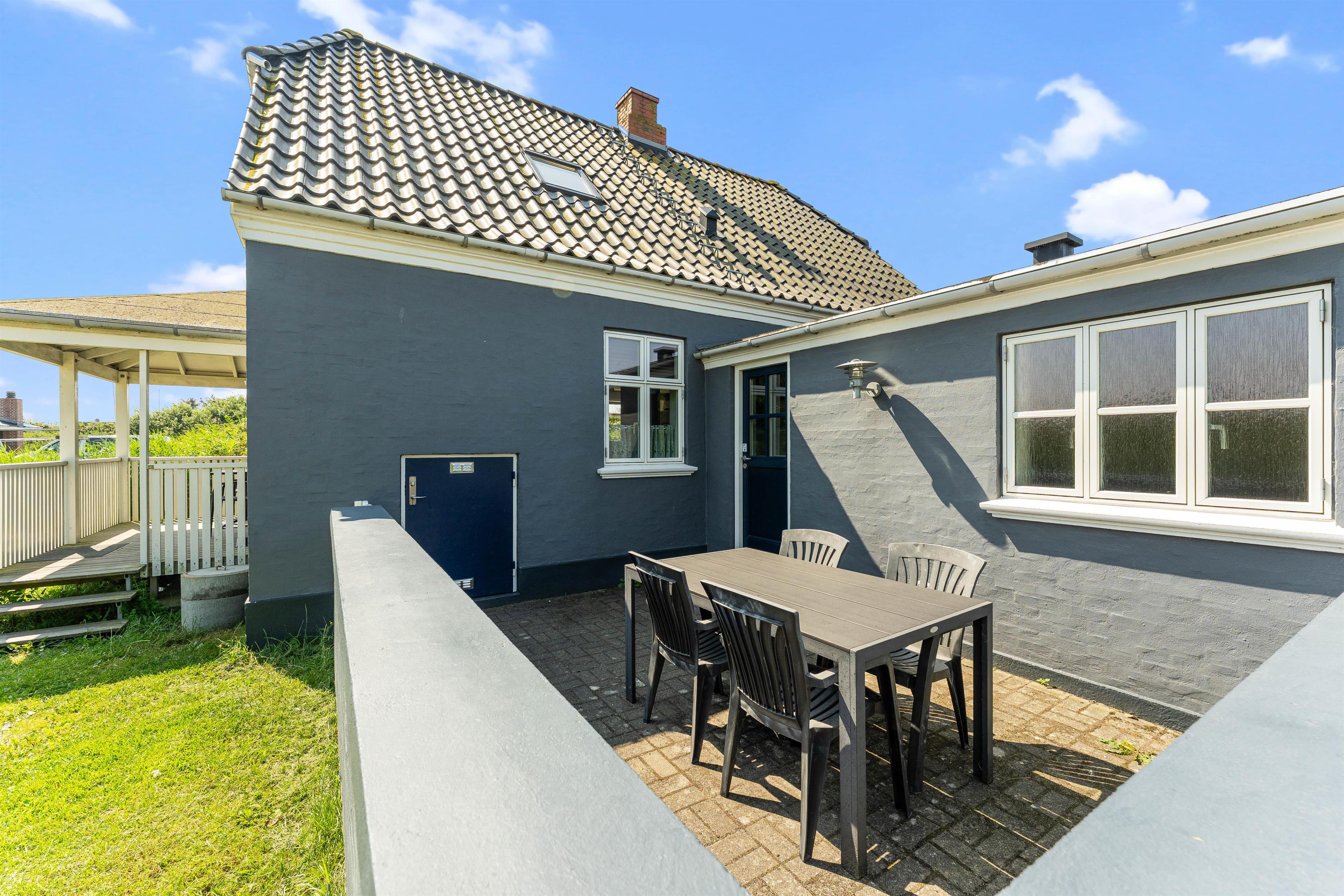 På begge sider af sommerhuset ligger en indhegnet og afskærmet terrasse, hvor I kan flytte liggestolene efter solen og nyde dejlige grillmiddage sammen. Fra den bagerste terrasse kan I se børnene, når de flyver højt til vejrs på gyngerne eller graver dybe huller i sandkassen. På plænen ved huset er der også plads til boldspil og fangeleg.