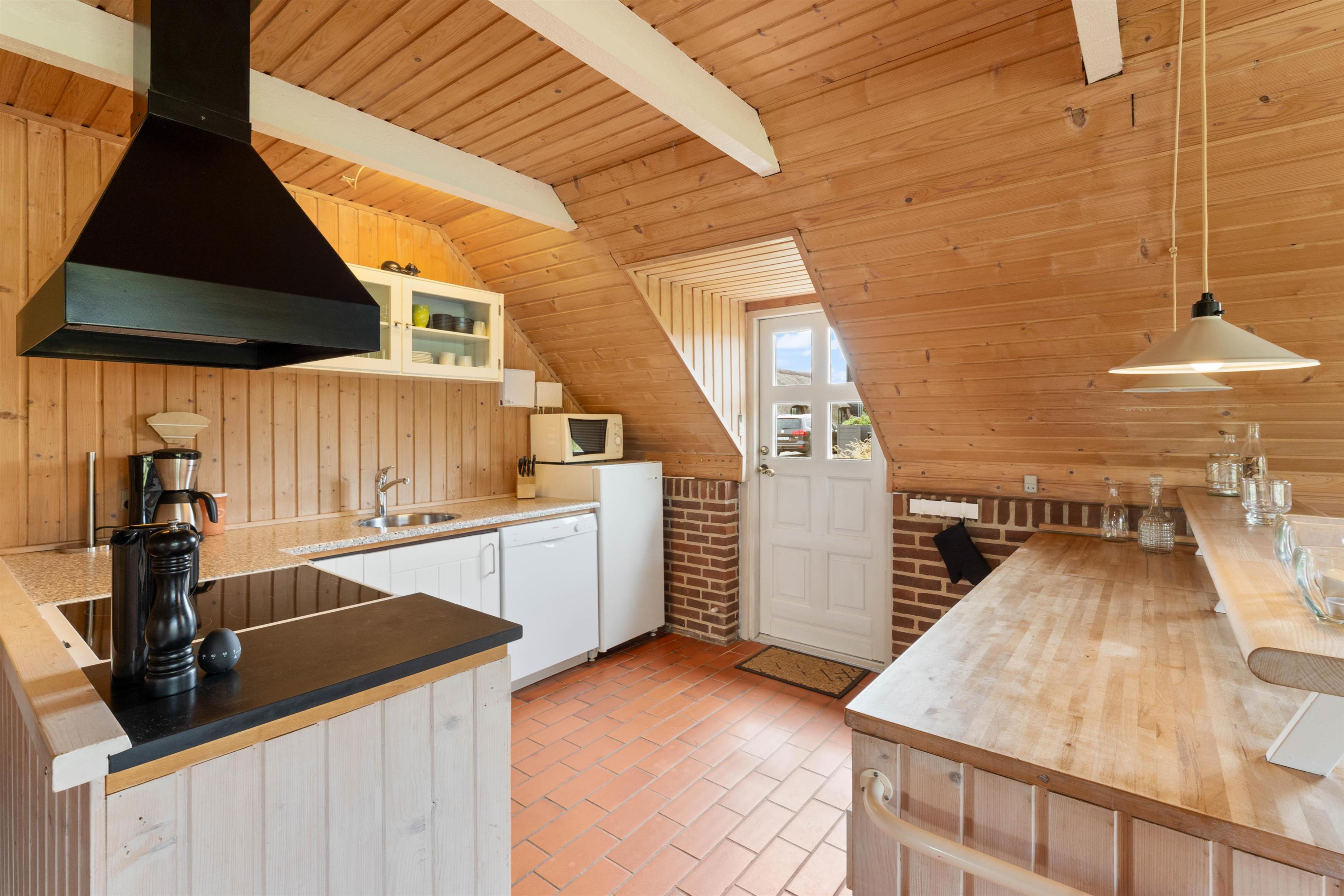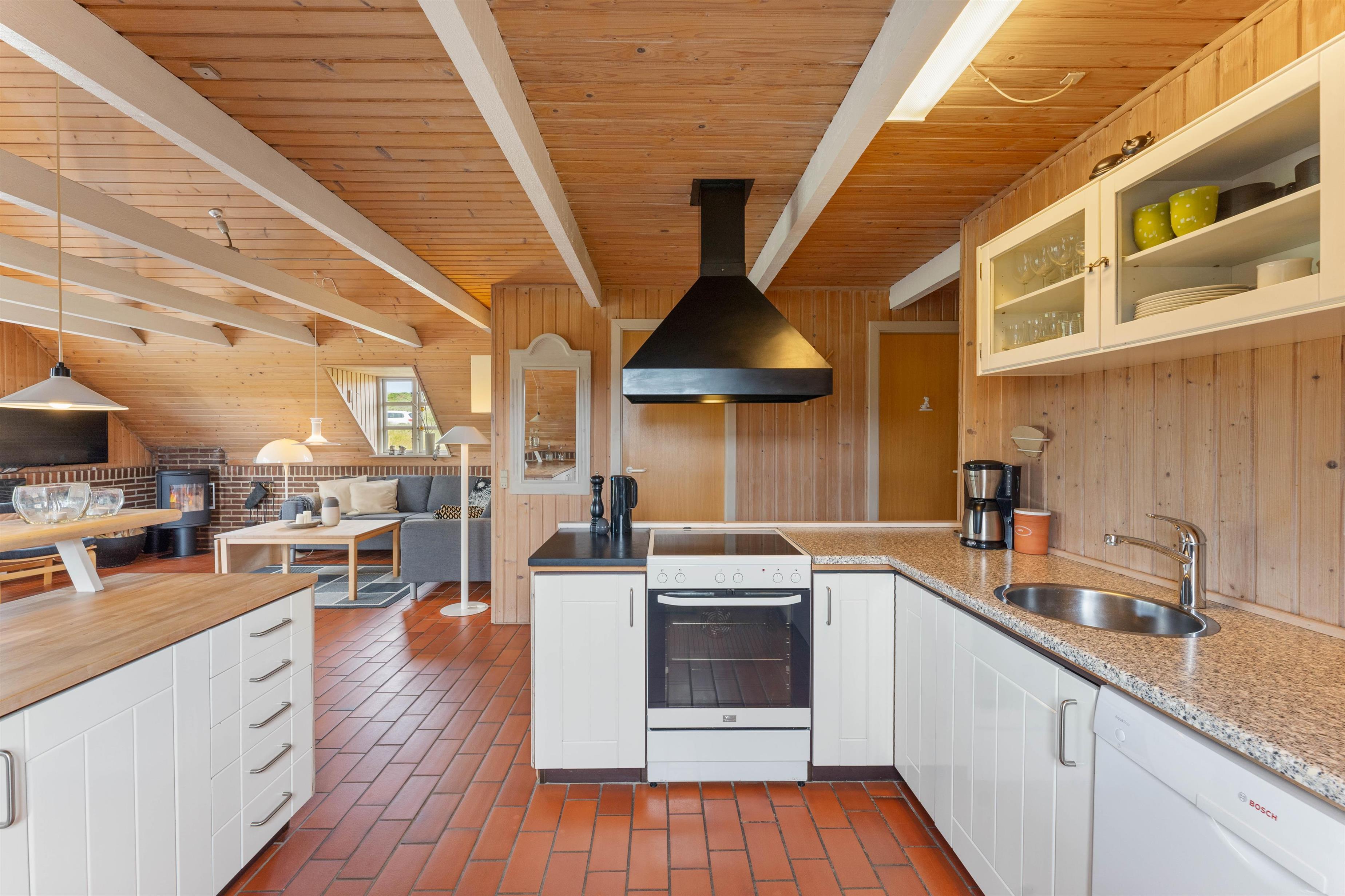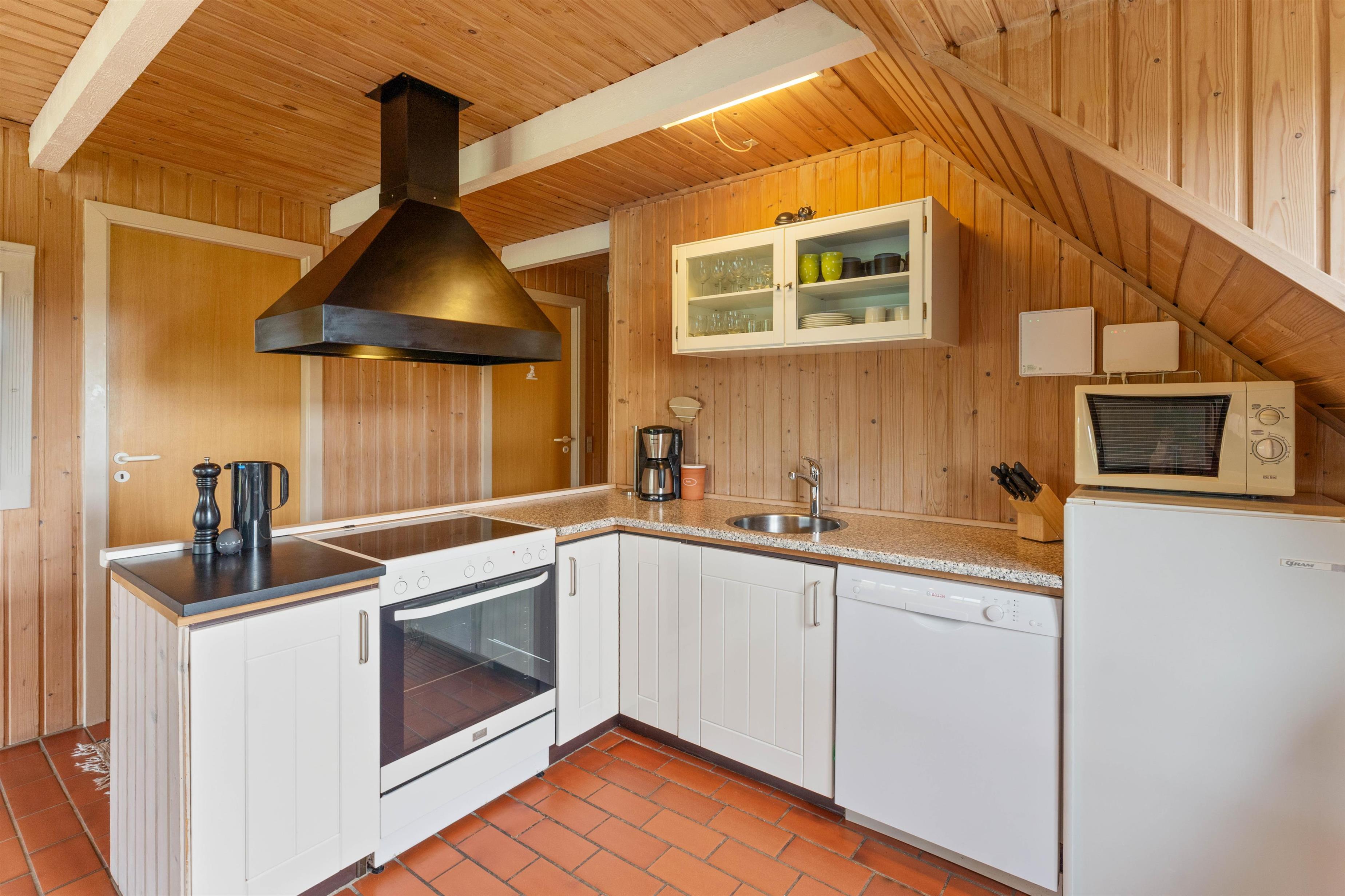 De træbeklædte vægge og lofter, der går til kip, skaber en hyggelig atmosfære i indretningen. Samtidig giver de synlige loftsbjælker en følelse af rum og plads omkring jer. Feriehuset er yderligere udstyret med blandt andet fladskærms-TV og opvaskemaskine, så I slipper for at tage opvasken, og I i stedet kan nyde en god film eller serie på husets fladskærm.