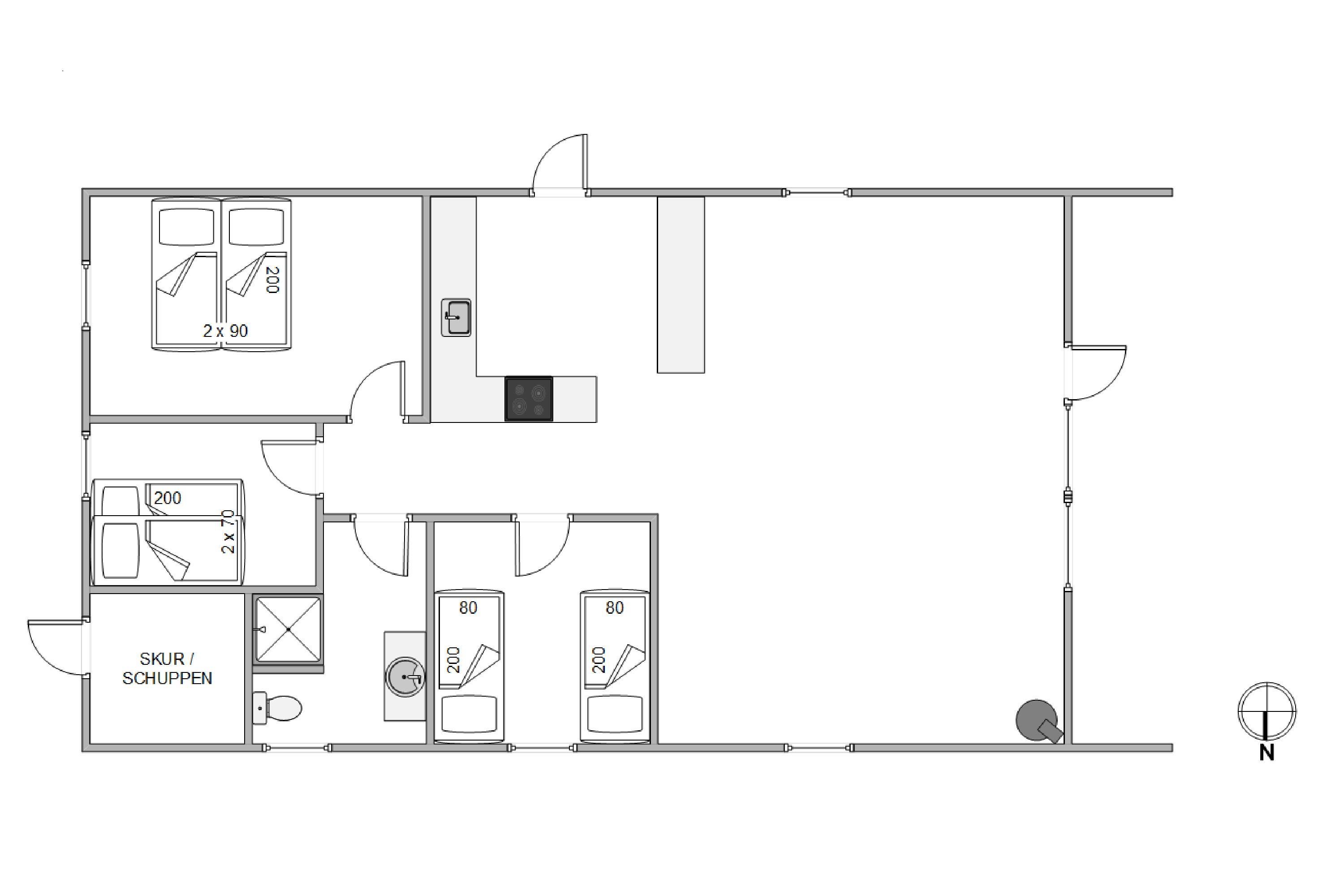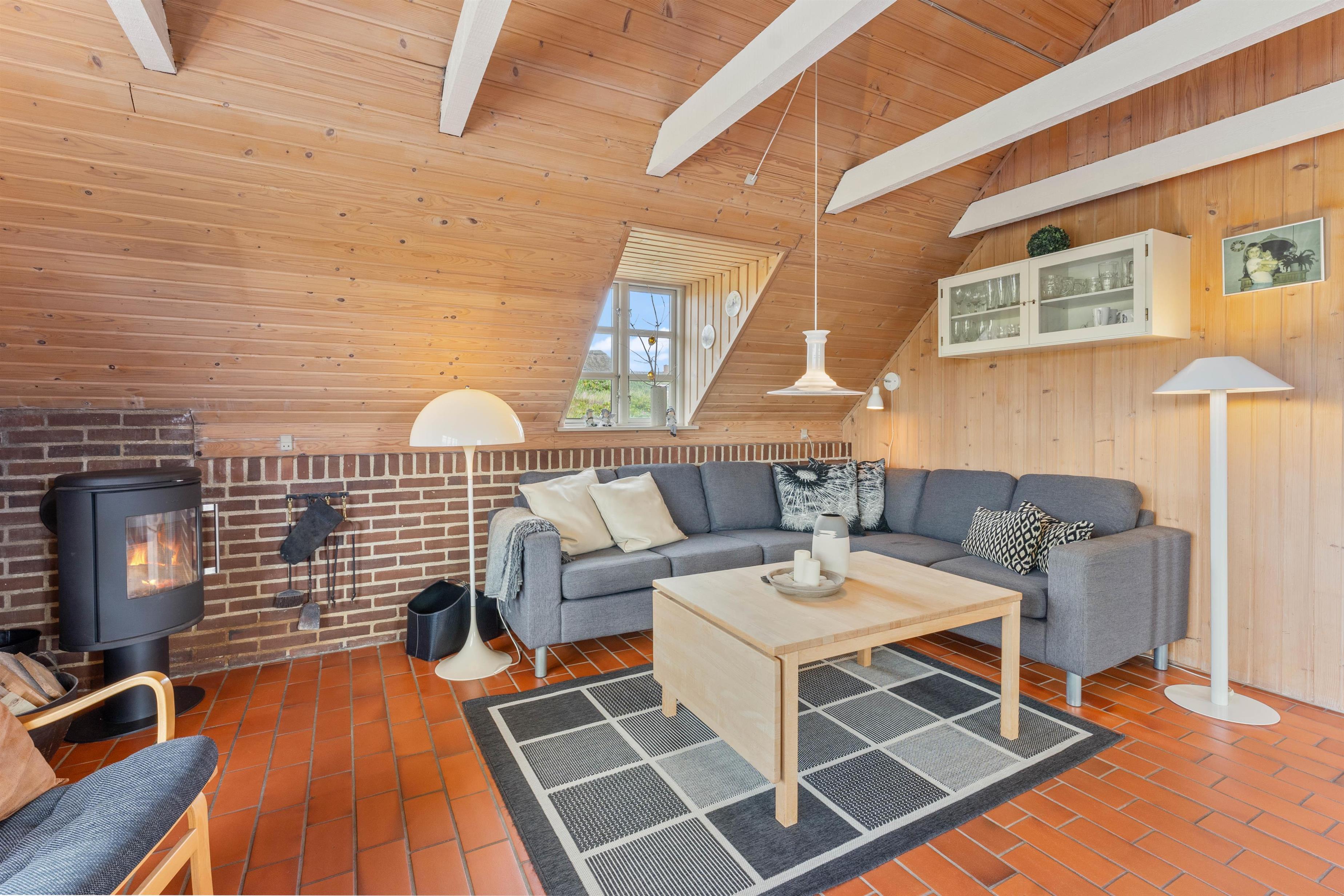 Det hyggelige feriehus er godt indrettet og har plads til 6 personer. I sommerhusets indretning er der fokus på hygge og samvær. Det pæne køkken ligger i åben forbindelse med stuen, som er hjertet i sommerhuset. Her kan familien samles om madlavningen eller til et spil i den dejligt møblerede stue. På de lidt køligere sommerdage har I desuden mulighed for at slænge jer på sofaen imens I nyder varmen fra den knitrende brændeovn i baggrunden.