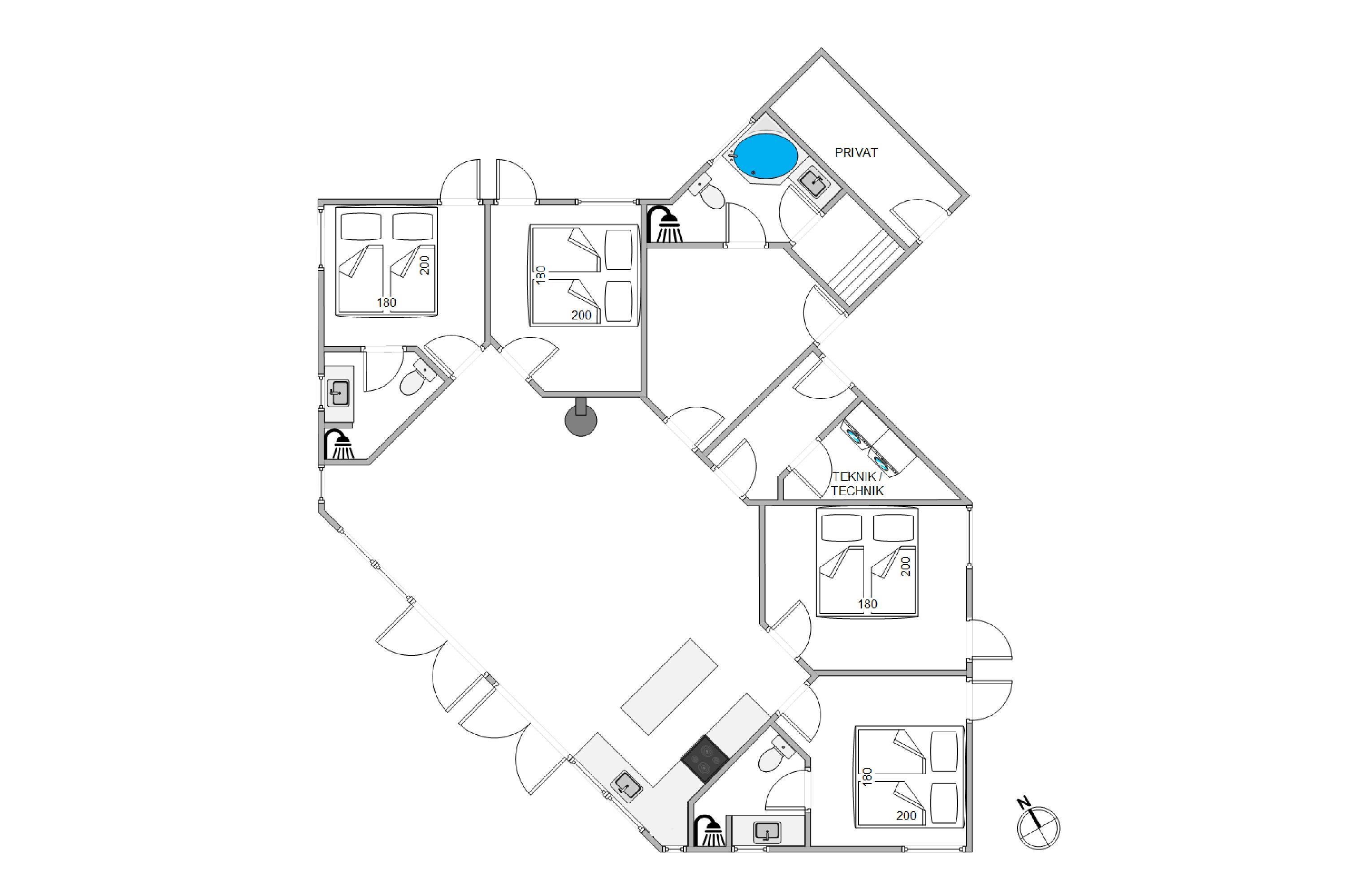 De fire soveværelser er fine og sommerhuset råder over hele tre moderne og lækre badeværelser og for de, der elsker at lave mad, står det veludstyrede køkken klar til brug, og det er naturligvis med opvaskemaskine og en separat fryser på 90 liter.