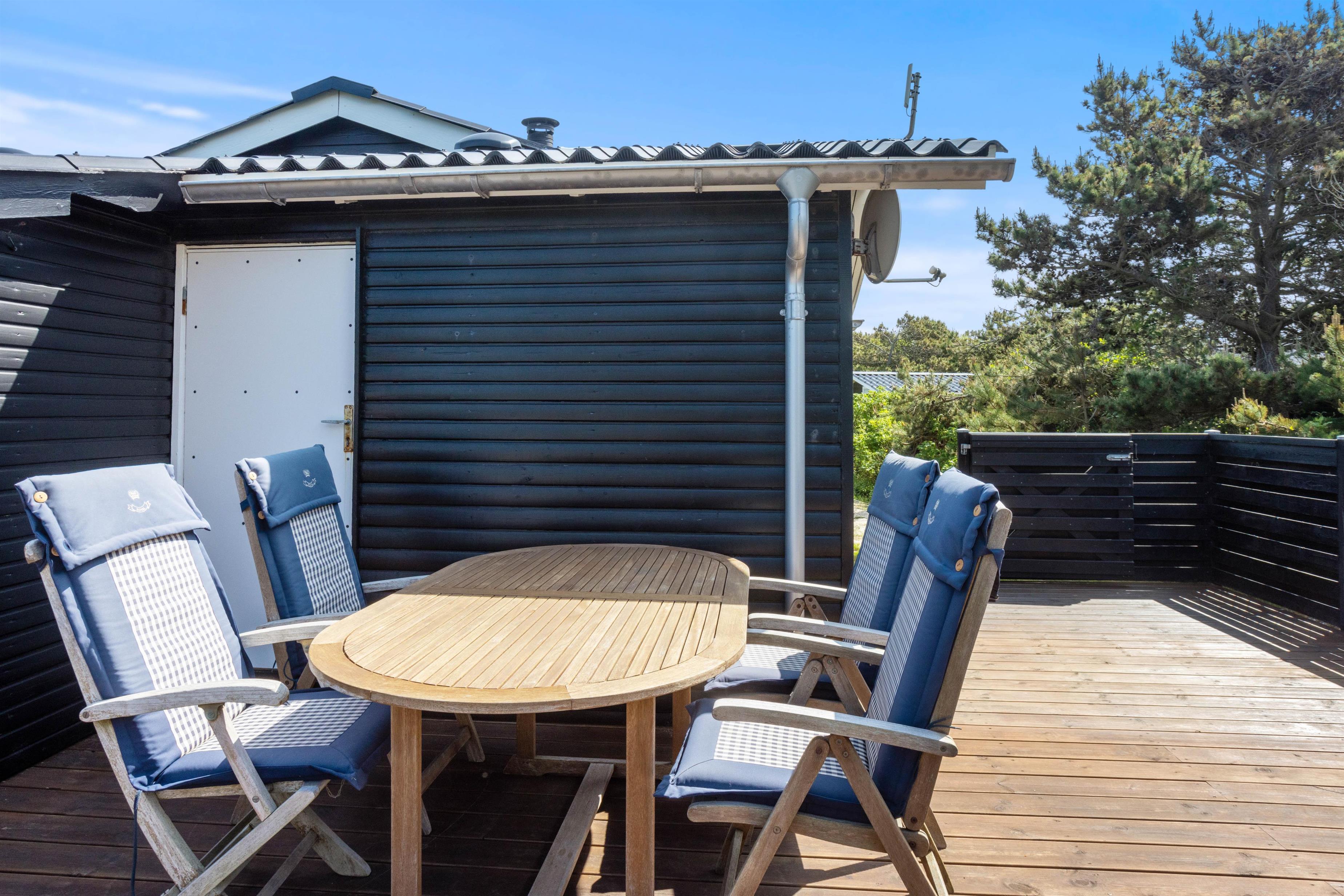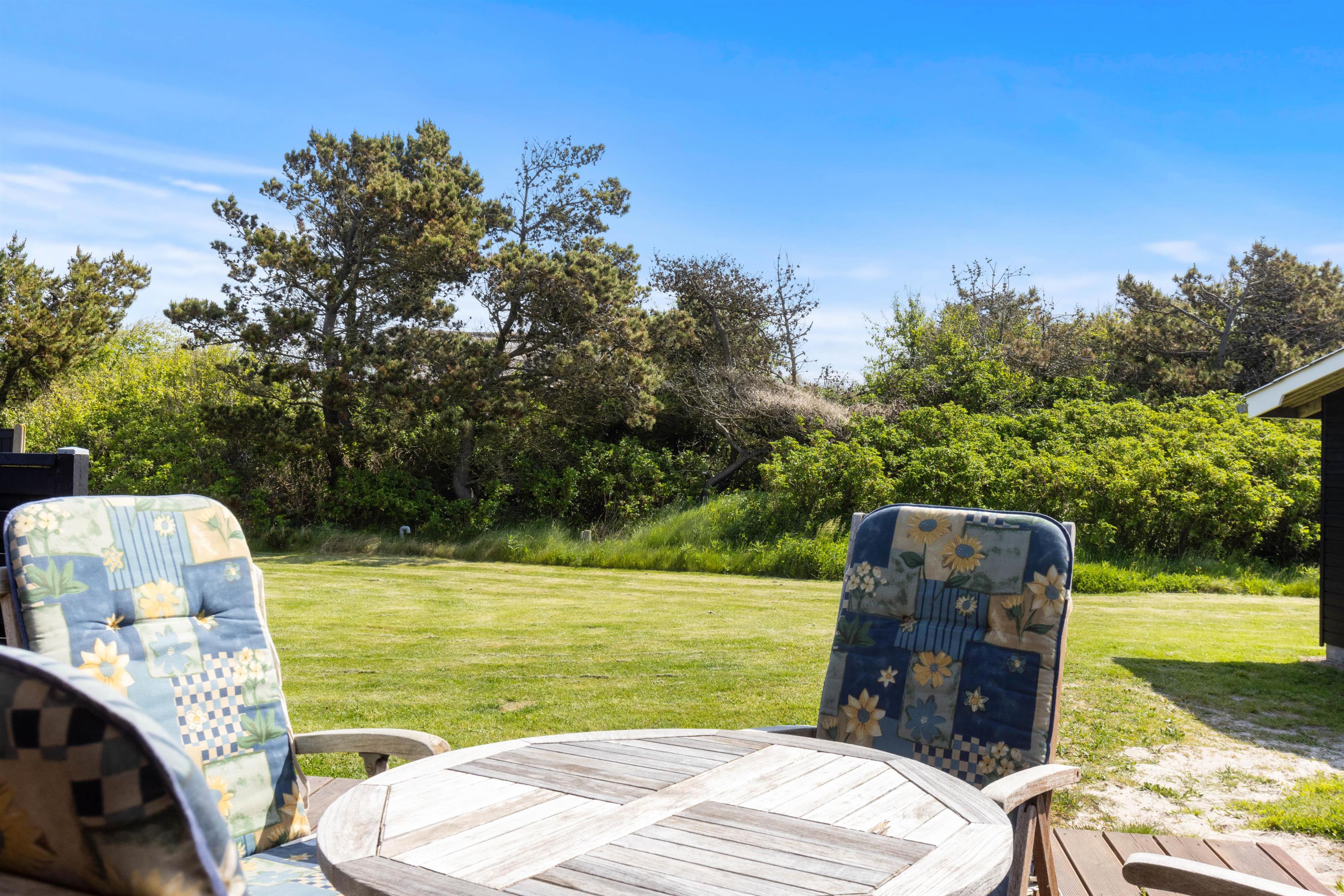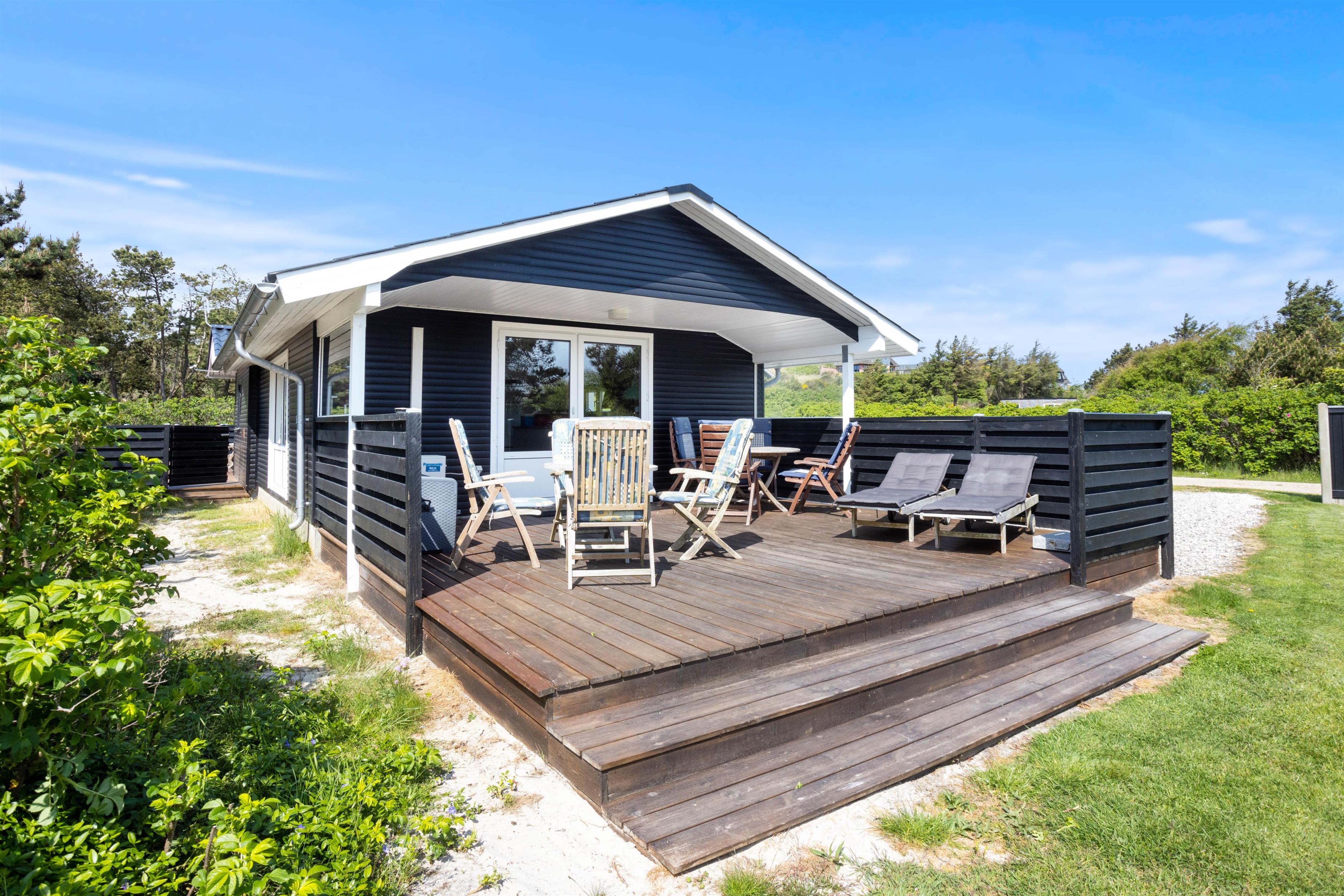 Udendørsområderne er lige så indbydende som det indre af sommerhuset. Her kan I vælge mellem en åben og afskærmet og en lukket terrasse - Den åbne terrasse er endda delvis overdækket og perfekt til de dage, hvor vejret måske ikke er i topform, men stadig godt nok til at sidde udenfor. Den store græsplæne vil de yngste feriegæster helt sikkert også elske, så mens de slår sig løs her, kan I med ro sætte jer til rette i havemøblerne der er til rådighed på begge terrasser, hvor I virkelig kan nyde jeres morgenkaffe eller en aftenmiddag i det fri, omgivet af naturens skønhed.
