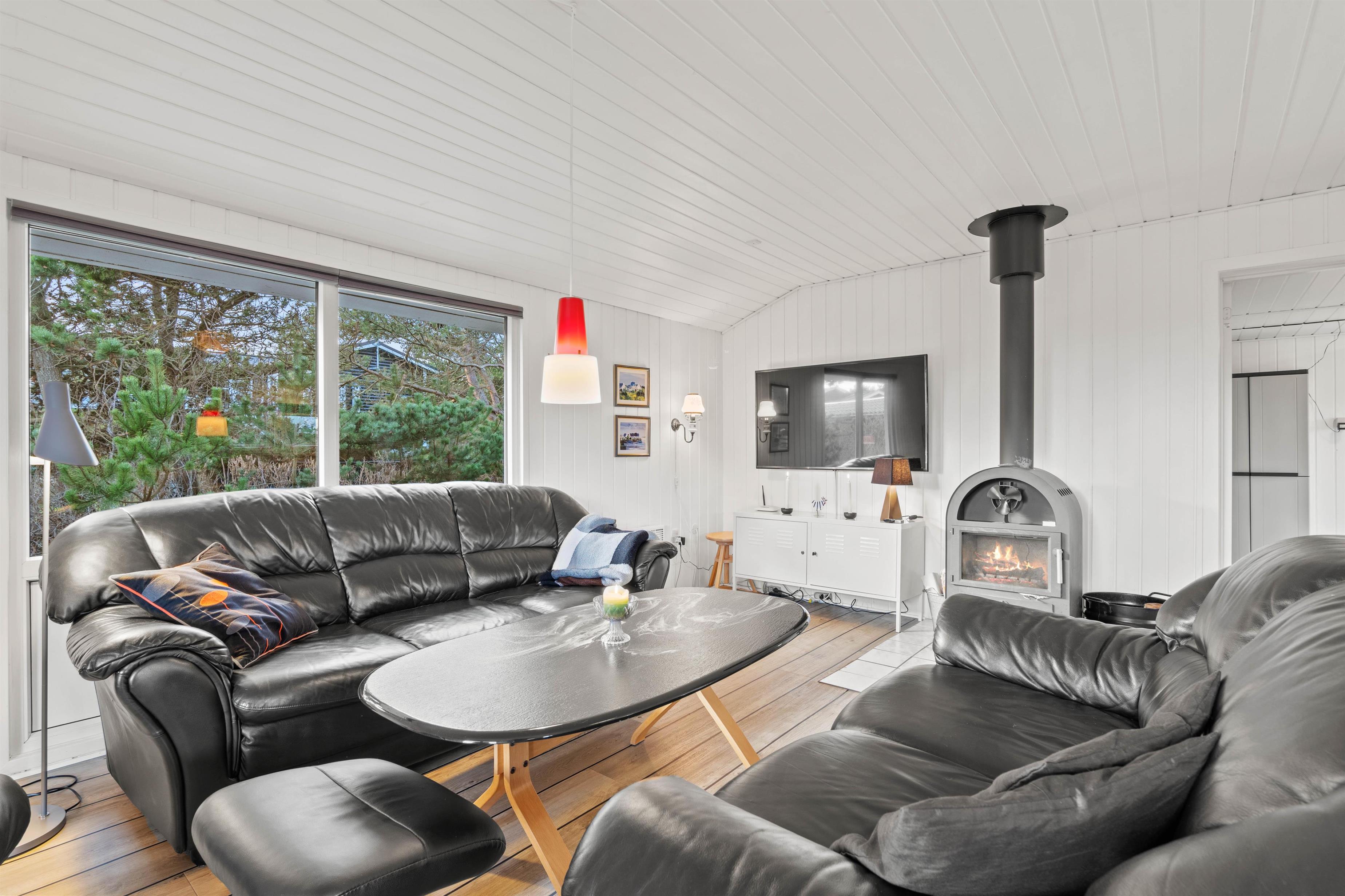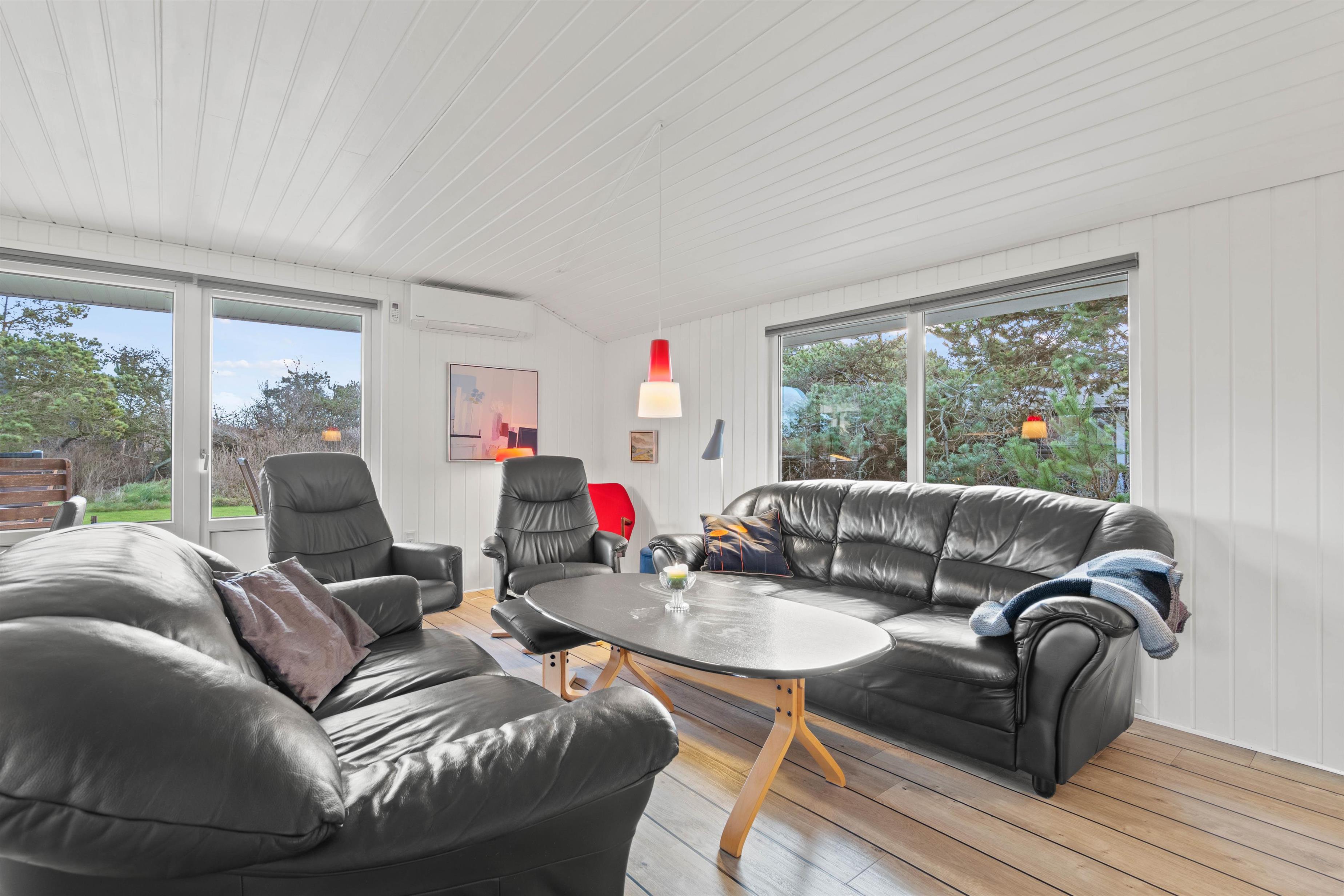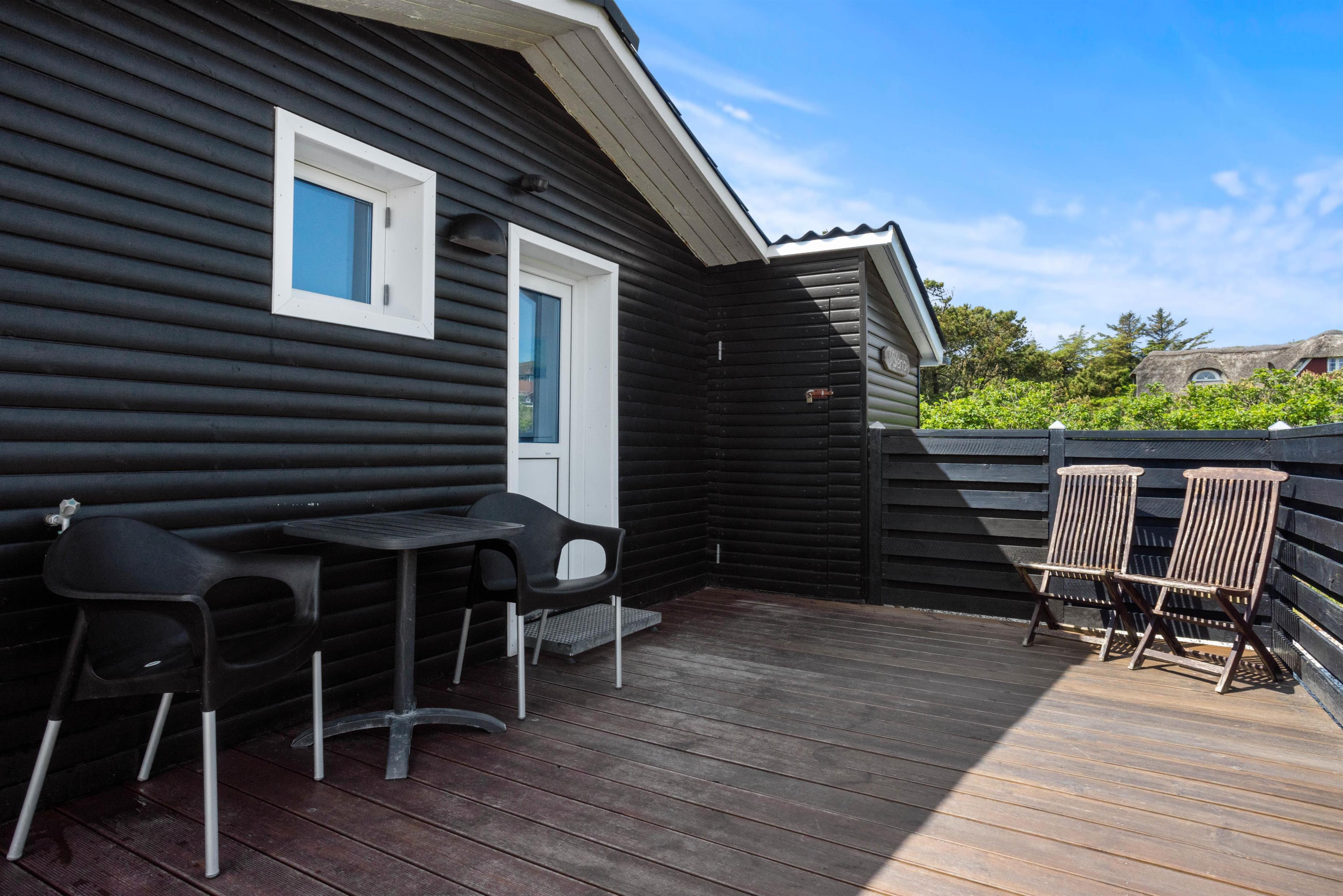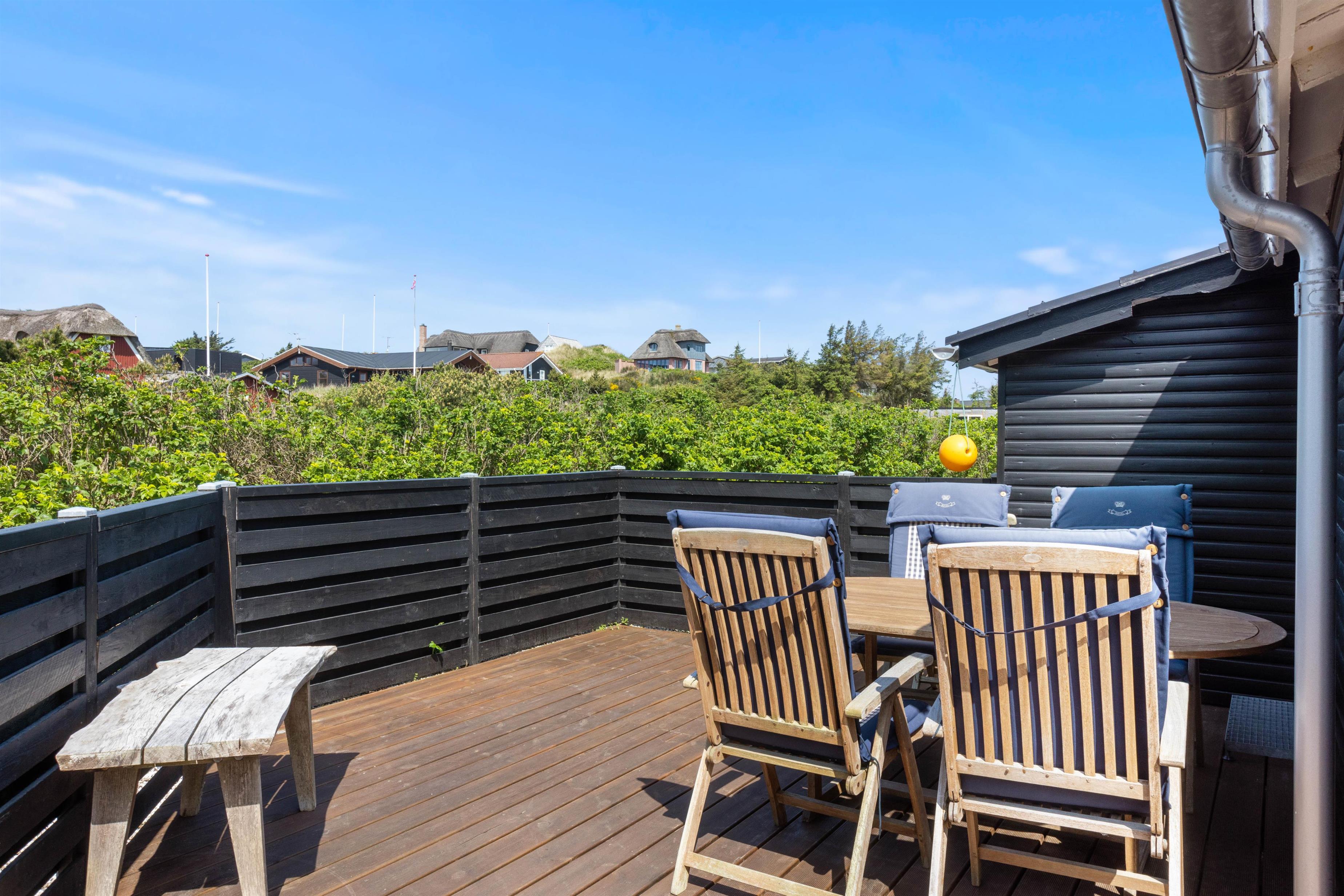 Udendørsområderne er lige så indbydende som det indre af sommerhuset. Her kan I vælge mellem en åben og afskærmet og en lukket terrasse - Den åbne terrasse er endda delvis overdækket og perfekt til de dage, hvor vejret måske ikke er i topform, men stadig godt nok til at sidde udenfor. Den store græsplæne vil de yngste feriegæster helt sikkert også elske, så mens de slår sig løs her, kan I med ro sætte jer til rette i havemøblerne der er til rådighed på begge terrasser, hvor I virkelig kan nyde jeres morgenkaffe eller en aftenmiddag i det fri, omgivet af naturens skønhed.