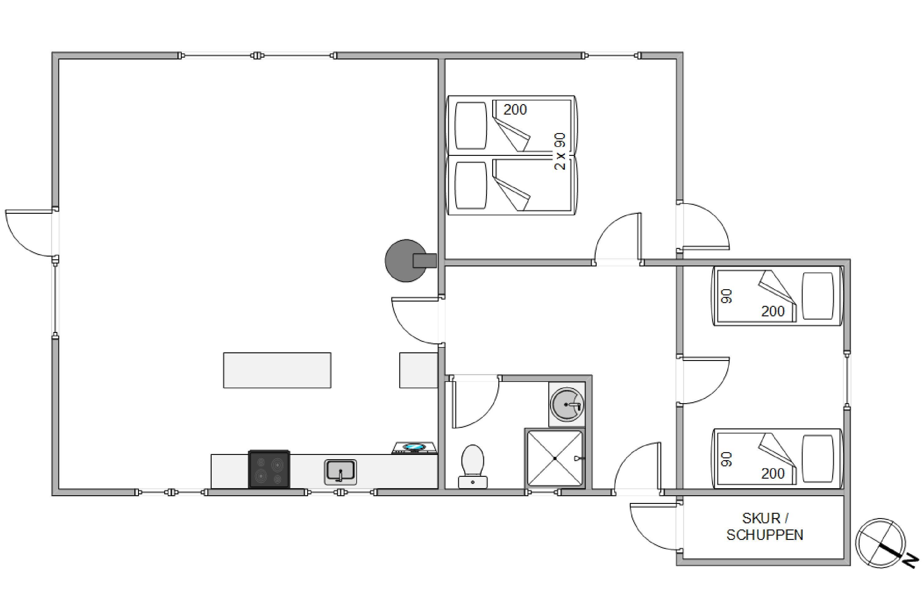 Sommerhuset består af 76m2, og fordelt på de 76m2 findes to soveværelser, og så det store hjerterum, nemlig køkkenalrummet. Dette rum ligger op til masser af nærvær og kvalitetstid med dine nærmeste. Sæt jer til rette i de behagelige møbler, mens I ser noget fjernsyn, måske dyste i forskellige medbragte kort- og brætspil eller sætte jer til rette med en god bog. Stuens mange vinduer lader lyset passere fra flere vinkler og skaber en dejlig, flydende overgang mellem inde og ude. Uanset hvad, så tillader huset det, da I med sikkerhed vil føle jer til rette i det lyse og rummelige køkken-alrum.