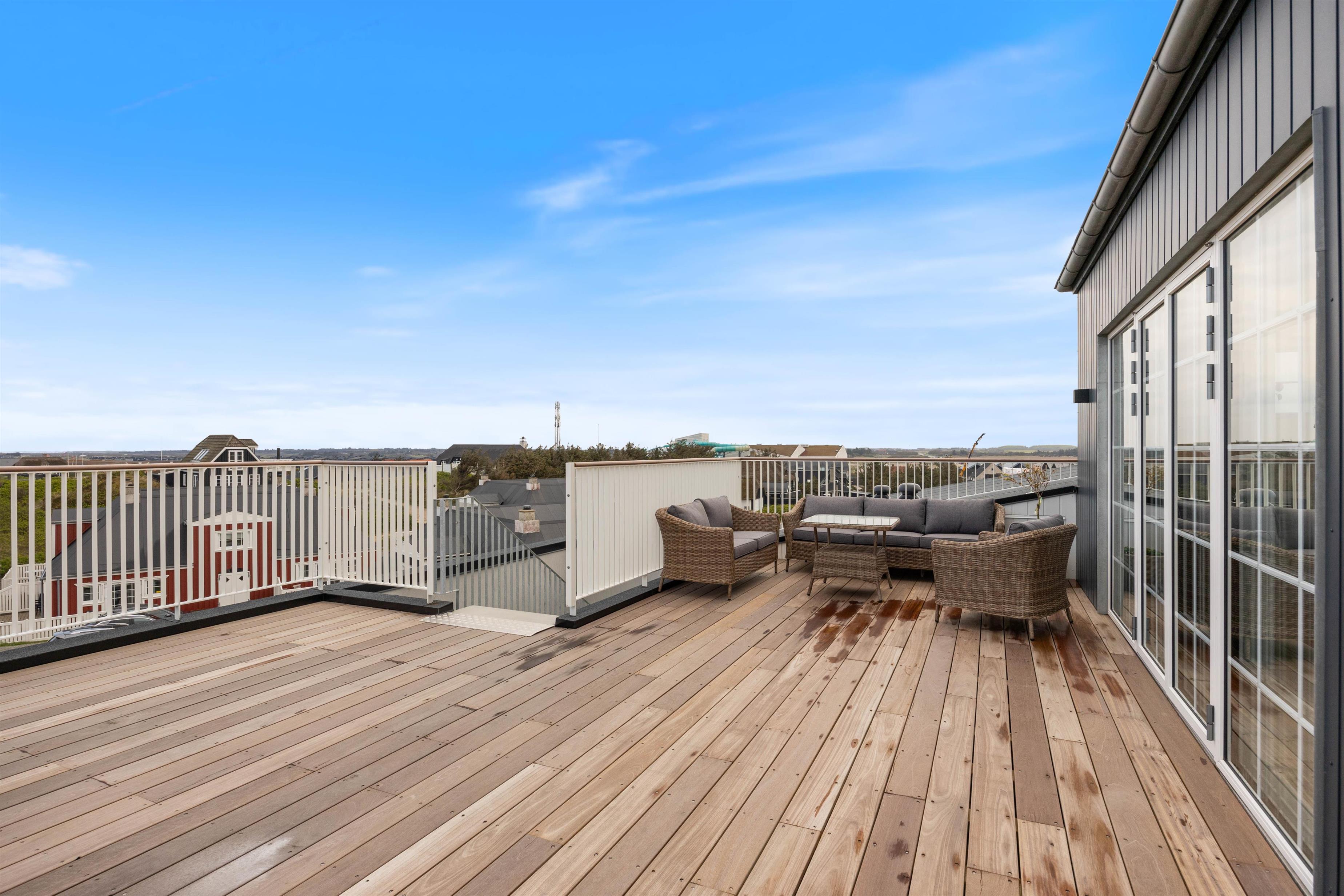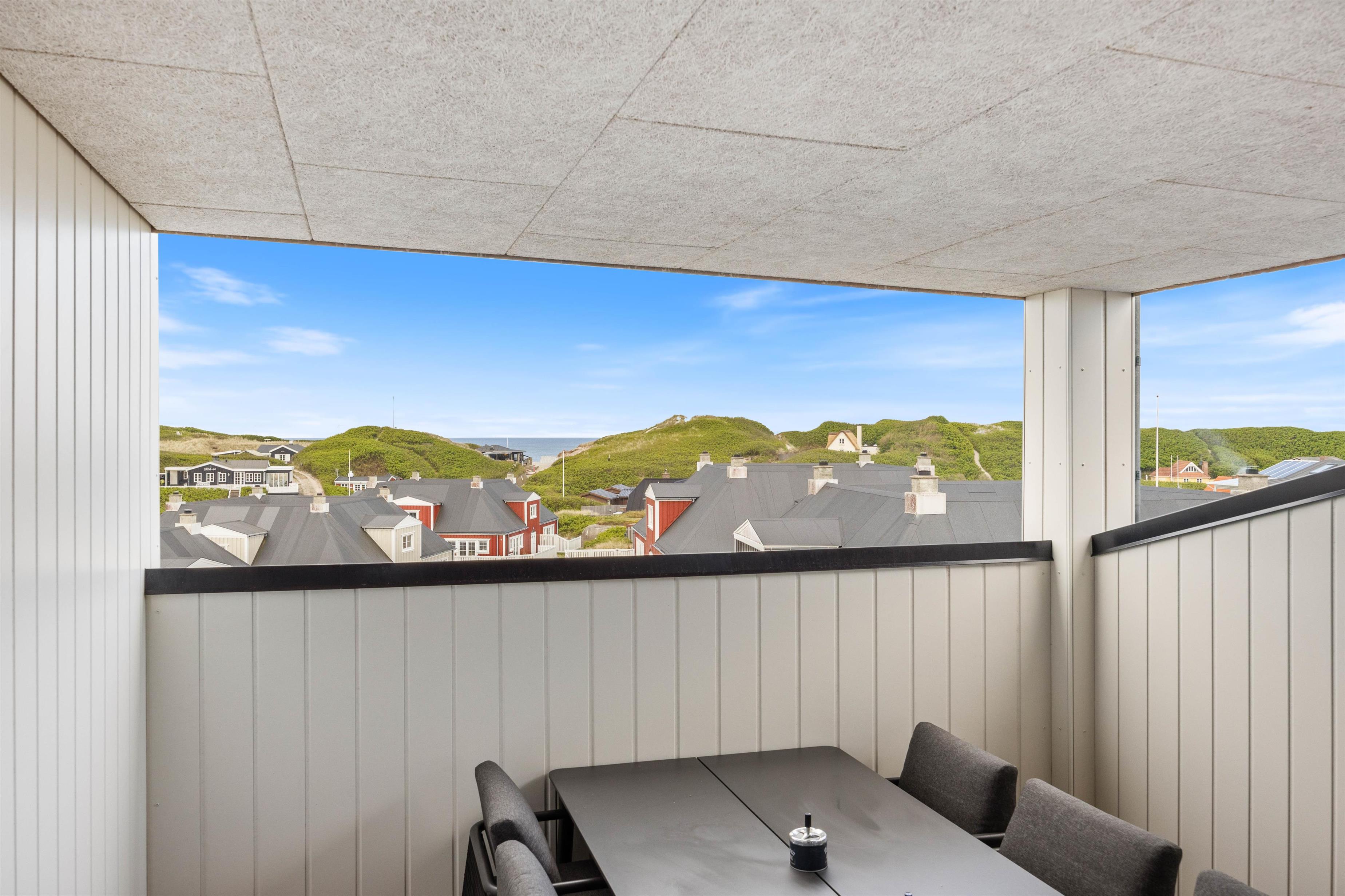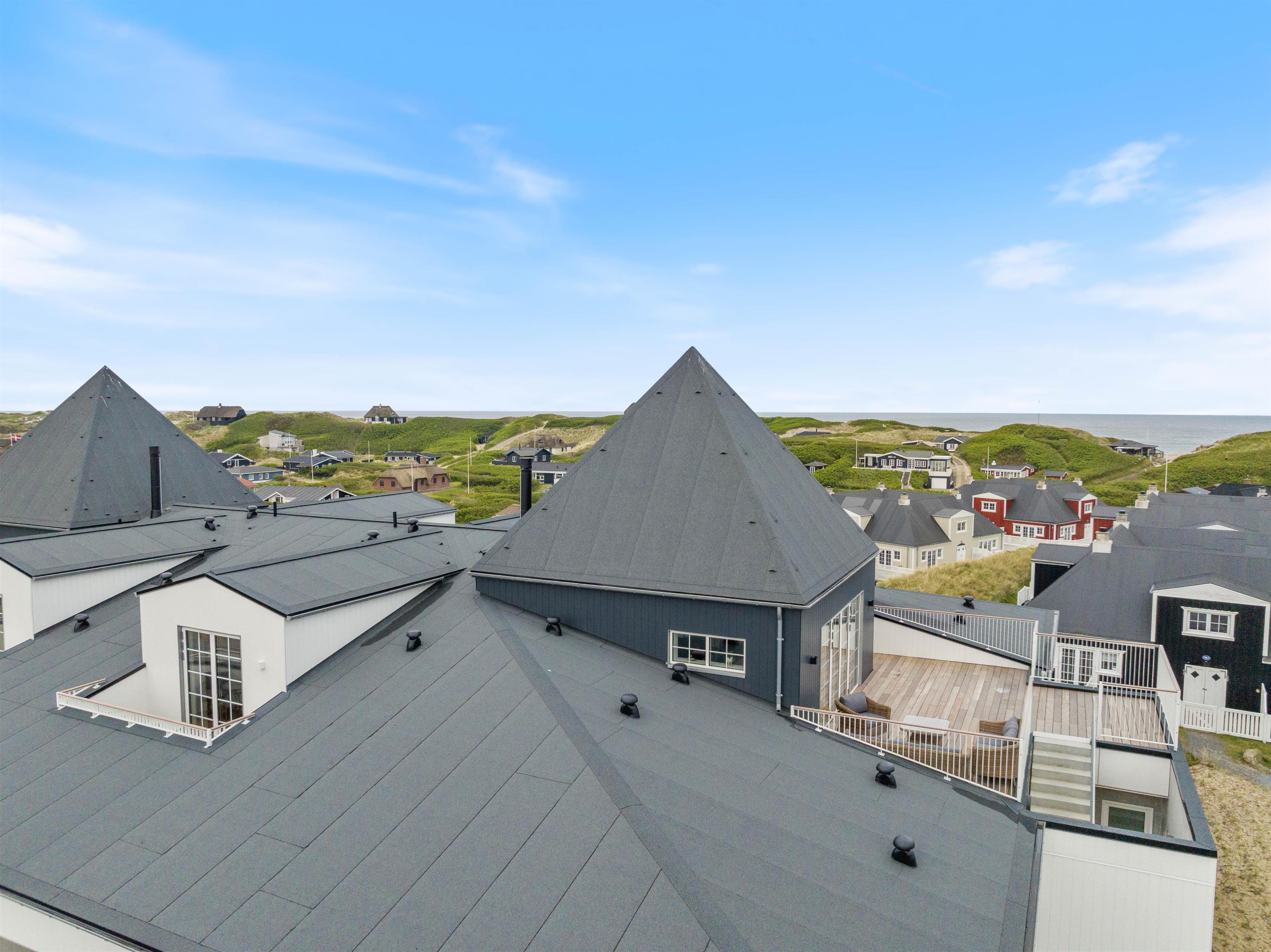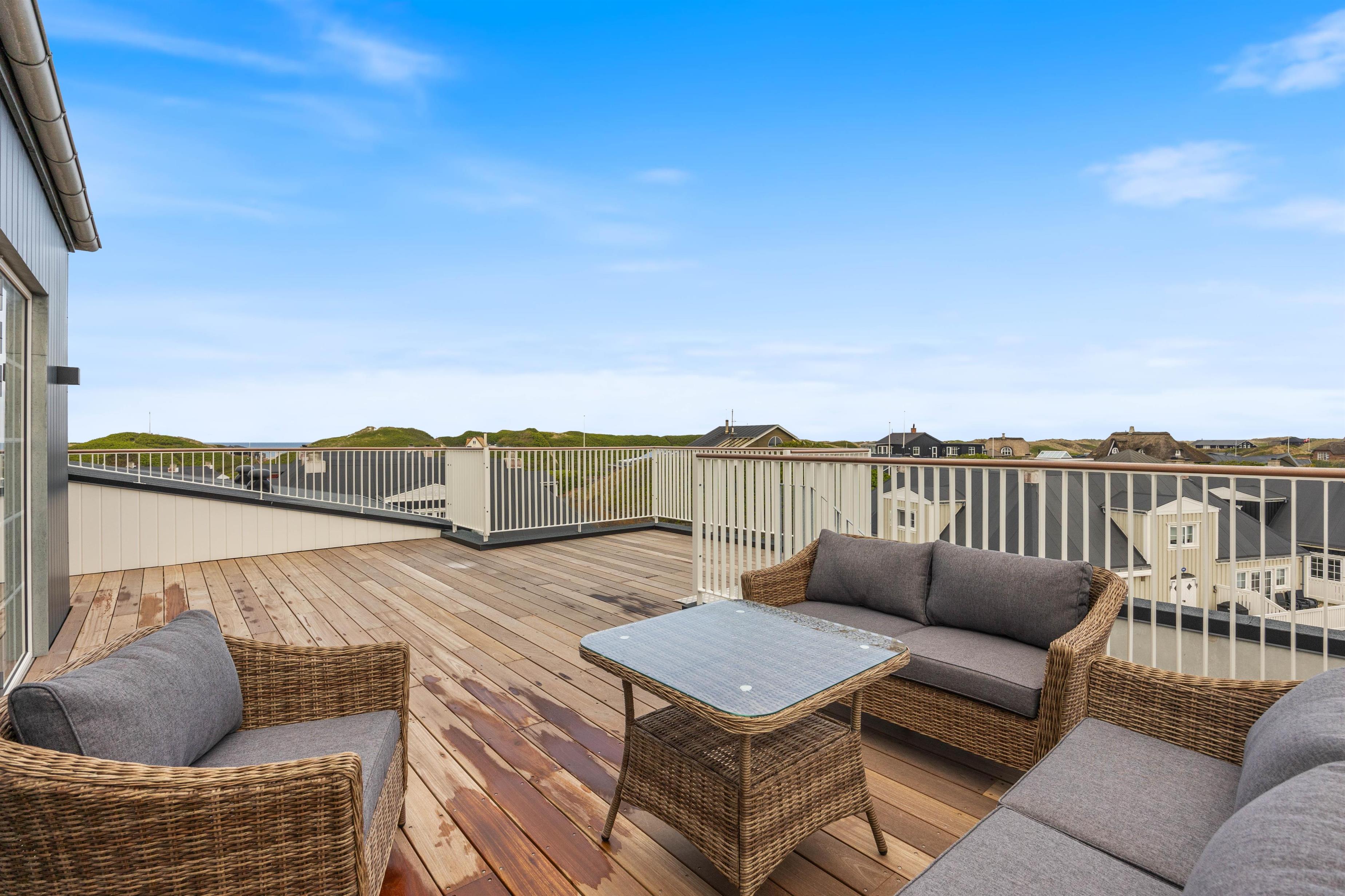 På den afskærmede tagterrasse på 212 m2 kan I hygge jer, selv når vejret ikke viser sig fra sin bedste side. Om I vil nyde et måltid mad, solbade eller tage et spil kort, så kan denne tagterrasse garantere jer de mest fantastiske rammer. Uanset vind og vejr, kan I finde et skønt sted at sidde og samles udendørs, mens I har den mest fantastiske udsigt ud over Vesterhavet og klitlandskabet. I kan bogstaveligt talt smage saltet fra Nordsøen, så tæt er I på vandet. Fra ferielejligheden kan I se både Vesterhavet, Søndervig by samt Ringkøbing Fjord med alle kitesurferne.