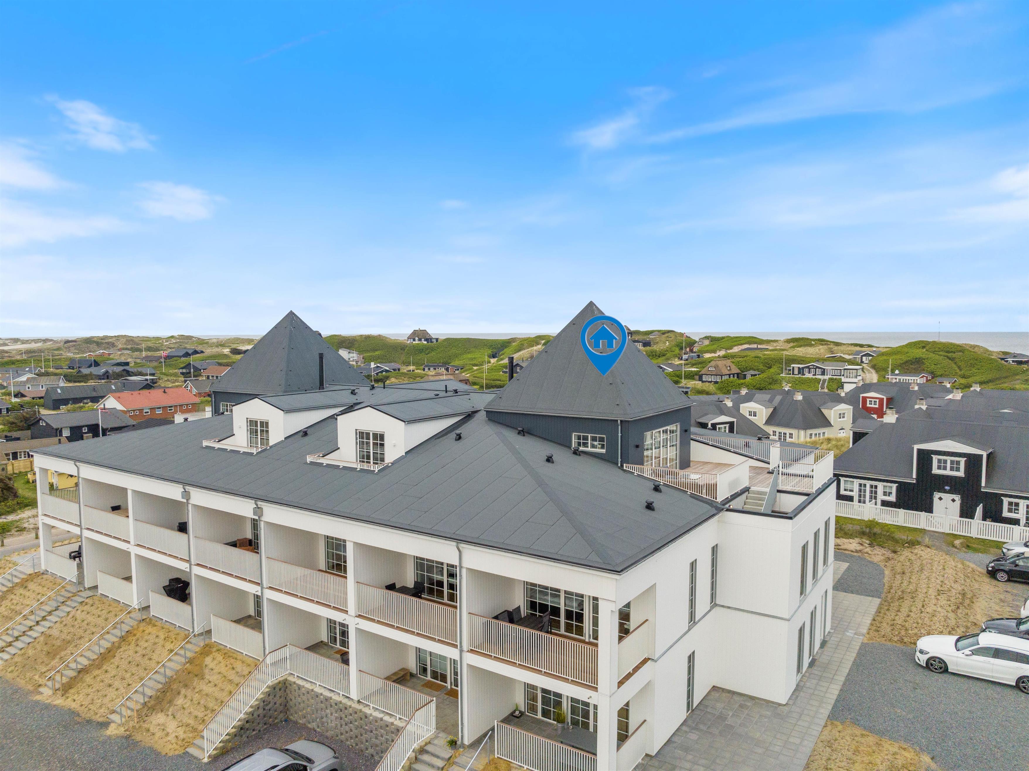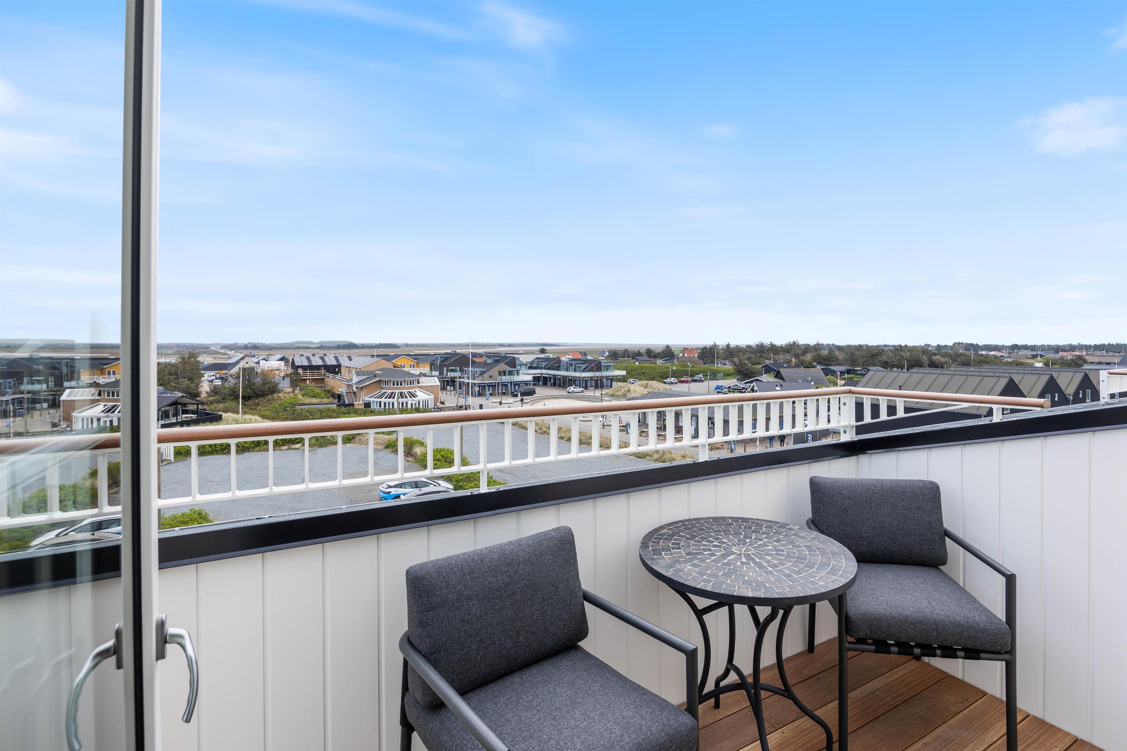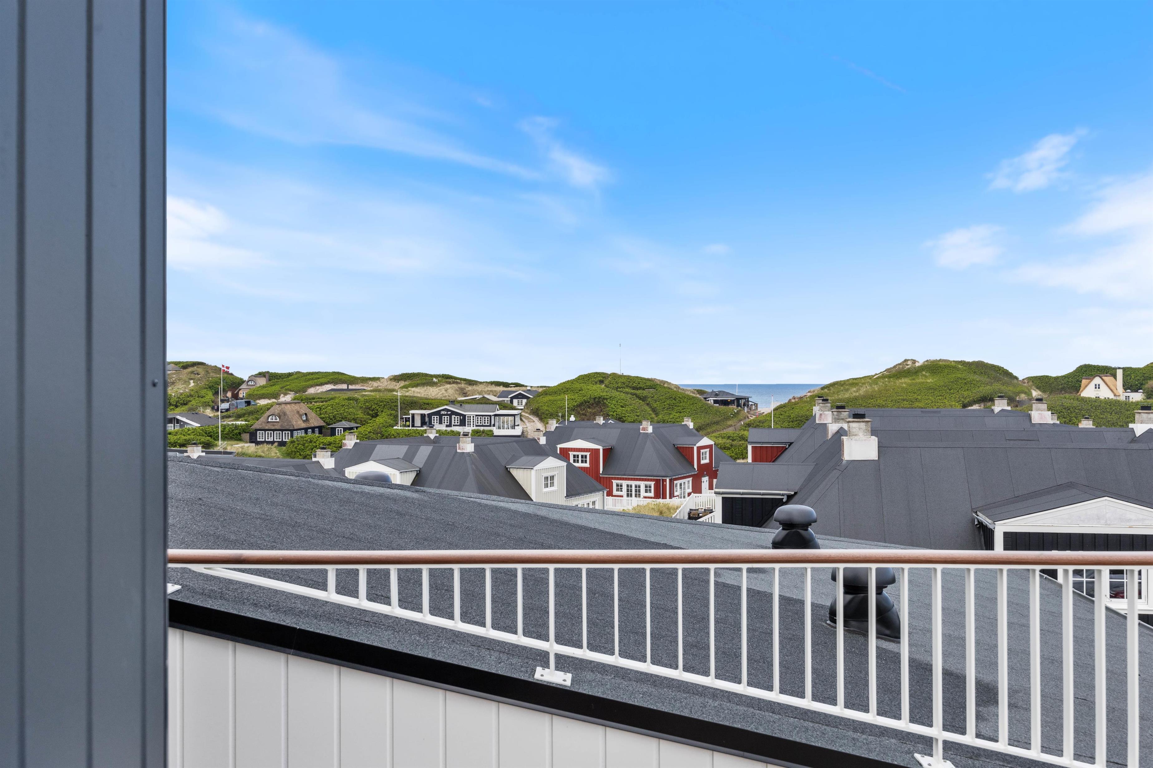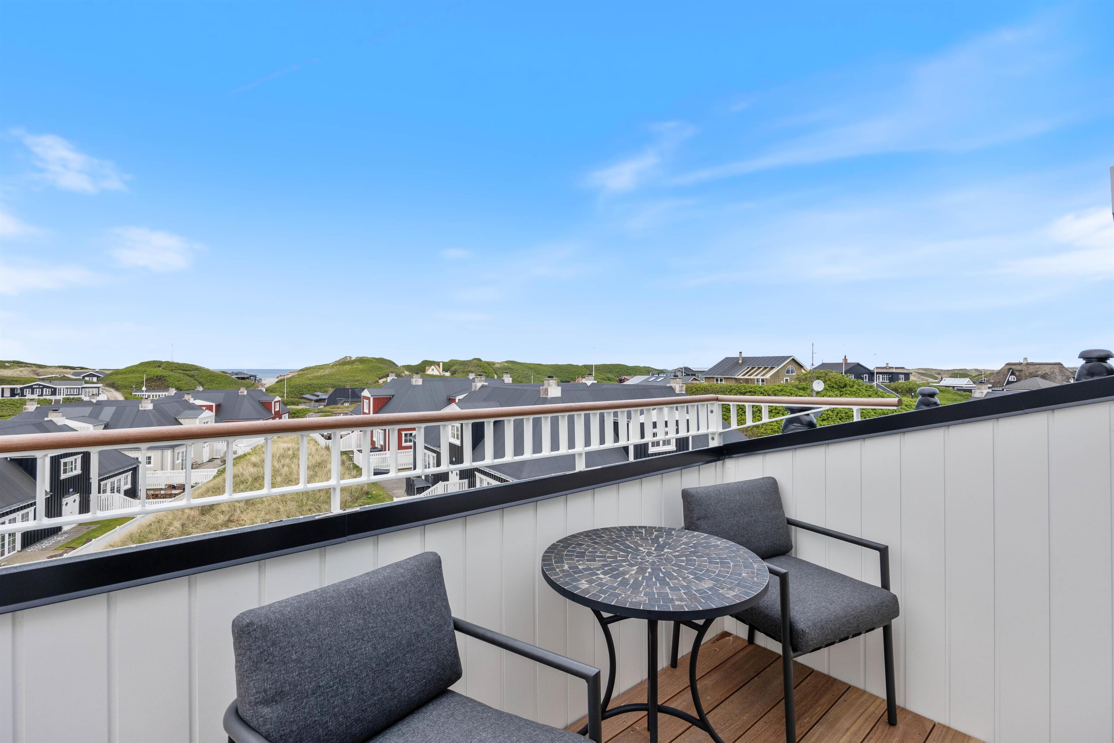 På den afskærmede tagterrasse på 212 m2 kan I hygge jer, selv når vejret ikke viser sig fra sin bedste side. Om I vil nyde et måltid mad, solbade eller tage et spil kort, så kan denne tagterrasse garantere jer de mest fantastiske rammer. Uanset vind og vejr, kan I finde et skønt sted at sidde og samles udendørs, mens I har den mest fantastiske udsigt ud over Vesterhavet og klitlandskabet. I kan bogstaveligt talt smage saltet fra Nordsøen, så tæt er I på vandet. Fra ferielejligheden kan I se både Vesterhavet, Søndervig by samt Ringkøbing Fjord med alle kitesurferne.